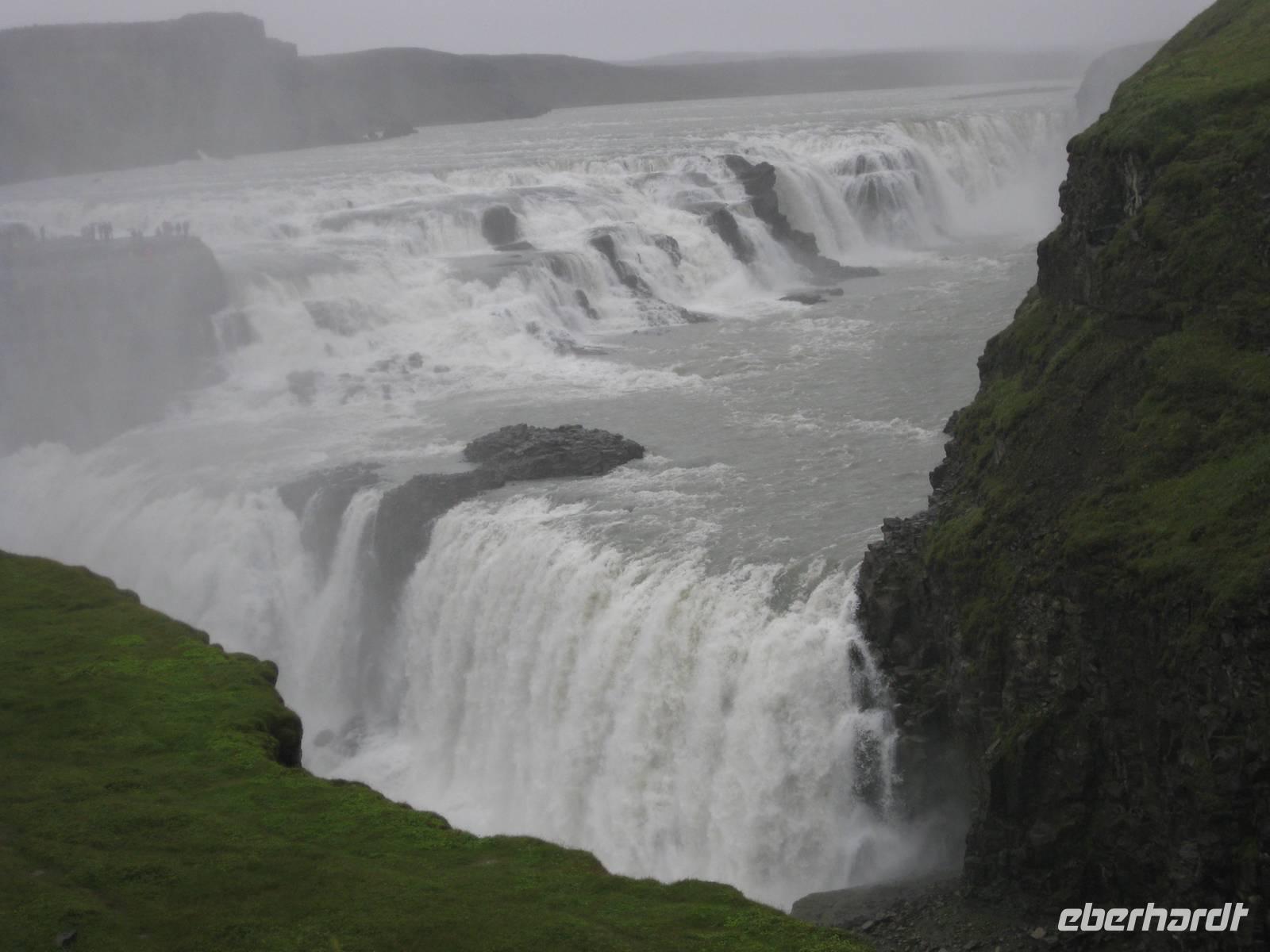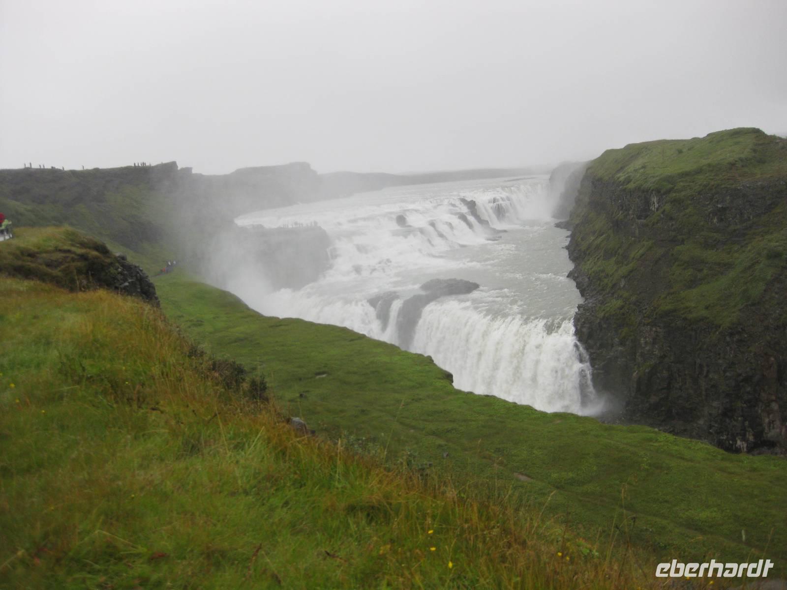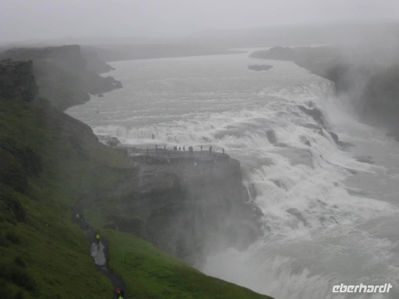 Als erstes Highlight unserer Runde erleben wir den Wasserfall „Gullfoss". Hier haben wir leider Wasser von allen Seiten, denn zusätzlich zur Gischt vom Wasserfall kommt noch das Wasser von oben, es regnet nämlich. Aber das macht uns nichts aus, wir betrachten den „Gullfoss"-Wasserfall aus allen möglichen Perspektiven.