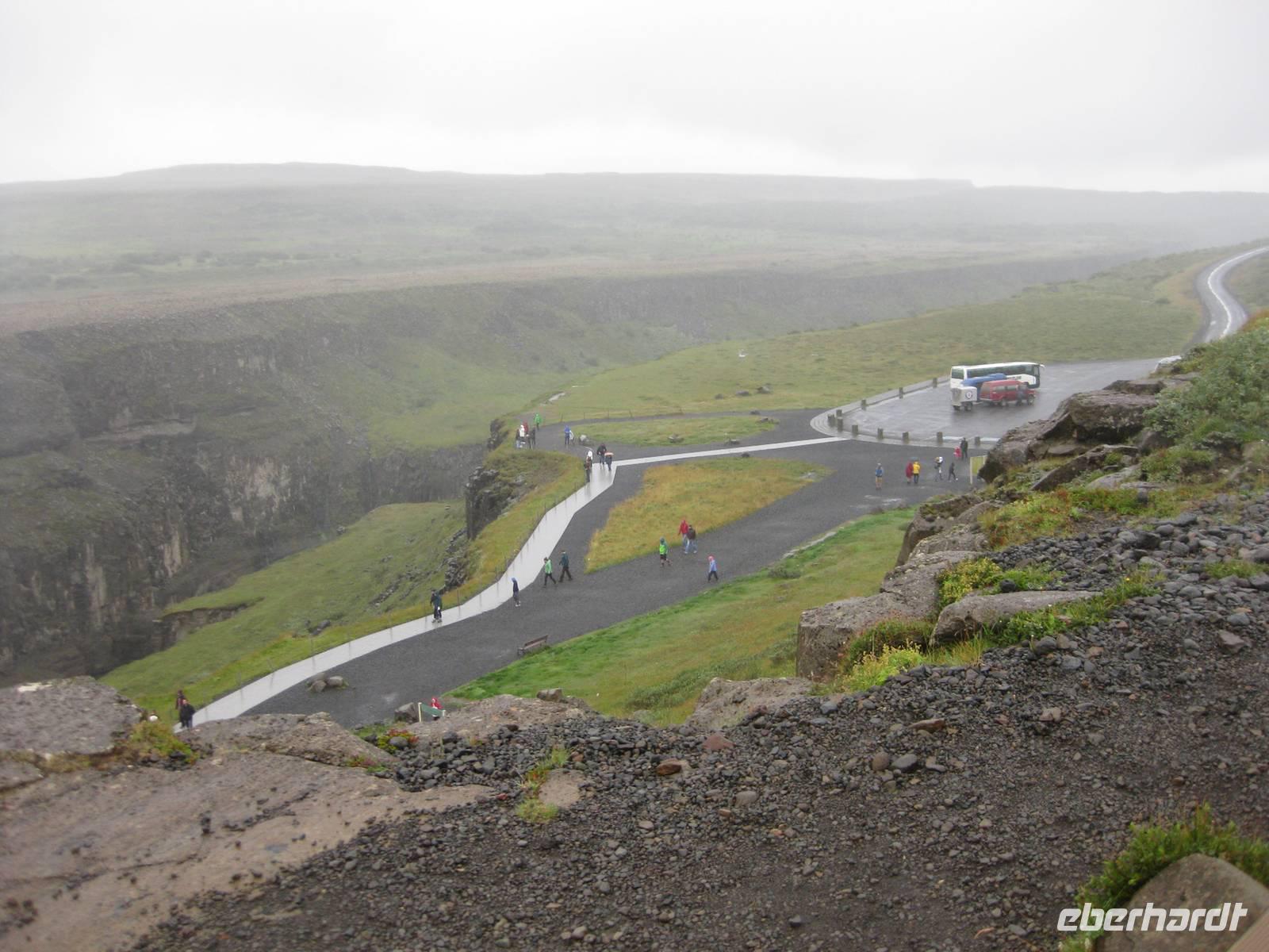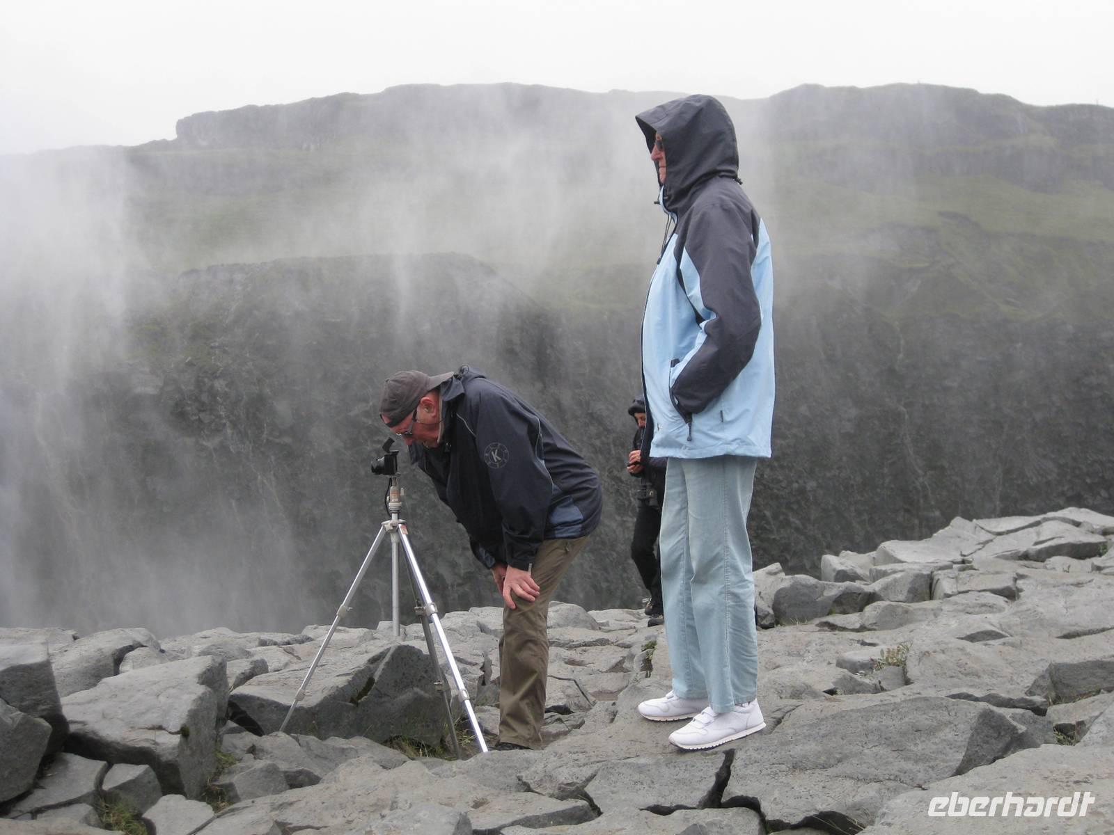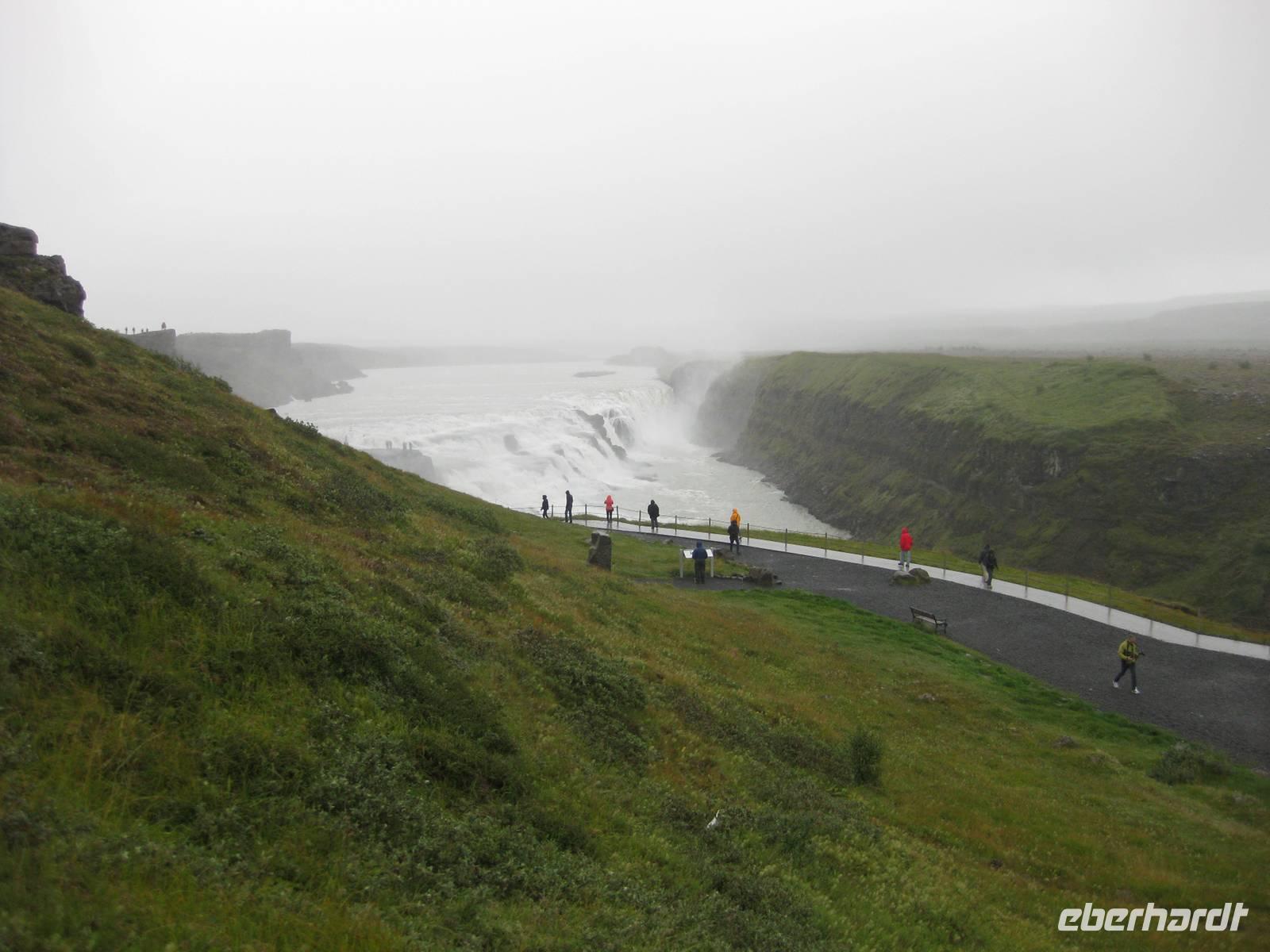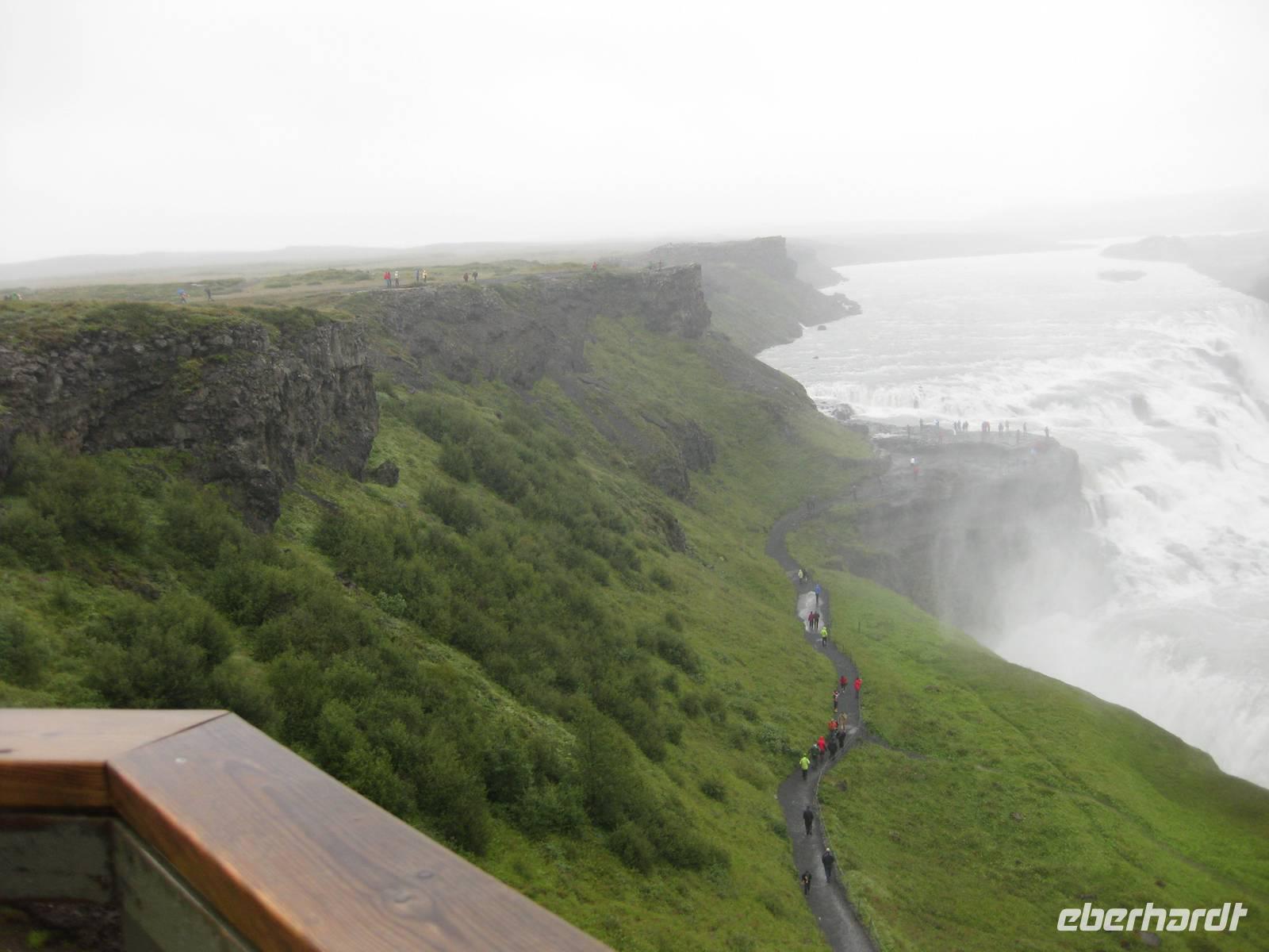 Als erstes Highlight unserer Runde erleben wir den Wasserfall „Gullfoss". Hier haben wir leider Wasser von allen Seiten, denn zusätzlich zur Gischt vom Wasserfall kommt noch das Wasser von oben, es regnet nämlich. Aber das macht uns nichts aus, wir betrachten den „Gullfoss"-Wasserfall aus allen möglichen Perspektiven.