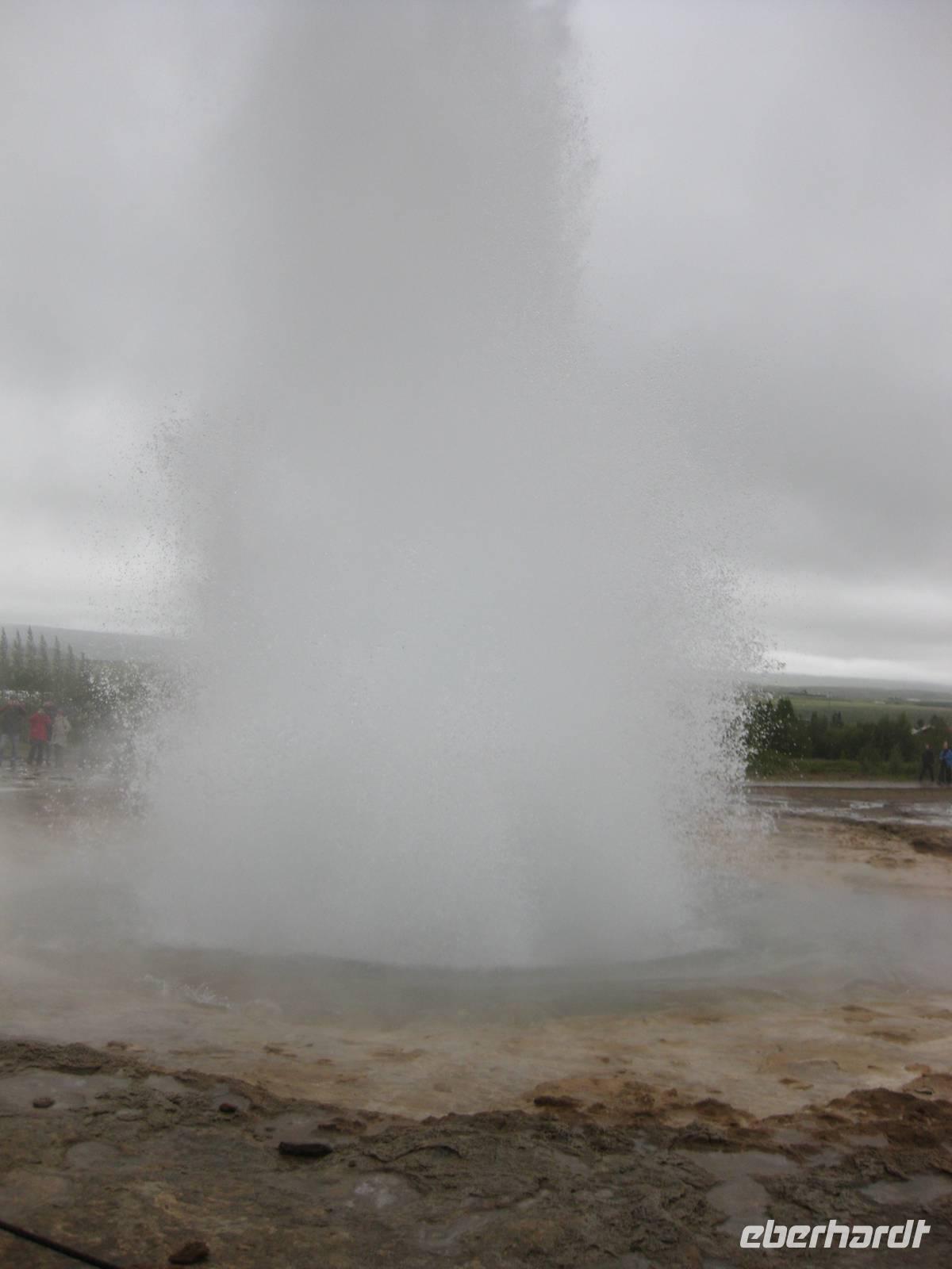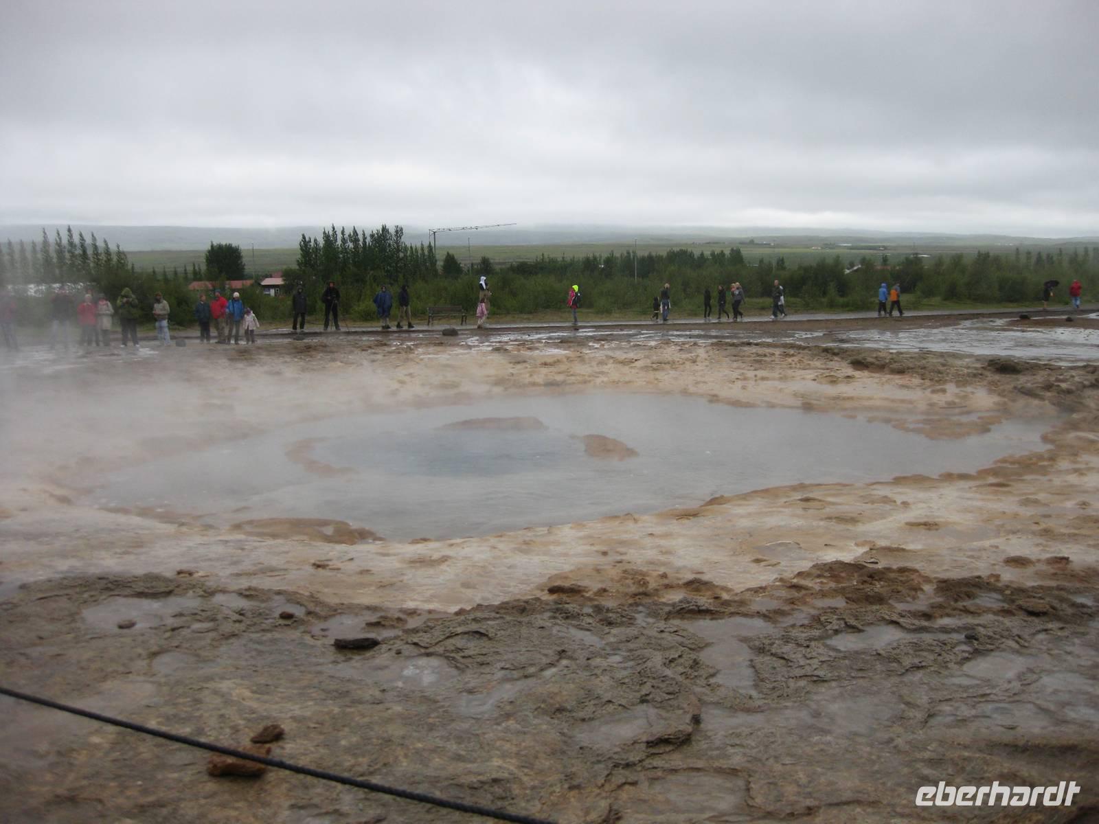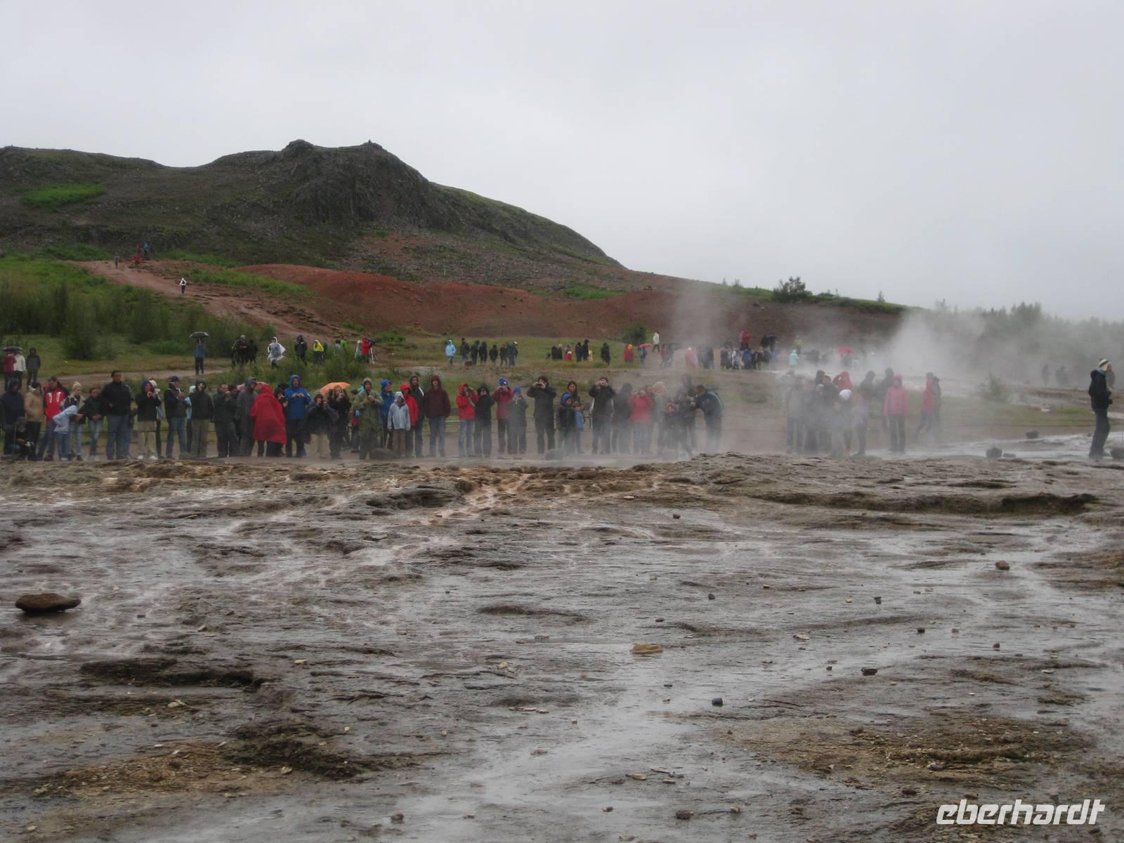 Dann geht es zum nur wenige Meter entfernten Hochtemperaturgebiet Haukadalur, wo die Geysire, d. h. eigentlich nur noch ein Geysir, „Strokkur" sein kochend heißes Wasser als Fontäne bis zu 20 Meter nach oben in die Luft sprüht. Alle stehen mit den startbereiten Kameras da und warten gespannt auf die Fontäne. Aller paar Minuten wiederholt sich das Schauspiel. Nachdem wir uns satt gesehen haben und die Fotos im Kasten haben, fahren wir weiter zum nächsten Highlight im Goldenen Kreis, nach Thingvellir.