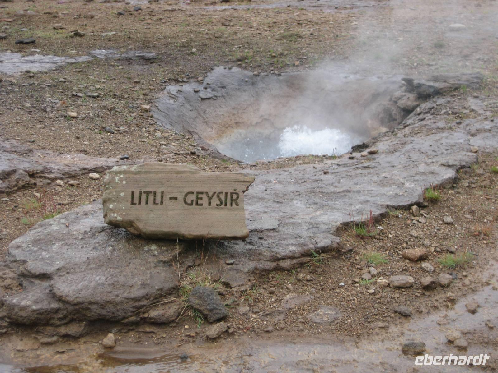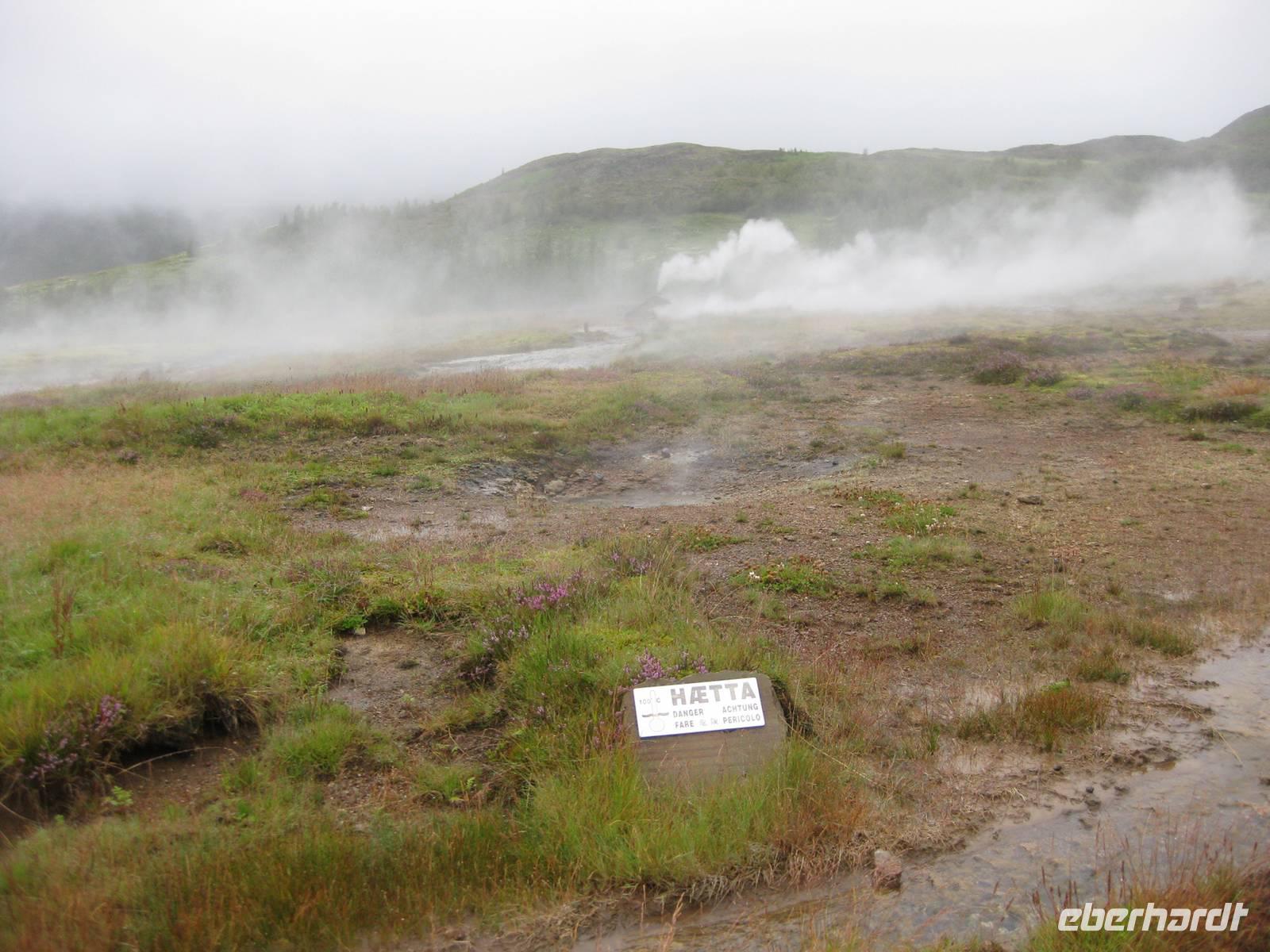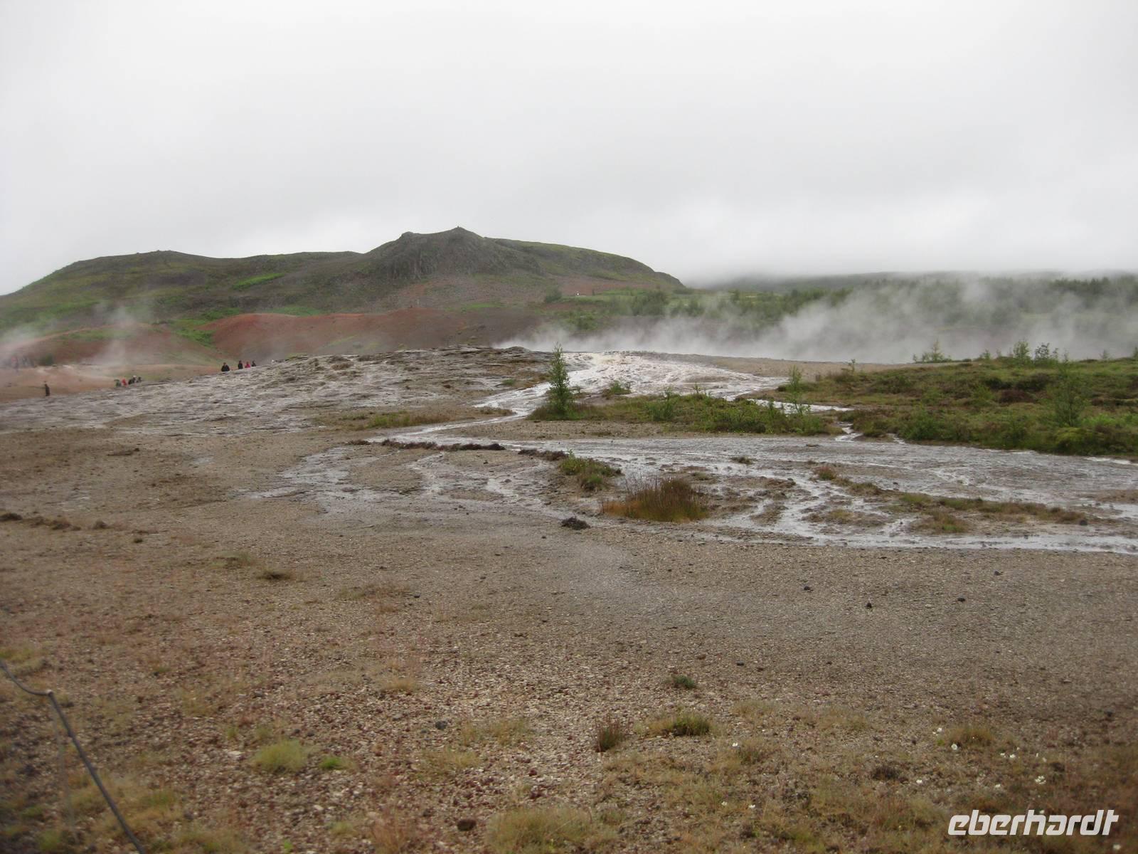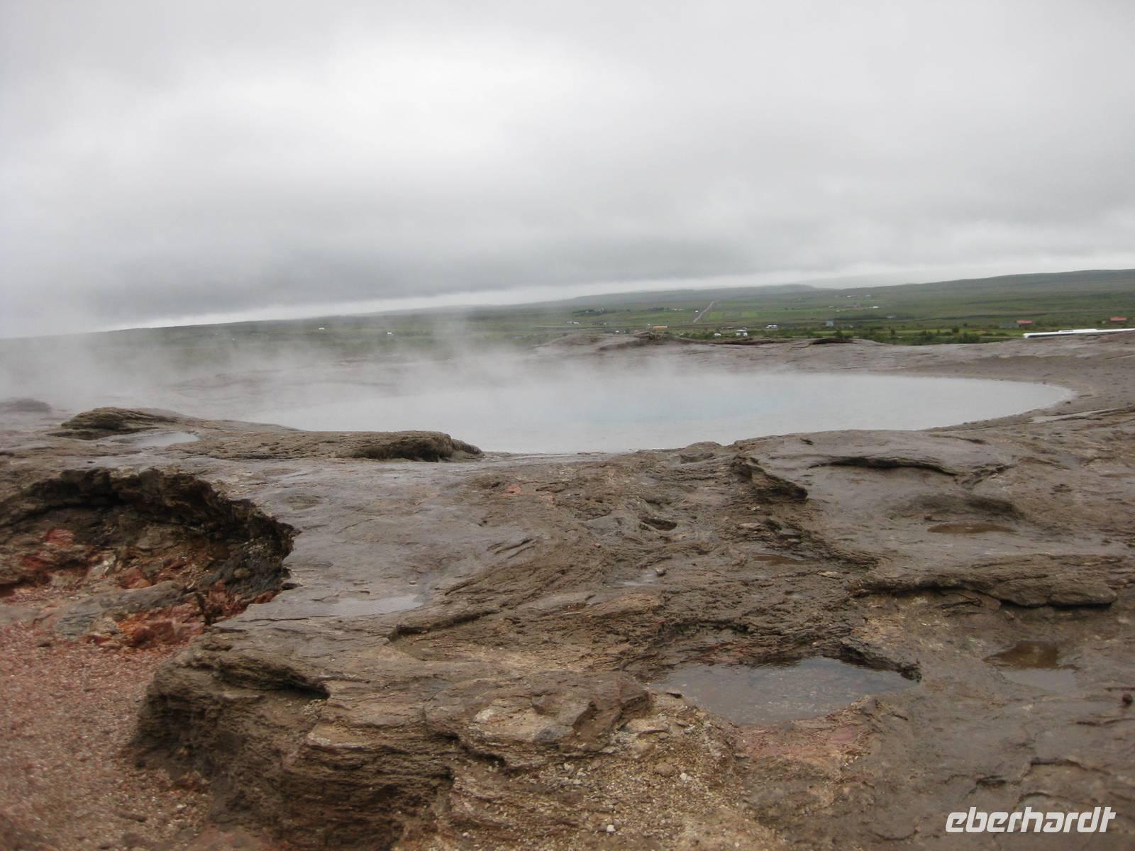 Dann geht es zum nur wenige Meter entfernten Hochtemperaturgebiet Haukadalur, wo die Geysire, d. h. eigentlich nur noch ein Geysir, „Strokkur" sein kochend heißes Wasser als Fontäne bis zu 20 Meter nach oben in die Luft sprüht. Alle stehen mit den startbereiten Kameras da und warten gespannt auf die Fontäne. Aller paar Minuten wiederholt sich das Schauspiel. Nachdem wir uns satt gesehen haben und die Fotos im Kasten haben, fahren wir weiter zum nächsten Highlight im Goldenen Kreis, nach Thingvellir.