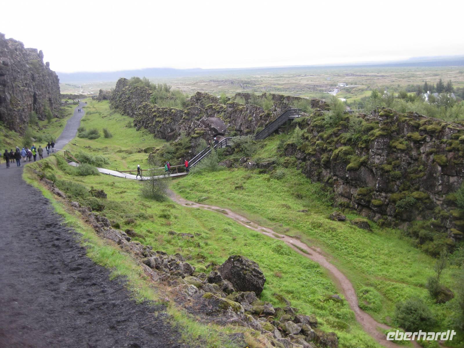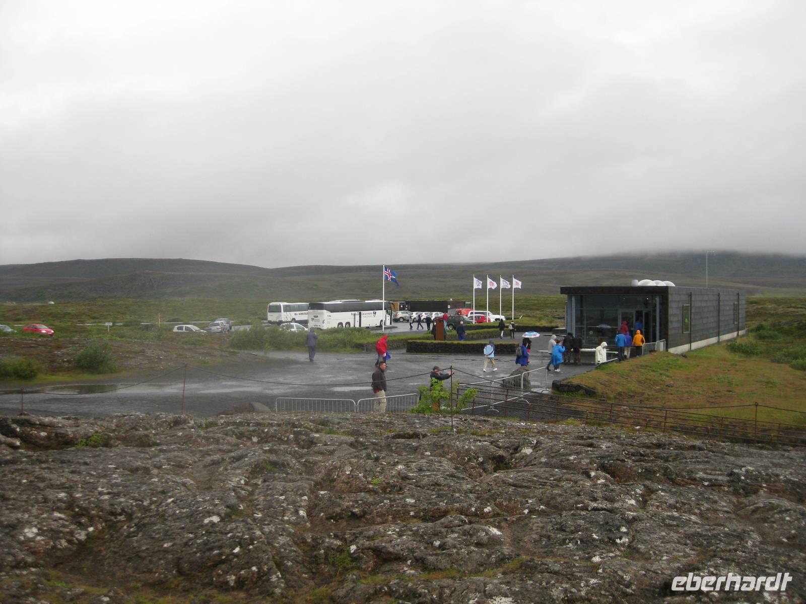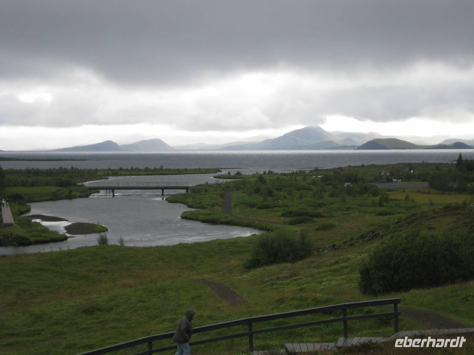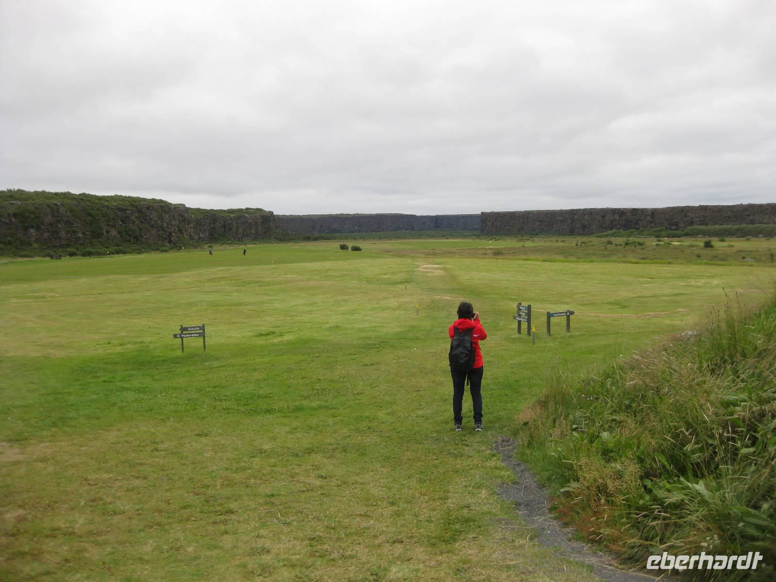 Der Nationalpark Thingvellir ist geologisch und auch historisch von Bedeutung. Mitten durch den Nationalpark verläuft die geotektonische Grenze zwischen Europa und Amerika. Theoretisch könnte man mit einem Bein in Europa stehen und mit dem anderen in Amerika. Aber im Laufe der Jahre ist diese Grenze schon einige Kilometer weit auseinander gerückt. Und historisch ist dieser Ort ebenfalls von sehr großer Bedeutung, wurde doch hier im Jahre 930 das erste demokratische Parlament der Welt ausgerufen. Auf diesem Platz können wir stehen und Rosa, unsere isländische Reiseleiterin erzählt uns sehr anschaulich von den Ereignissen der damaligen Zeit. Vom Aussichtspunkt Hakid, oberhalb des historischen Parlamentsplatzes haben wir einen fantastischen Blick über den Nationalpark Thingvellir.