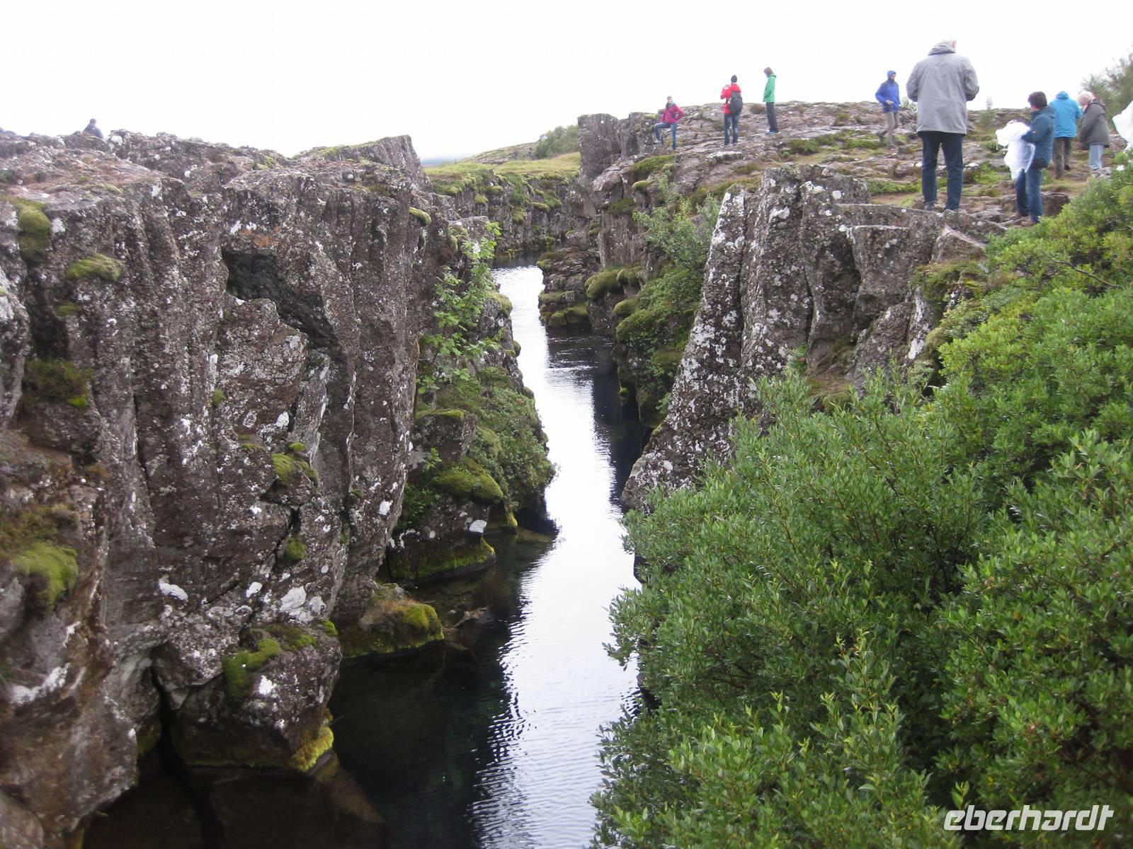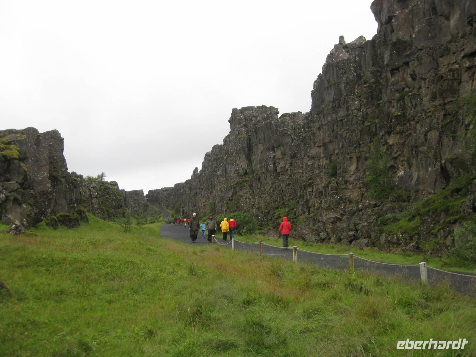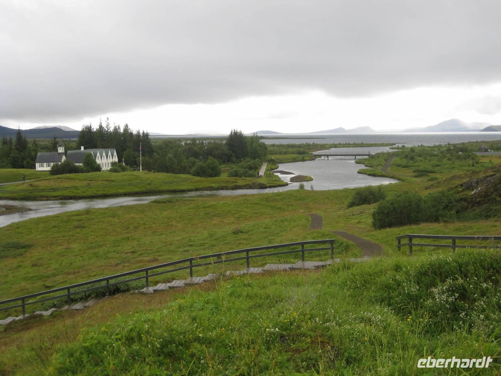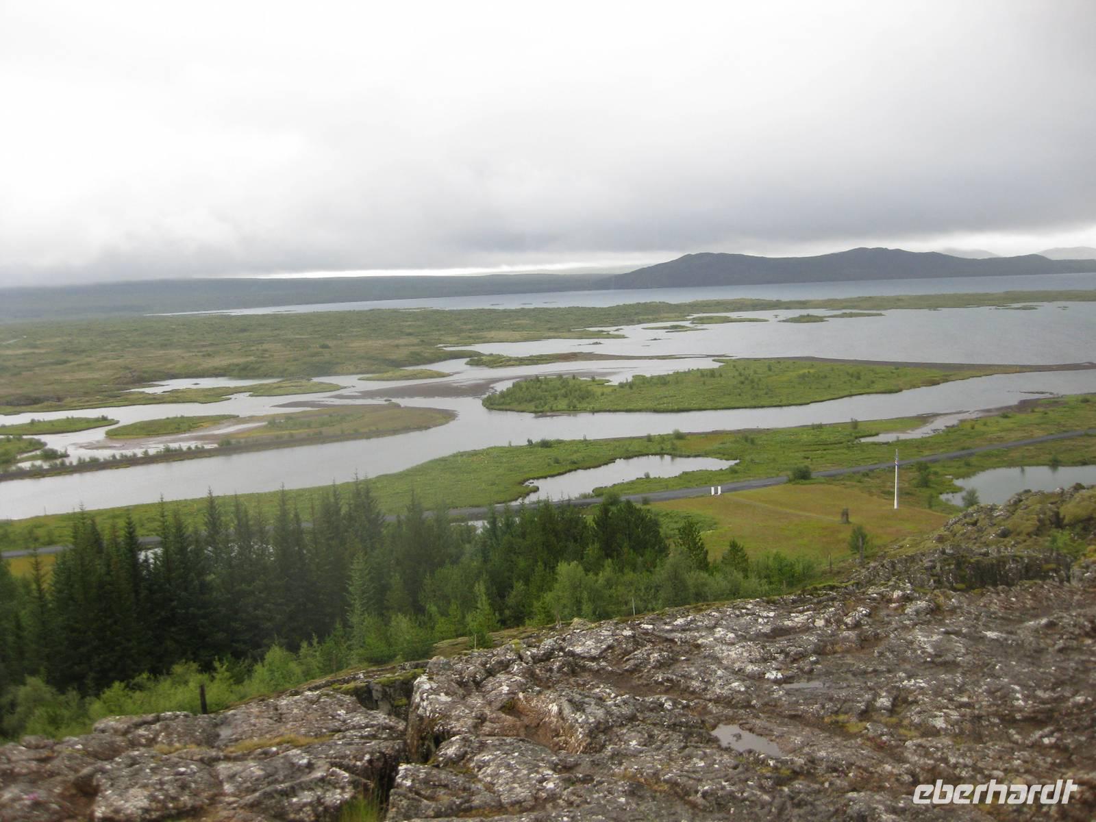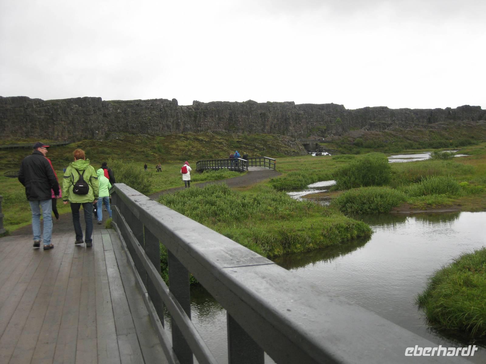 Der Nationalpark Thingvellir ist geologisch und auch historisch von Bedeutung. Mitten durch den Nationalpark verläuft die geotektonische Grenze zwischen Europa und Amerika. Theoretisch könnte man mit einem Bein in Europa stehen und mit dem anderen in Amerika. Aber im Laufe der Jahre ist diese Grenze schon einige Kilometer weit auseinander gerückt. Und historisch ist dieser Ort ebenfalls von sehr großer Bedeutung, wurde doch hier im Jahre 930 das erste demokratische Parlament der Welt ausgerufen. Auf diesem Platz können wir stehen und Rosa, unsere isländische Reiseleiterin erzählt uns sehr anschaulich von den Ereignissen der damaligen Zeit. Vom Aussichtspunkt Hakid, oberhalb des historischen Parlamentsplatzes haben wir einen fantastischen Blick über den Nationalpark Thingvellir.