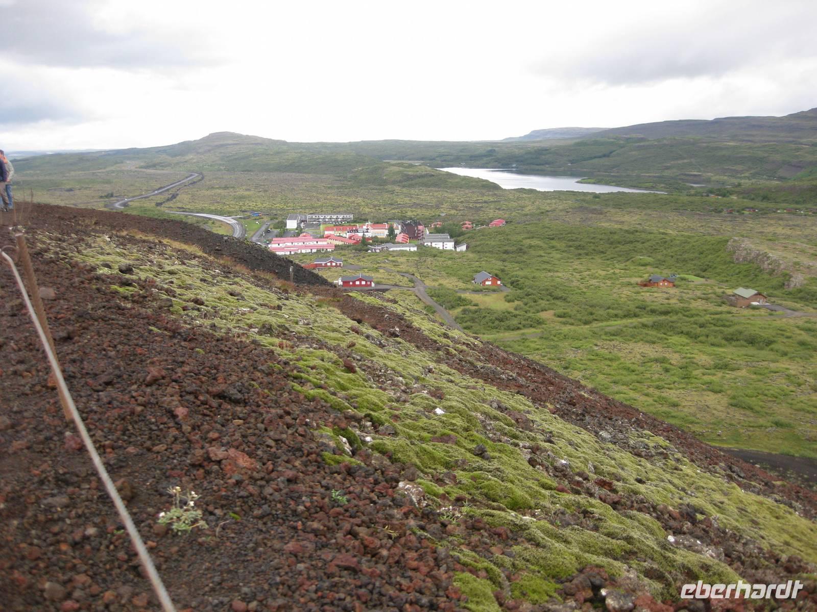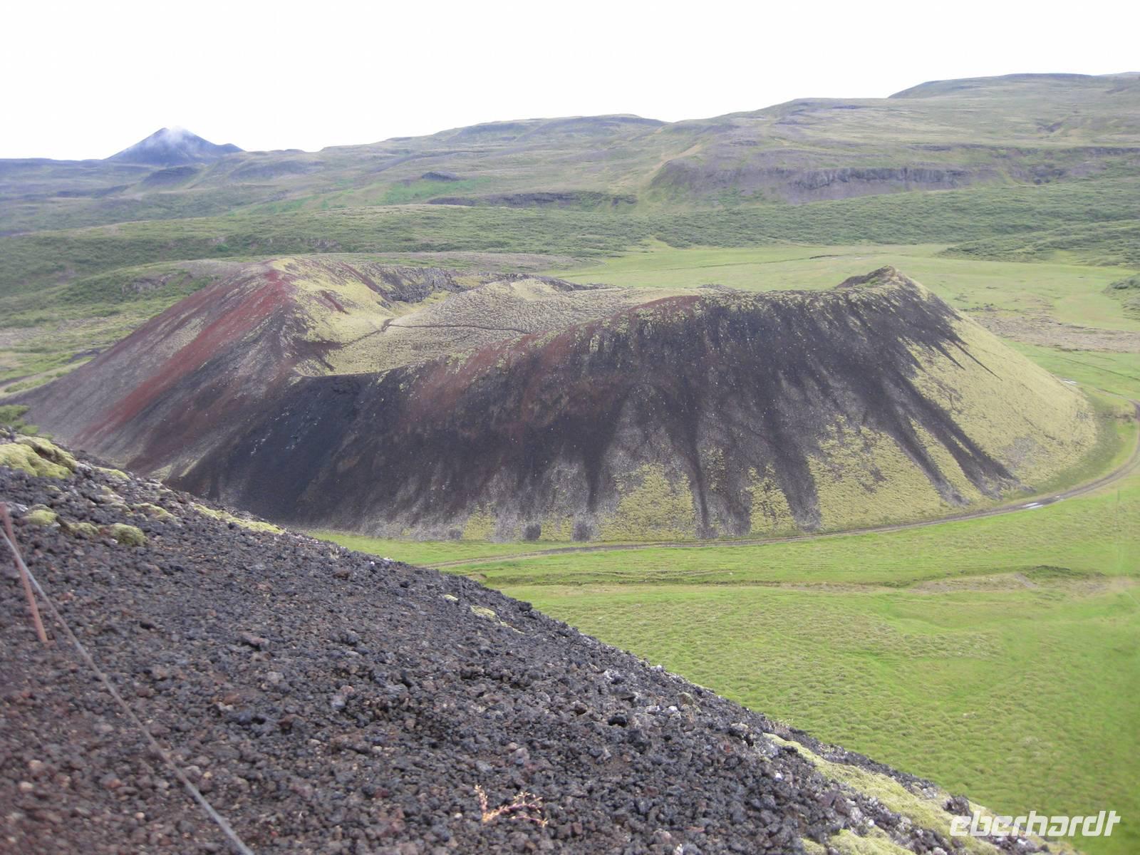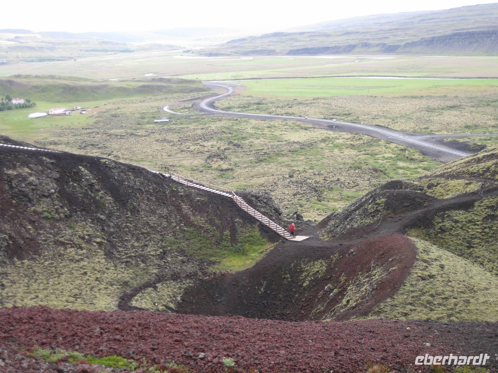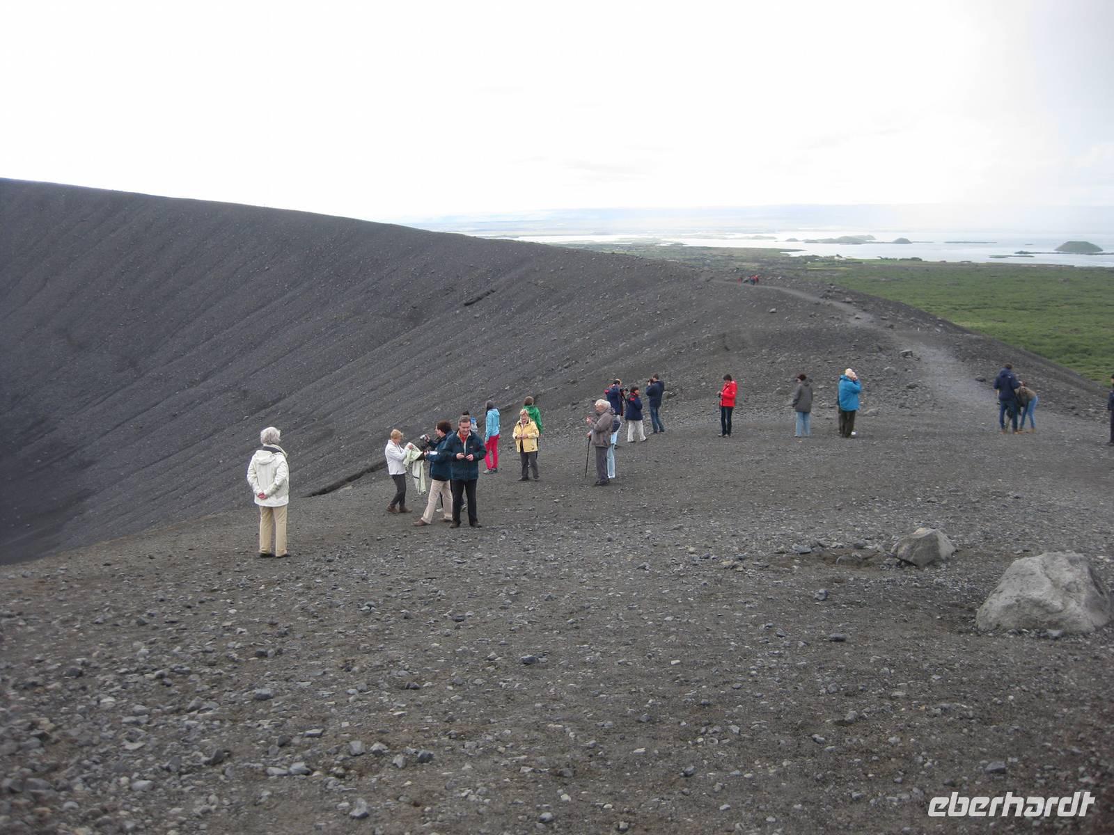 Gar nicht weit von Borgarnes entfernt befindet sich unmittelbar an der Straße 1 der vor 3000 Jahren erloschene Krater „Grabrok", den man ganz bequem besteigen, einen Blick in den Krater und auch in die Umgebung werfen kann. Alle Gäste krabbeln nach oben und genießen den Ausblick.