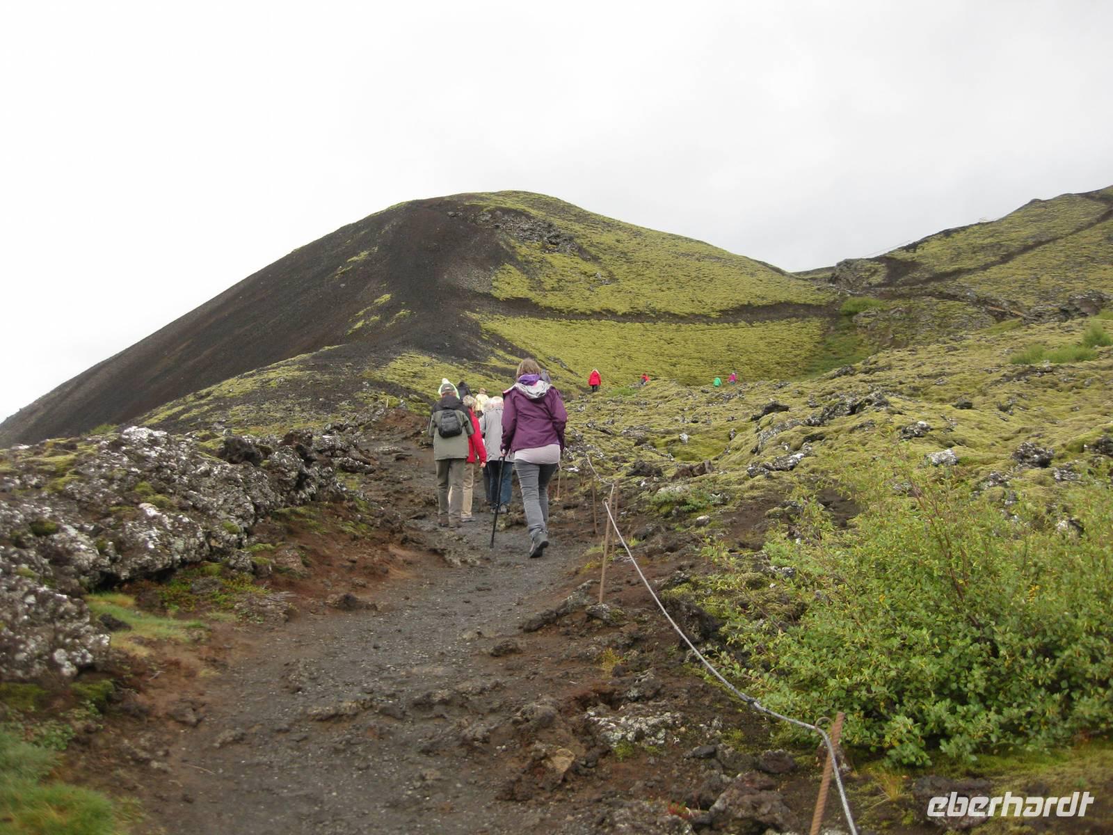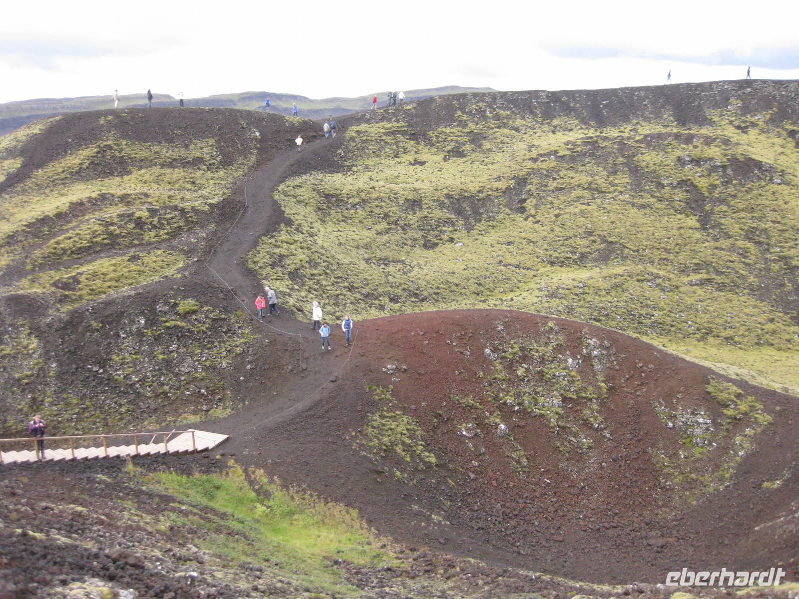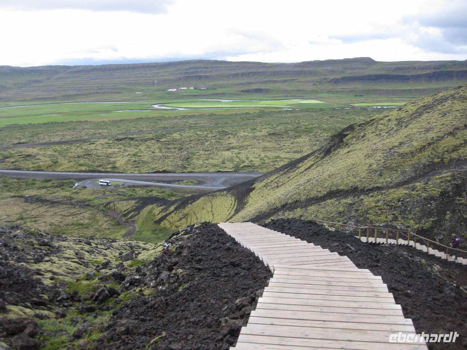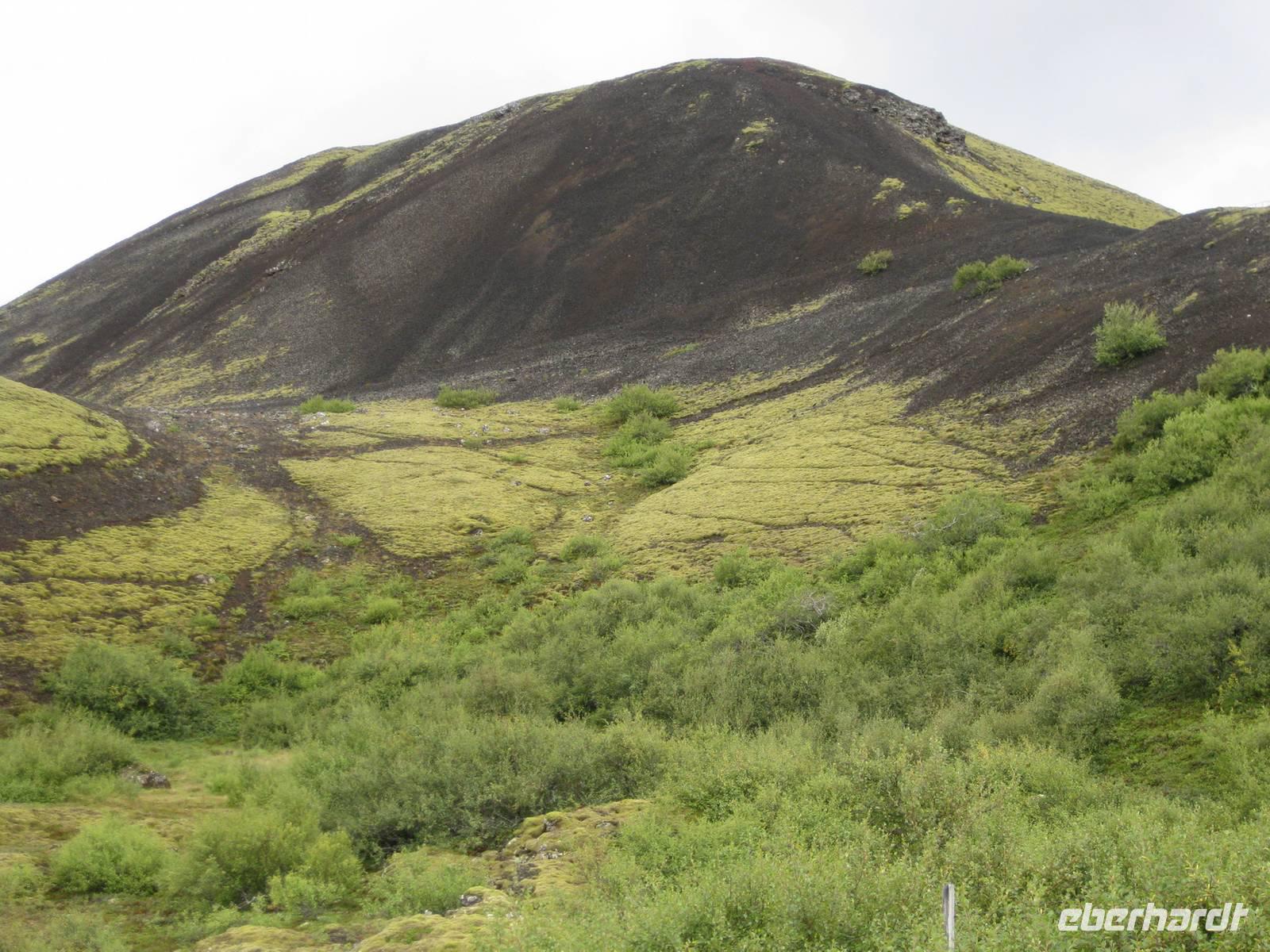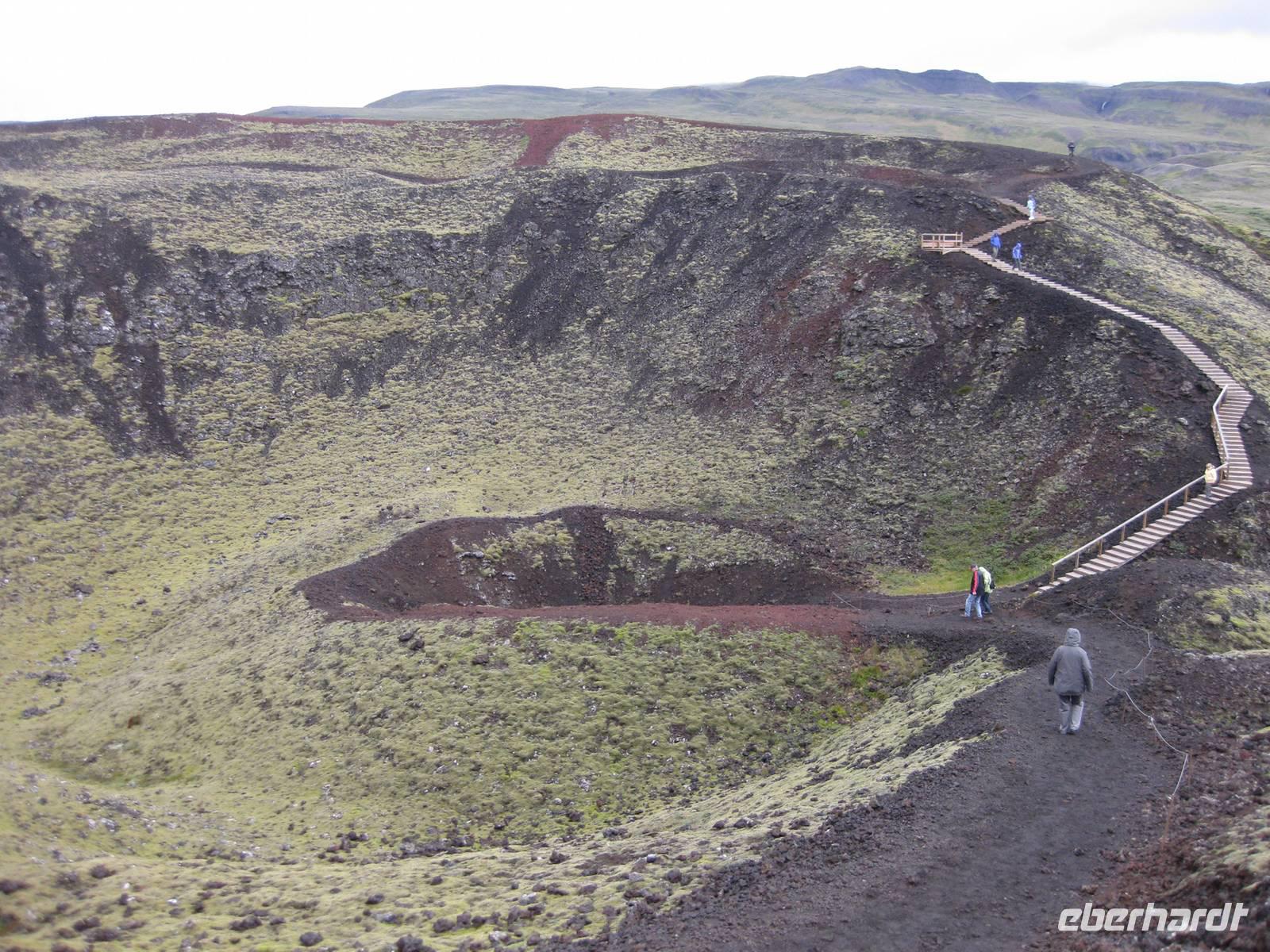 Gar nicht weit von Borgarnes entfernt befindet sich unmittelbar an der Straße 1 der vor 3000 Jahren erloschene Krater „Grabrok", den man ganz bequem besteigen, einen Blick in den Krater und auch in die Umgebung werfen kann. Alle Gäste krabbeln nach oben und genießen den Ausblick.