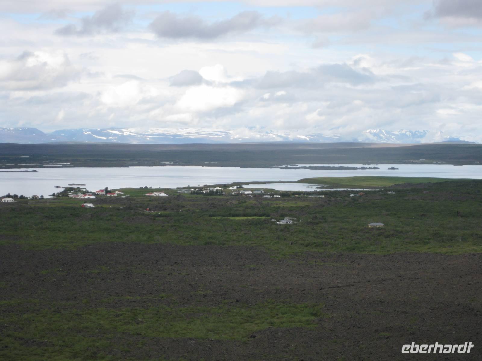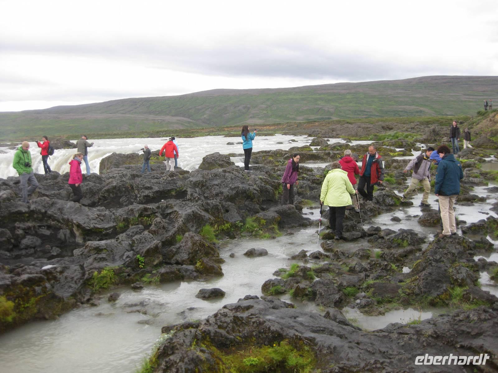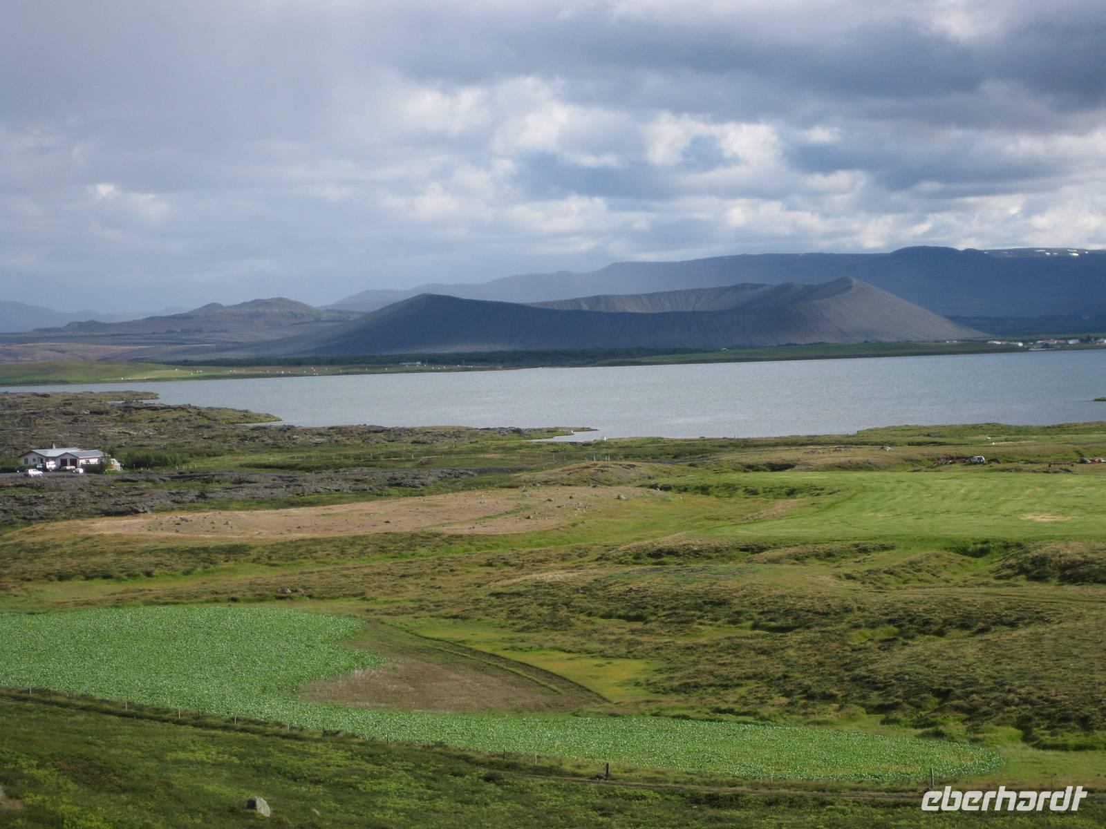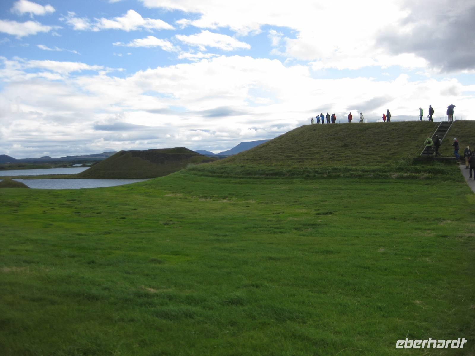 Wir fahren auf die andere Seite des Eyjafjördur und bestauenen Akureyji von dieser Seite aus. Weiter geht die Fahrt den Fjord entlang und bald biegen wir nach rechts ab. Wir fahren am „Lichtsee" vorbei bis zum Godafoss (Götterwasserfall). Hier machen wir halt und laufen zum Wasserfall. Mit großem Getöse stürzen die Wassermassen hinab. Wir betrachten den Wasserfall von allen Seiten. Ein Stück weiter flussabwärts steigen wir dann wieder in unseren Bus und fahren weiter zum Myvatn-Gebiet. Unsere Fahrt geht am „Laxa", einem der besten Lachsflüsse Islands entlang bis nach Skutustadir, wo wir eine kleine Wanderung zu den Pseudokratern machen und einen wunderbaren Rundblick über das Myvatn-Gebiet genießen. Eine einzigartige Landschaft eröffnet sich vor uns. Man könnte denken, man ist in einer anderen Welt.