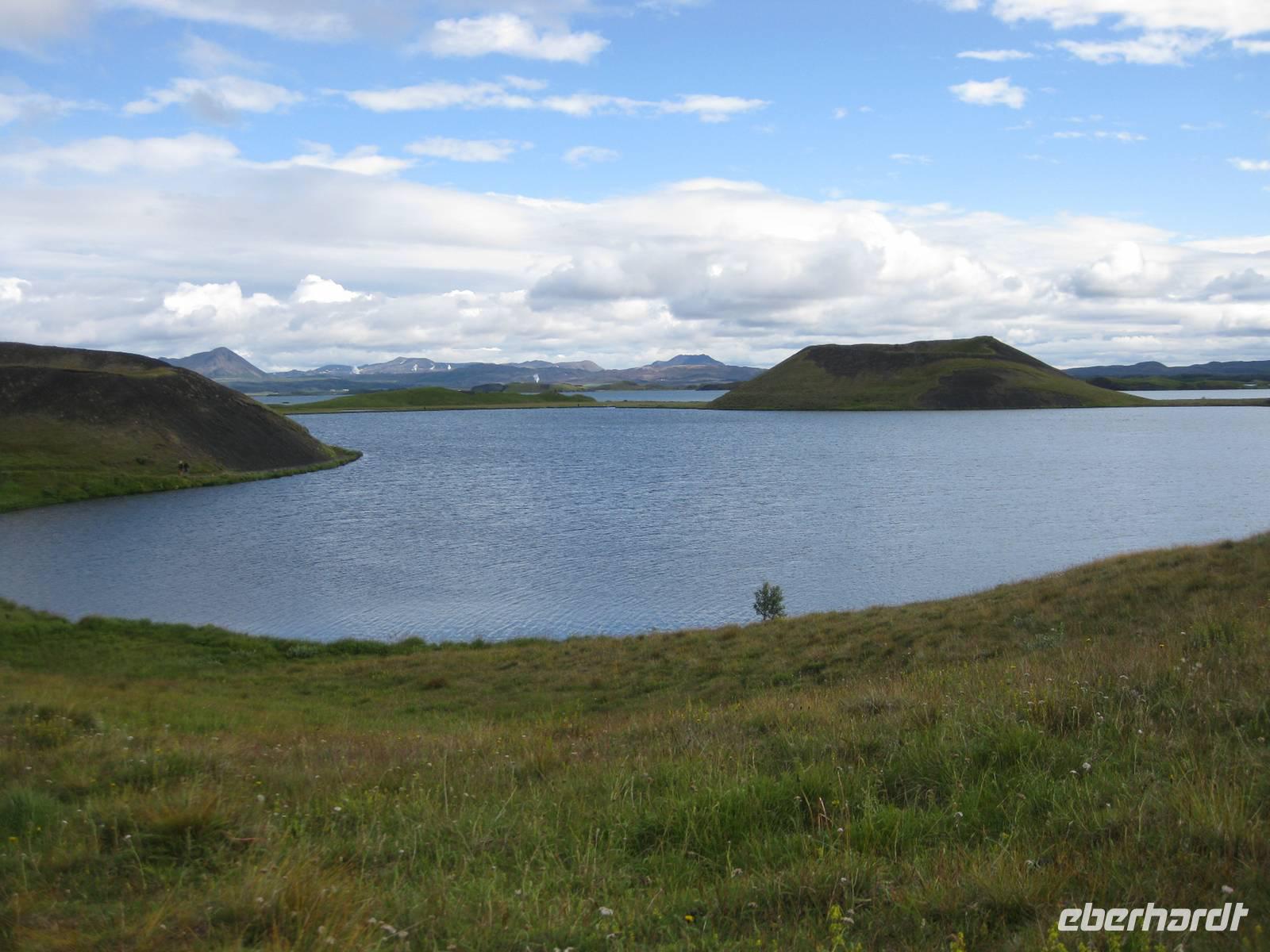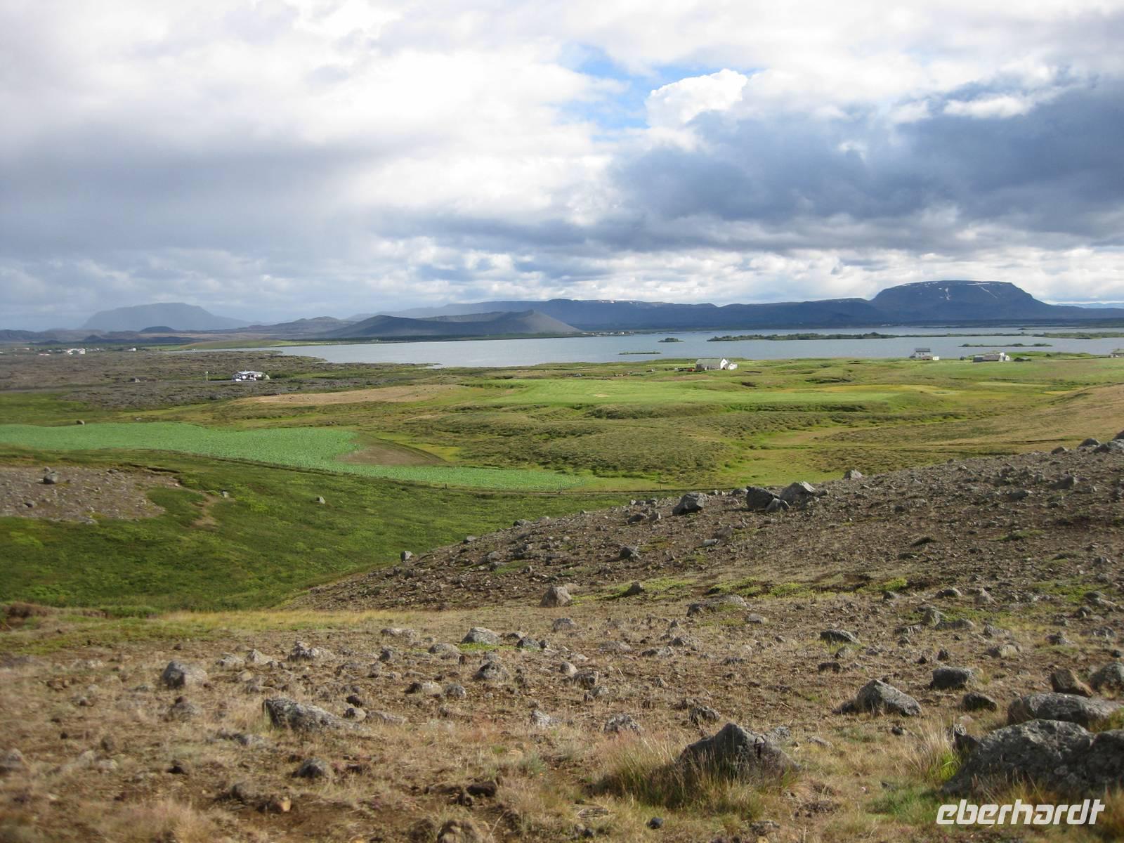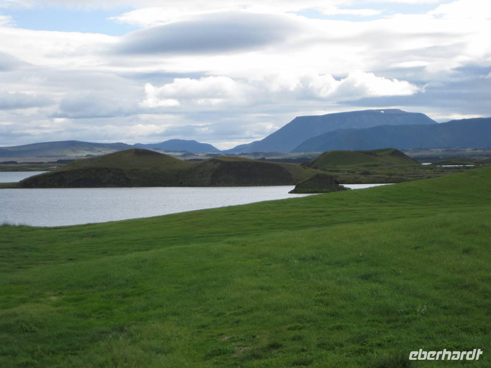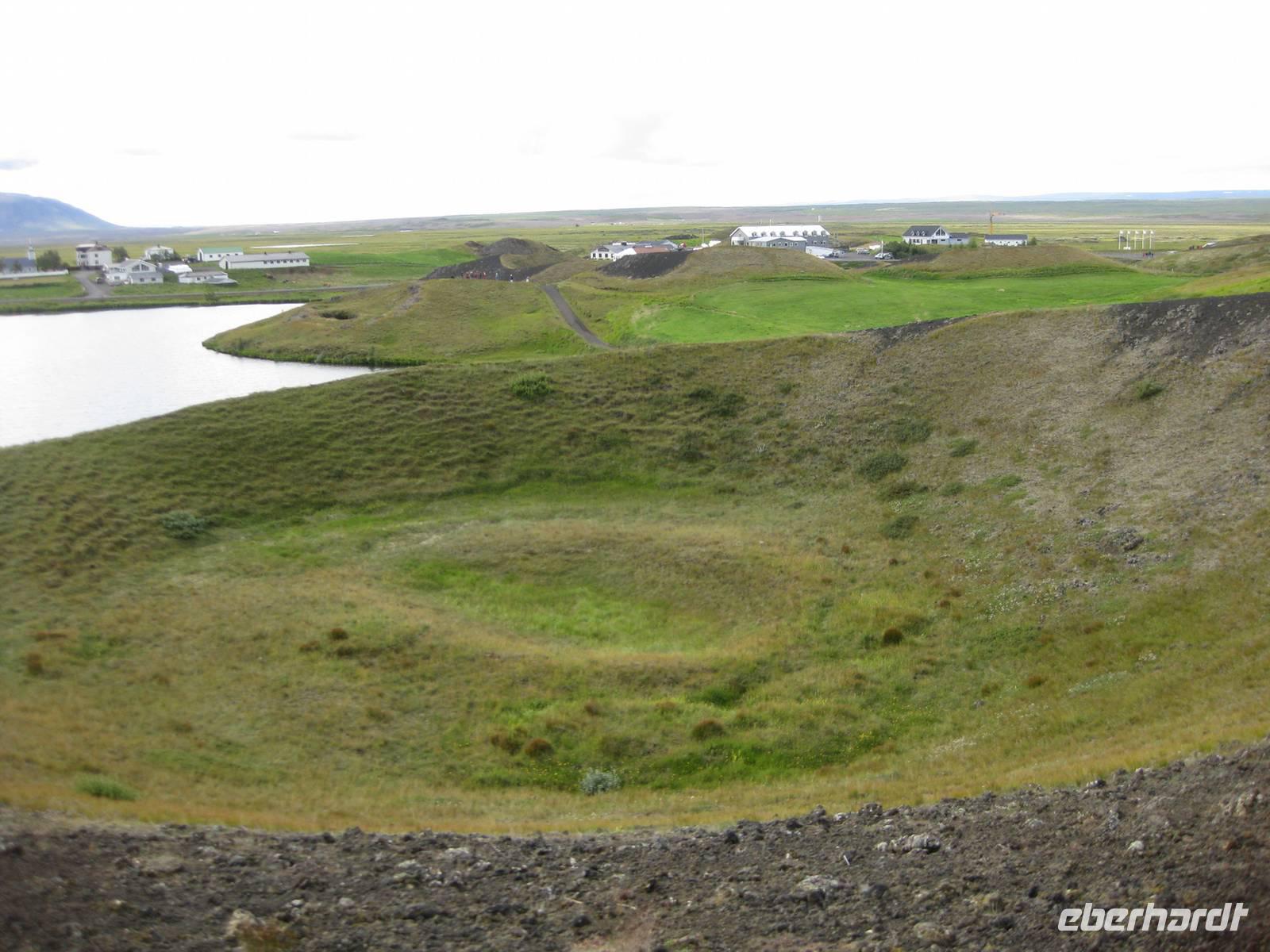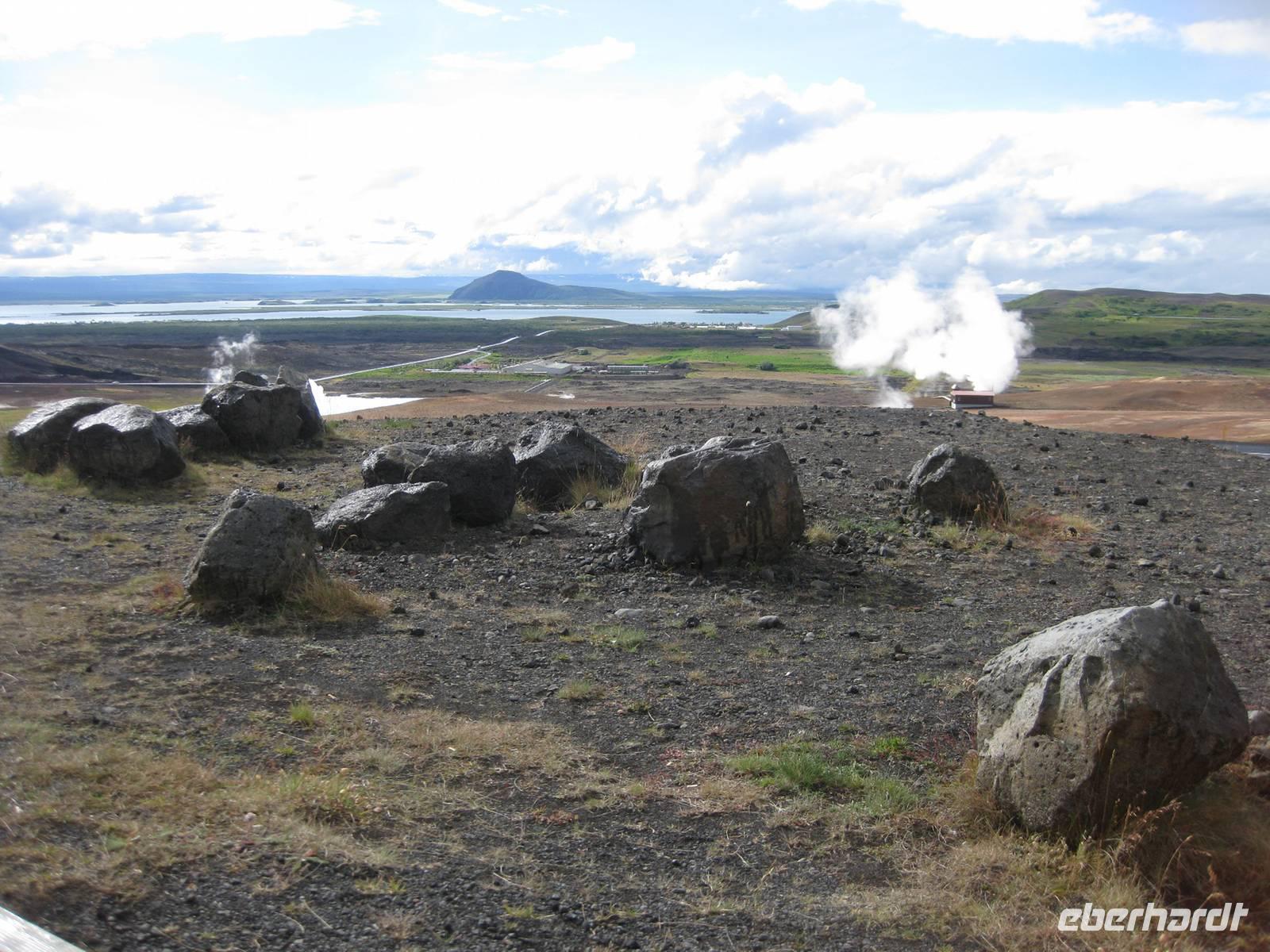 Wir fahren auf die andere Seite des Eyjafjördur und bestauenen Akureyji von dieser Seite aus. Weiter geht die Fahrt den Fjord entlang und bald biegen wir nach rechts ab. Wir fahren am „Lichtsee" vorbei bis zum Godafoss (Götterwasserfall). Hier machen wir halt und laufen zum Wasserfall. Mit großem Getöse stürzen die Wassermassen hinab. Wir betrachten den Wasserfall von allen Seiten. Ein Stück weiter flussabwärts steigen wir dann wieder in unseren Bus und fahren weiter zum Myvatn-Gebiet. Unsere Fahrt geht am „Laxa", einem der besten Lachsflüsse Islands entlang bis nach Skutustadir, wo wir eine kleine Wanderung zu den Pseudokratern machen und einen wunderbaren Rundblick über das Myvatn-Gebiet genießen. Eine einzigartige Landschaft eröffnet sich vor uns. Man könnte denken, man ist in einer anderen Welt.