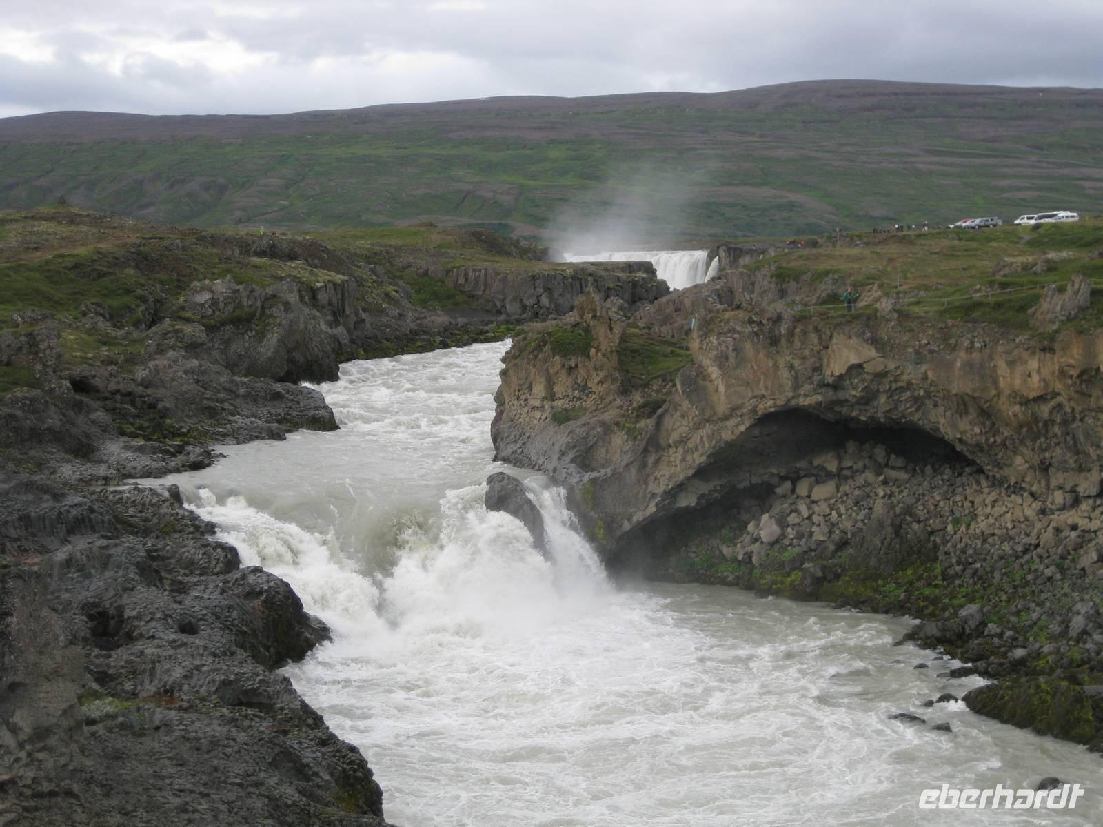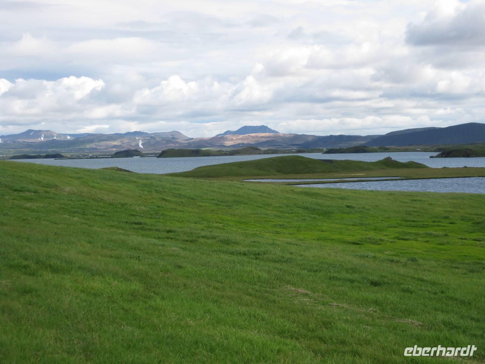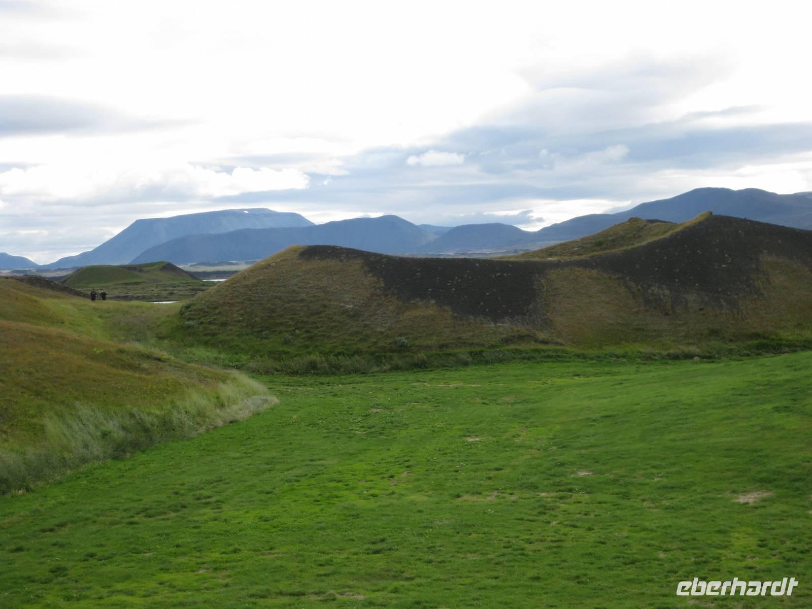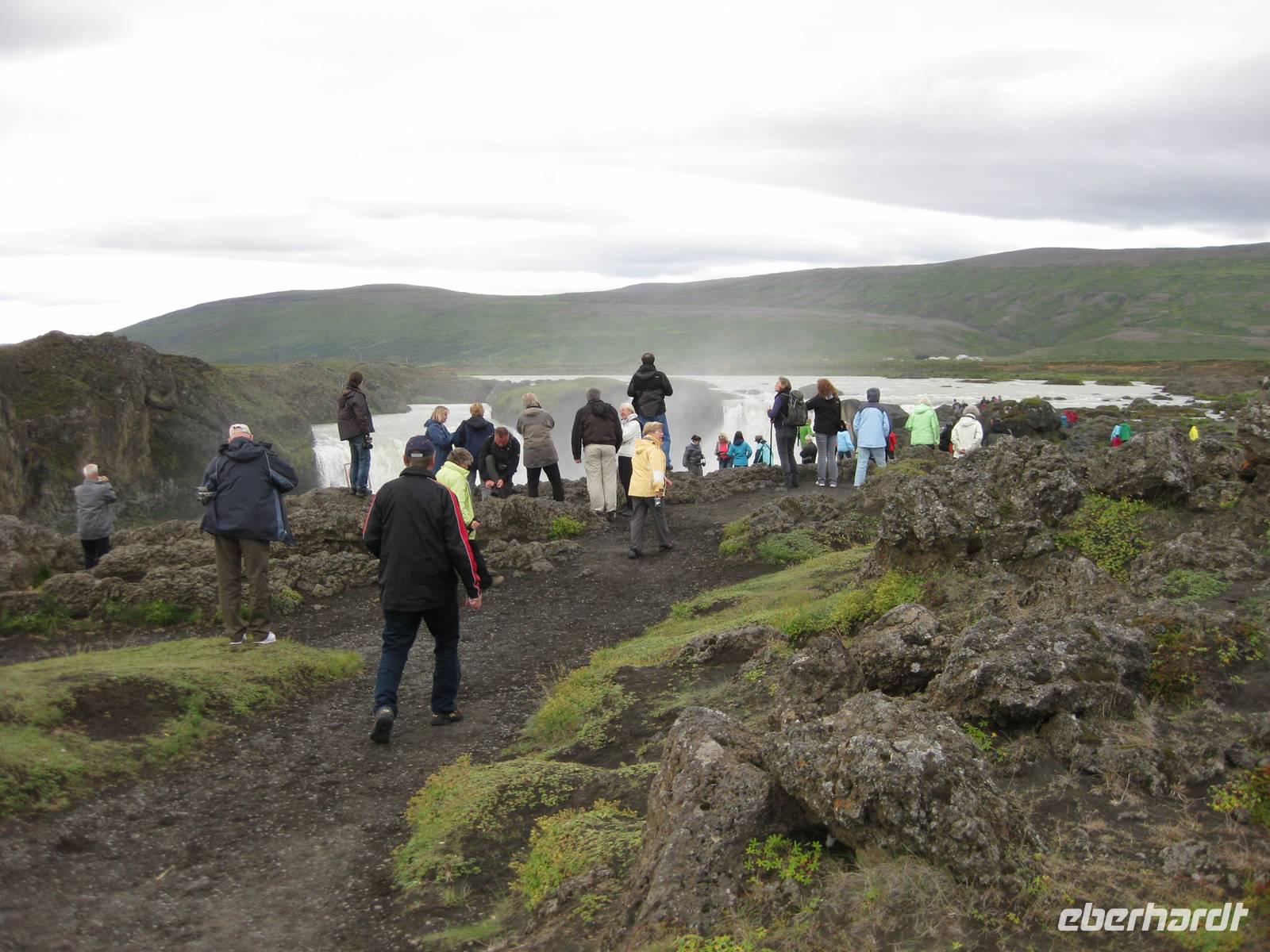 Wir fahren auf die andere Seite des Eyjafjördur und bestauenen Akureyji von dieser Seite aus. Weiter geht die Fahrt den Fjord entlang und bald biegen wir nach rechts ab. Wir fahren am „Lichtsee" vorbei bis zum Godafoss (Götterwasserfall). Hier machen wir halt und laufen zum Wasserfall. Mit großem Getöse stürzen die Wassermassen hinab. Wir betrachten den Wasserfall von allen Seiten. Ein Stück weiter flussabwärts steigen wir dann wieder in unseren Bus und fahren weiter zum Myvatn-Gebiet. Unsere Fahrt geht am „Laxa", einem der besten Lachsflüsse Islands entlang bis nach Skutustadir, wo wir eine kleine Wanderung zu den Pseudokratern machen und einen wunderbaren Rundblick über das Myvatn-Gebiet genießen. Eine einzigartige Landschaft eröffnet sich vor uns. Man könnte denken, man ist in einer anderen Welt.