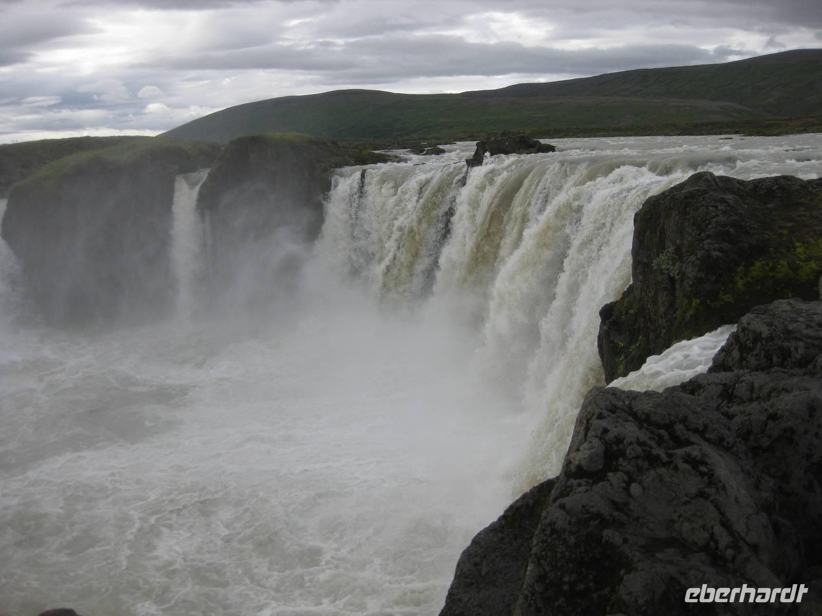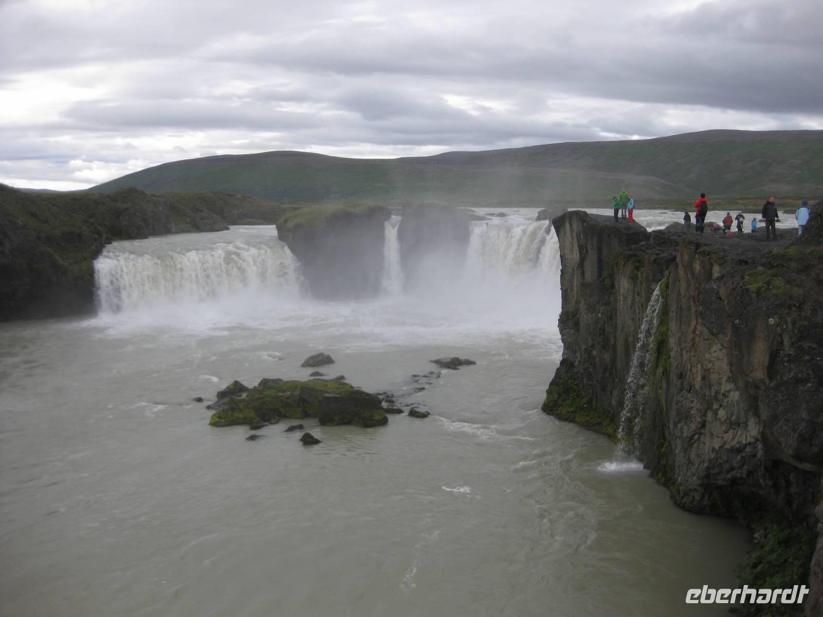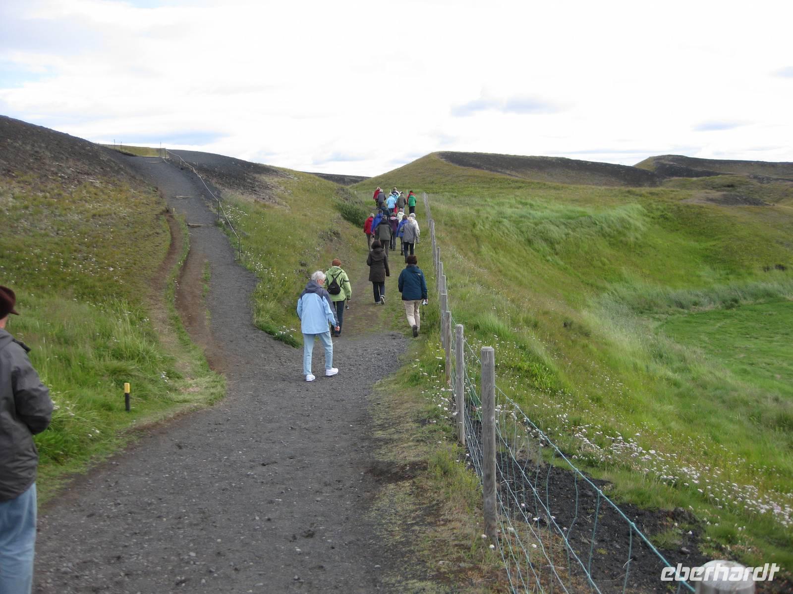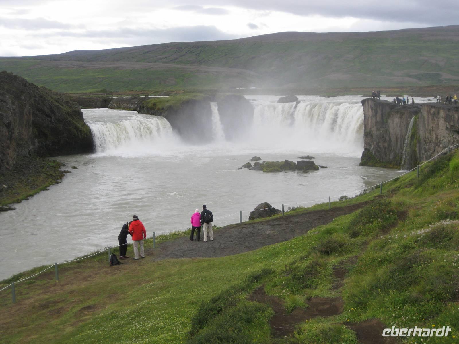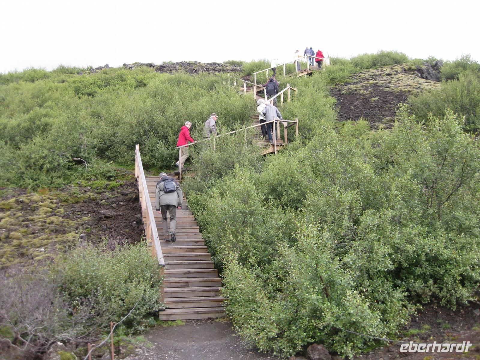Wir fahren auf die andere Seite des Eyjafjördur und bestauenen Akureyji von dieser Seite aus. Weiter geht die Fahrt den Fjord entlang und bald biegen wir nach rechts ab. Wir fahren am „Lichtsee" vorbei bis zum Godafoss (Götterwasserfall). Hier machen wir halt und laufen zum Wasserfall. Mit großem Getöse stürzen die Wassermassen hinab. Wir betrachten den Wasserfall von allen Seiten. Ein Stück weiter flussabwärts steigen wir dann wieder in unseren Bus und fahren weiter zum Myvatn-Gebiet. Unsere Fahrt geht am „Laxa", einem der besten Lachsflüsse Islands entlang bis nach Skutustadir, wo wir eine kleine Wanderung zu den Pseudokratern machen und einen wunderbaren Rundblick über das Myvatn-Gebiet genießen. Eine einzigartige Landschaft eröffnet sich vor uns. Man könnte denken, man ist in einer anderen Welt.