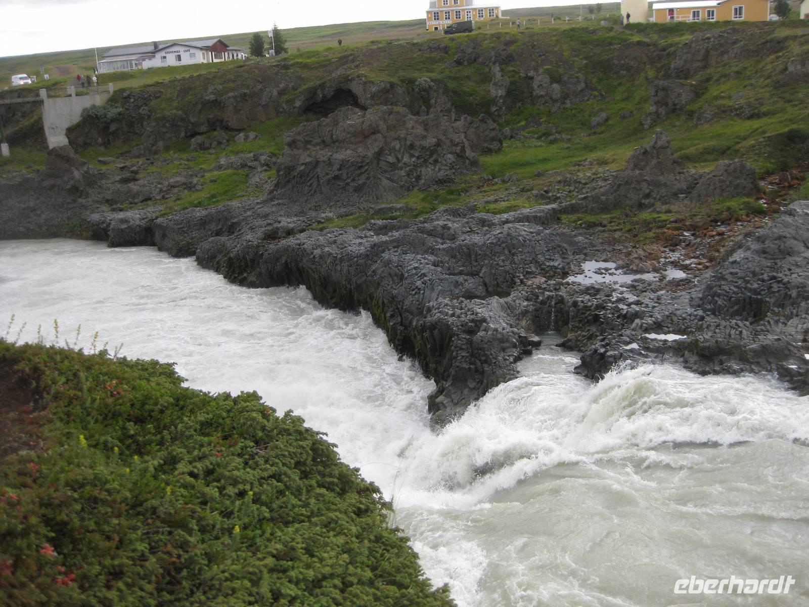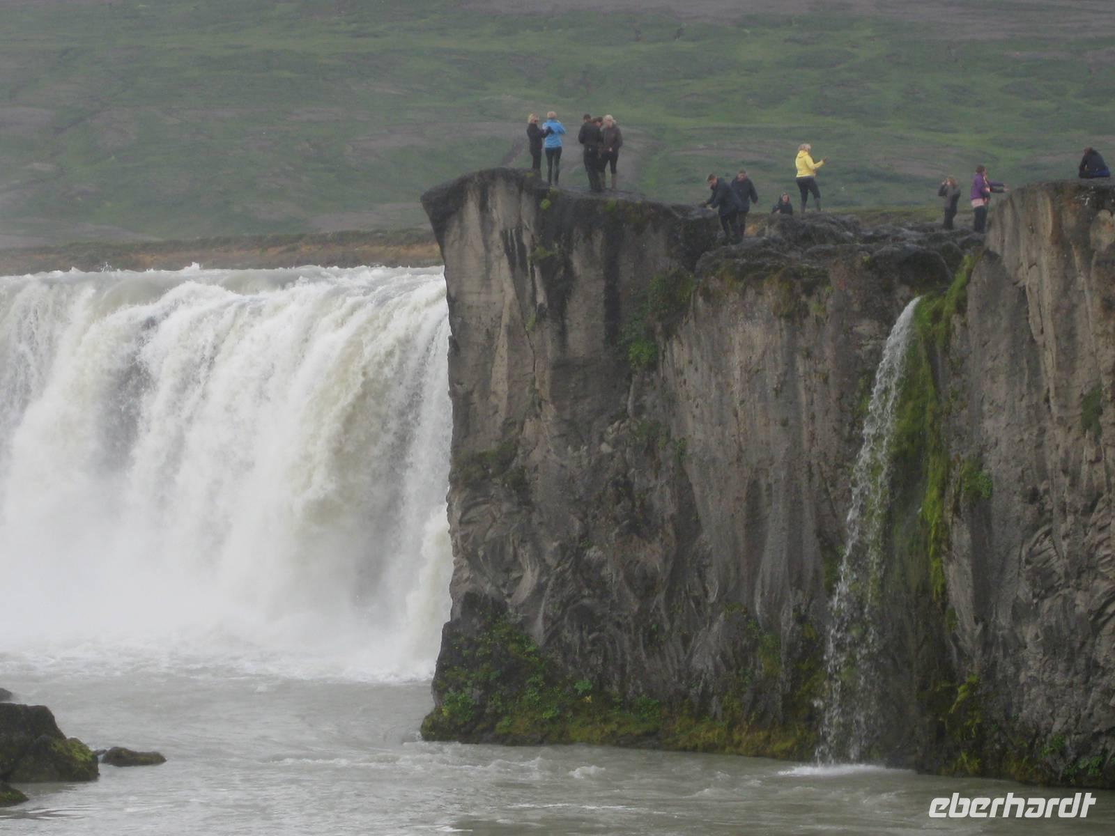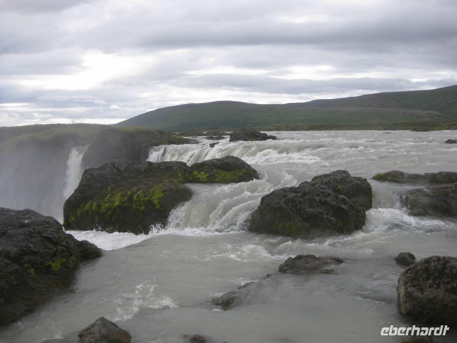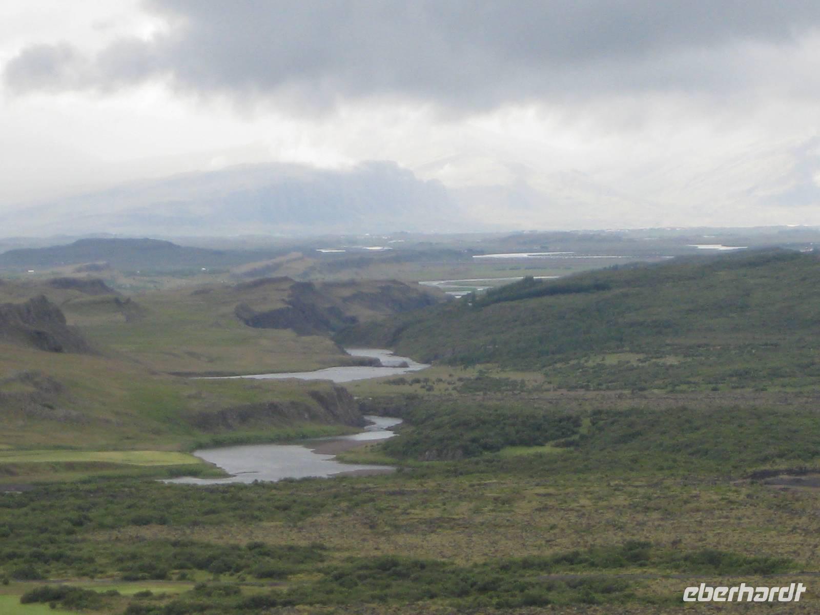 Wir fahren auf die andere Seite des Eyjafjördur und bestauenen Akureyji von dieser Seite aus. Weiter geht die Fahrt den Fjord entlang und bald biegen wir nach rechts ab. Wir fahren am „Lichtsee" vorbei bis zum Godafoss (Götterwasserfall). Hier machen wir halt und laufen zum Wasserfall. Mit großem Getöse stürzen die Wassermassen hinab. Wir betrachten den Wasserfall von allen Seiten. Ein Stück weiter flussabwärts steigen wir dann wieder in unseren Bus und fahren weiter zum Myvatn-Gebiet. Unsere Fahrt geht am „Laxa", einem der besten Lachsflüsse Islands entlang bis nach Skutustadir, wo wir eine kleine Wanderung zu den Pseudokratern machen und einen wunderbaren Rundblick über das Myvatn-Gebiet genießen. Eine einzigartige Landschaft eröffnet sich vor uns. Man könnte denken, man ist in einer anderen Welt.