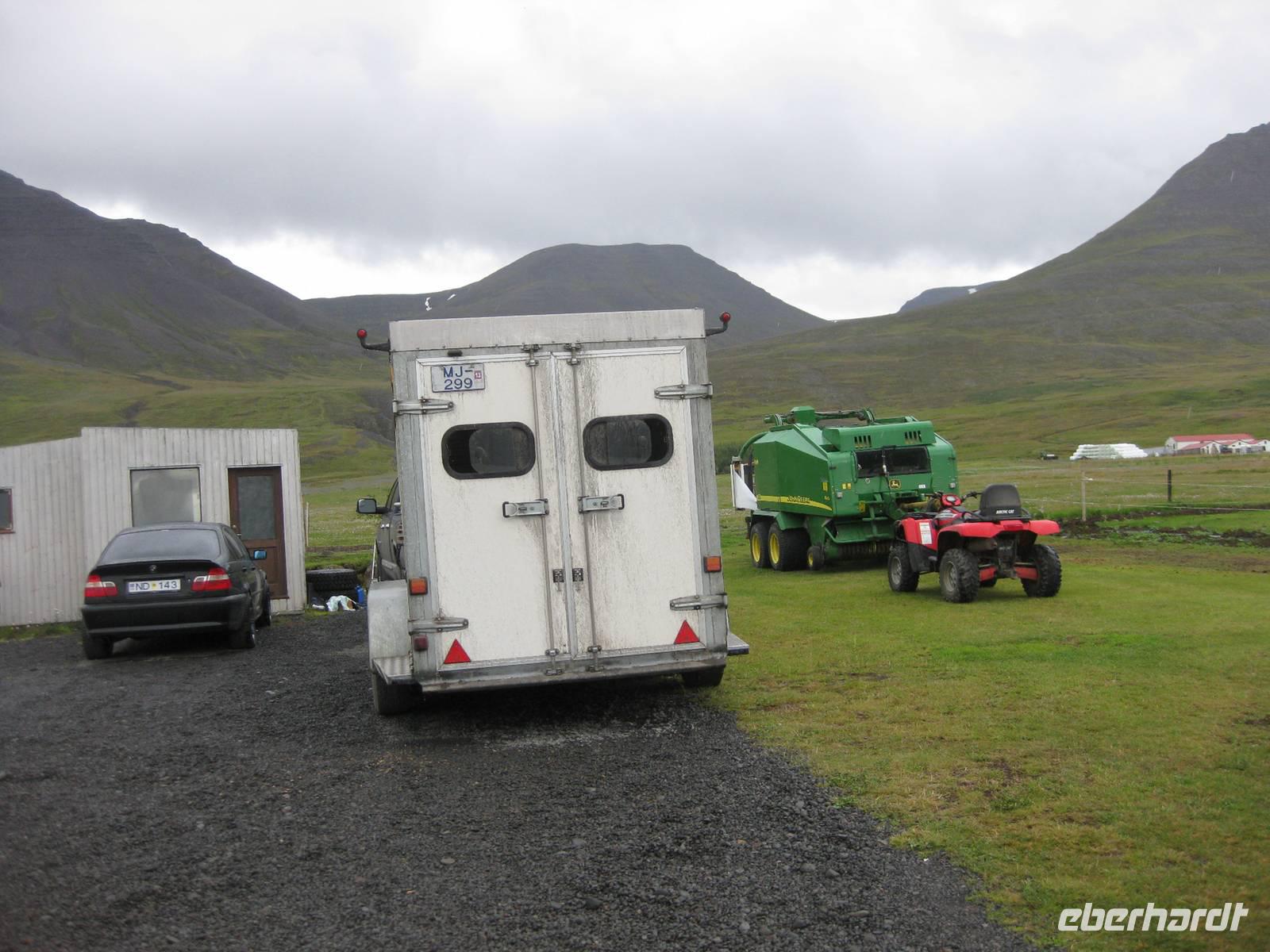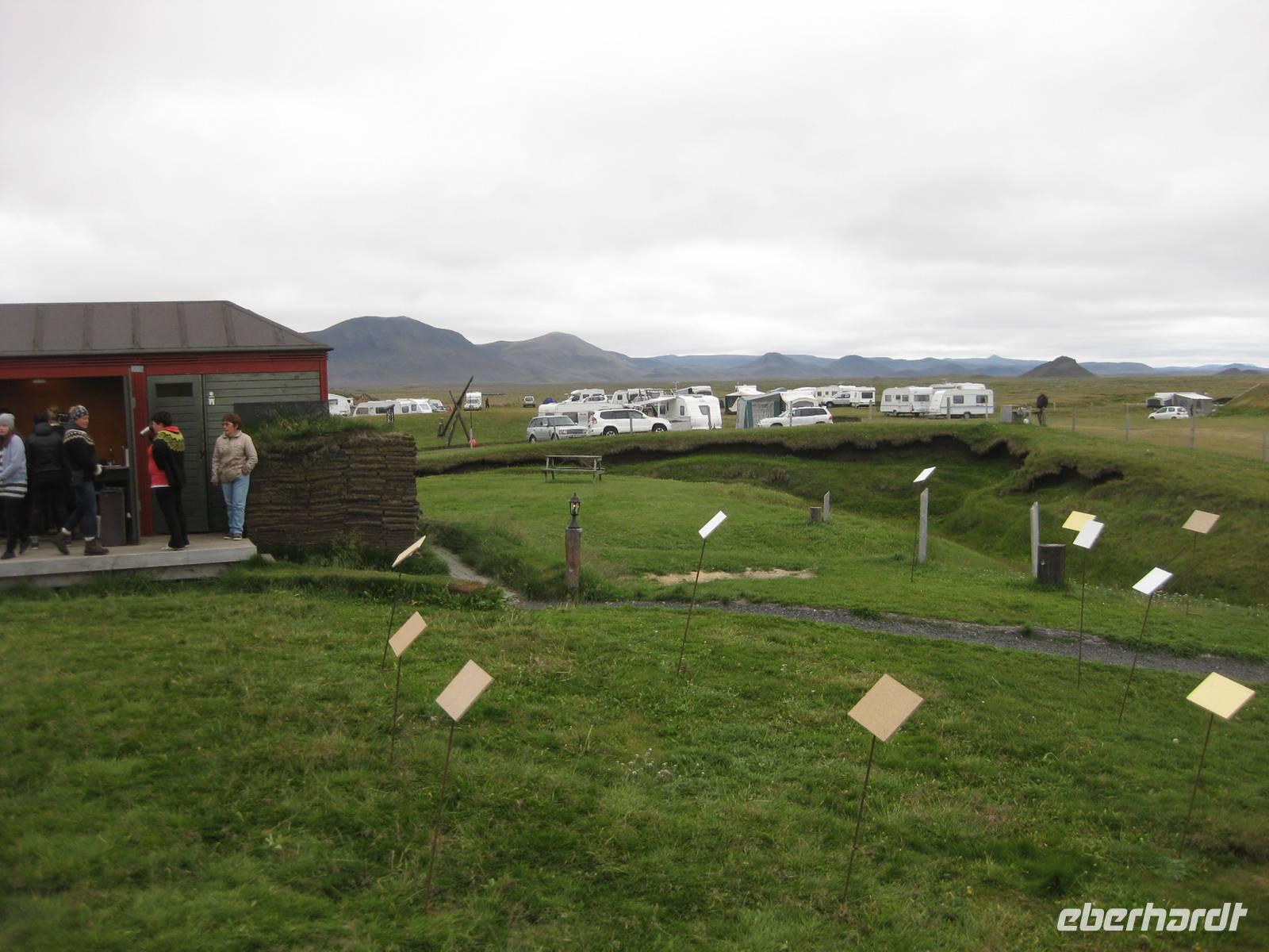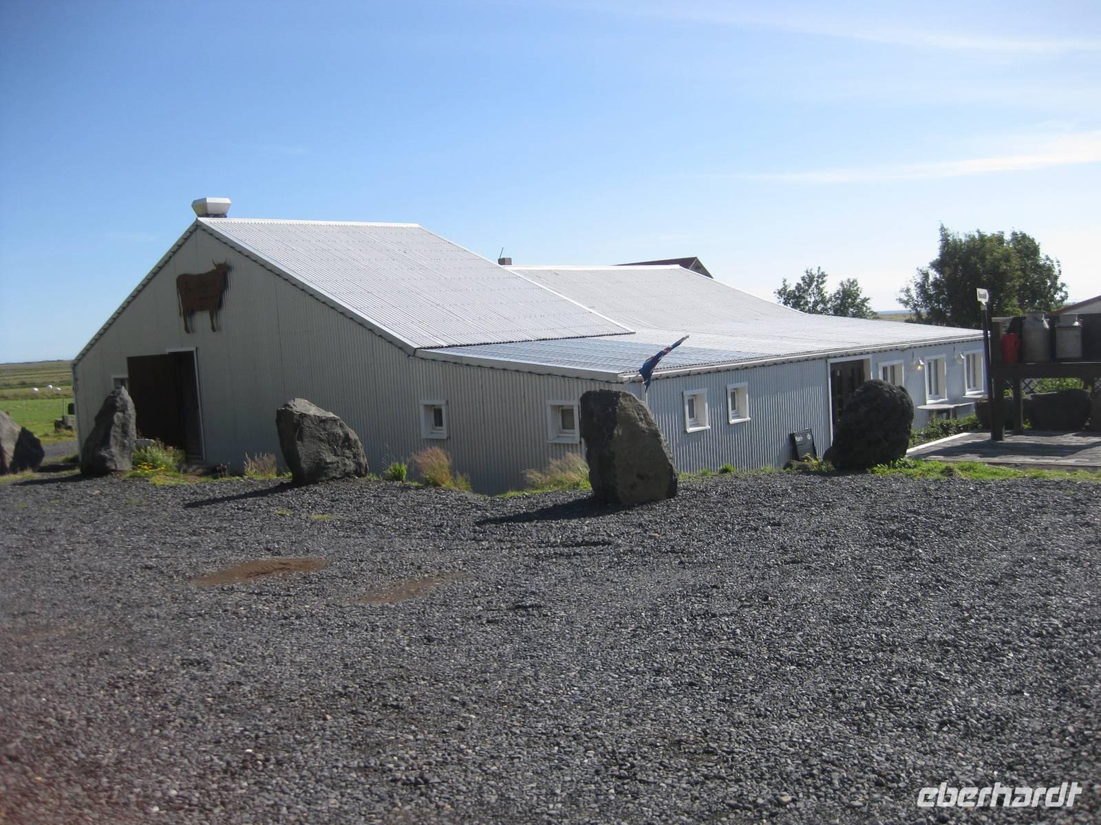 Am späten Nachmittag erreichen wir einen Bauernhof, auf dem sich auch ein Cafe befindet. Wir kehren ein, trinken Kaffee und genießen frischen selbstgebackenen Kuchen. Hier wird heute gerade ein Sommerfest gefeiert und da sind auch viele Isländer da. Die meisten von ihnen übernachten in Ihren Wohnwagen.