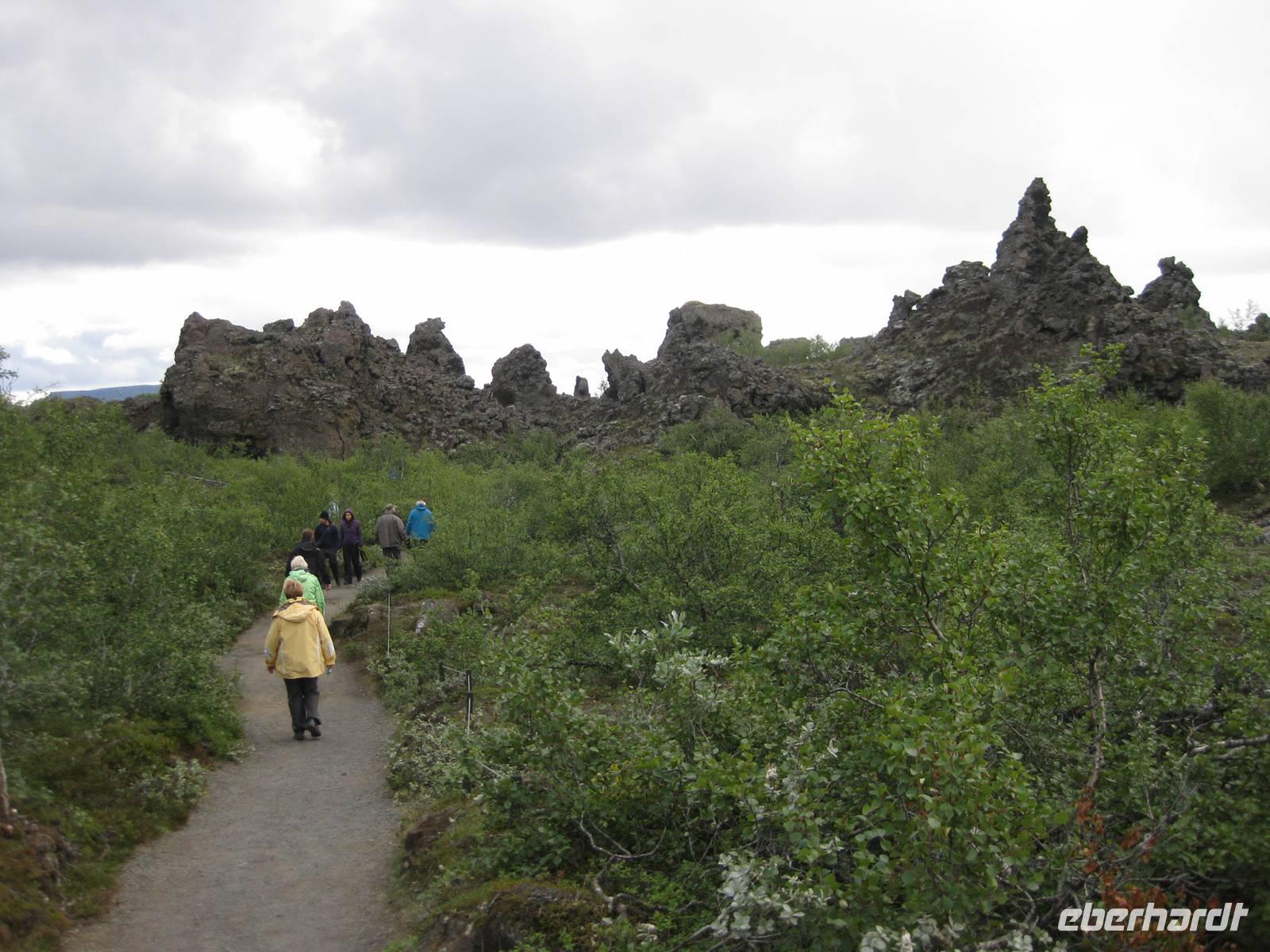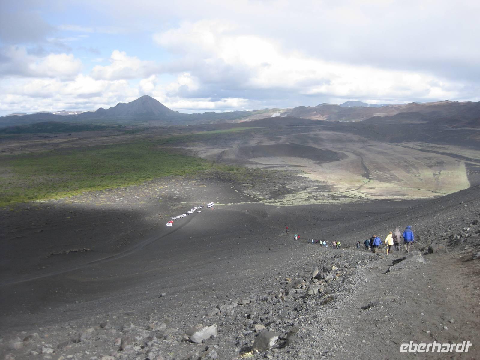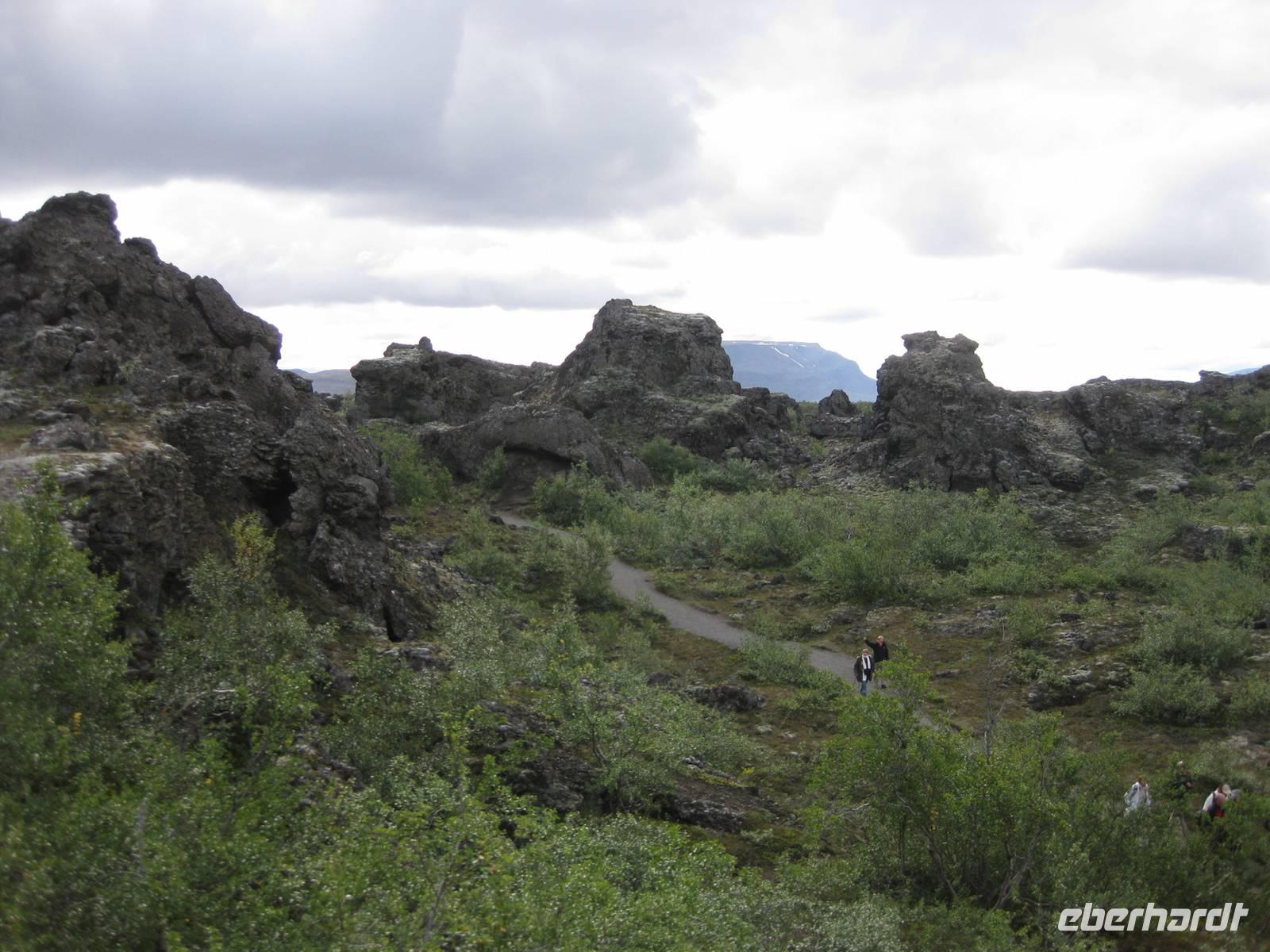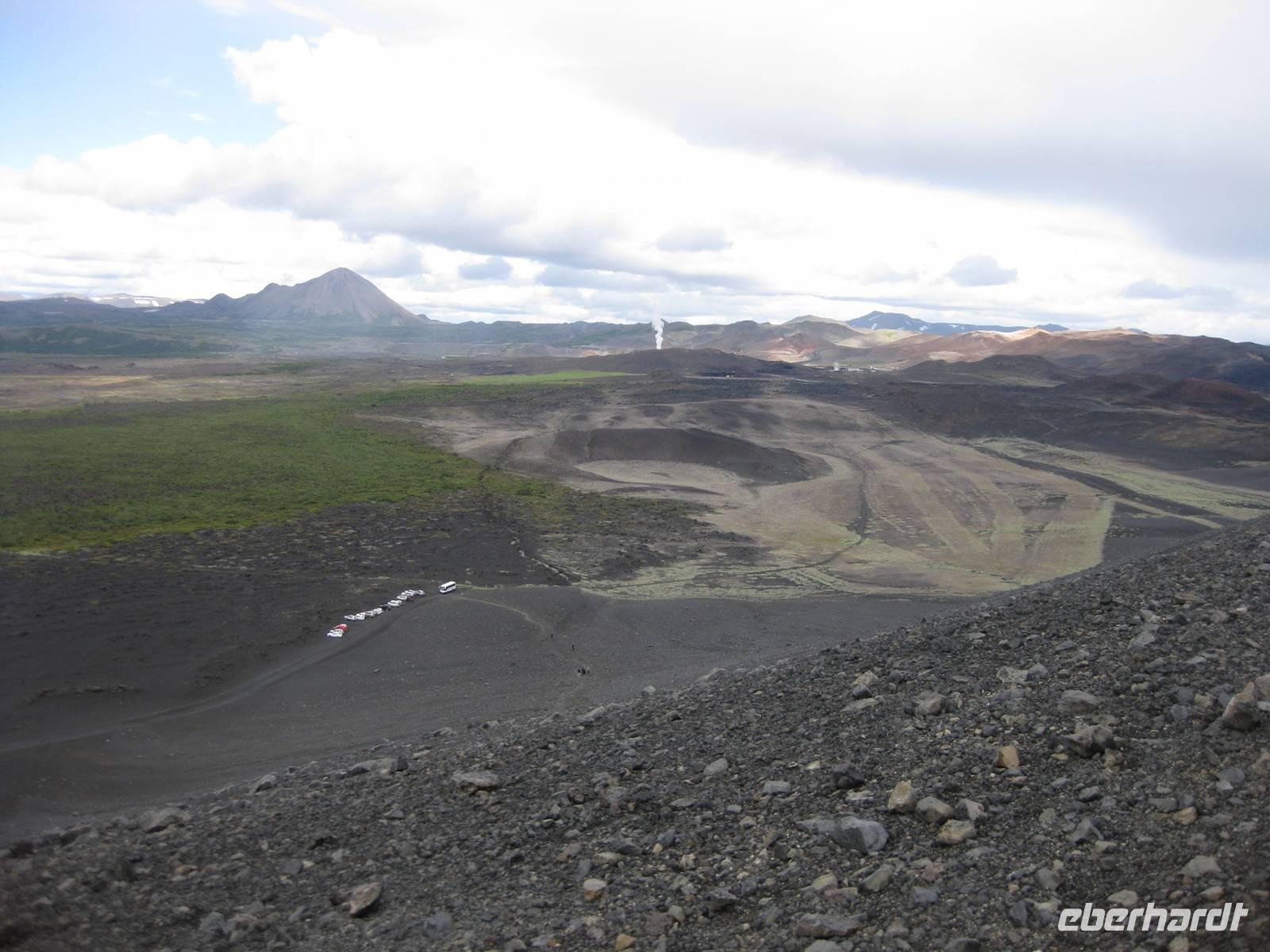 Dann setzen wir unsere Fahrt fort und fahren zum Labyrinth Dimmuborgir. Hier machen wir einen Rundgang durch das Labyrinth und bestaunen die bizarren Lava-Felsgebilde. Nach dem Rundgang fahren wir nur ein kleines Stück mit dem Bus weiter bis zum Ringwallkrater „Hverfjall". Rosa besteigt mit uns den Krater. Oben angekommen können wir in den Krater hineinschauen und wir haben vom Kraterrand aus einen faszinierenden Blick über das Myvatn-Gebiet. Dann steigen wir wieder hinab.
