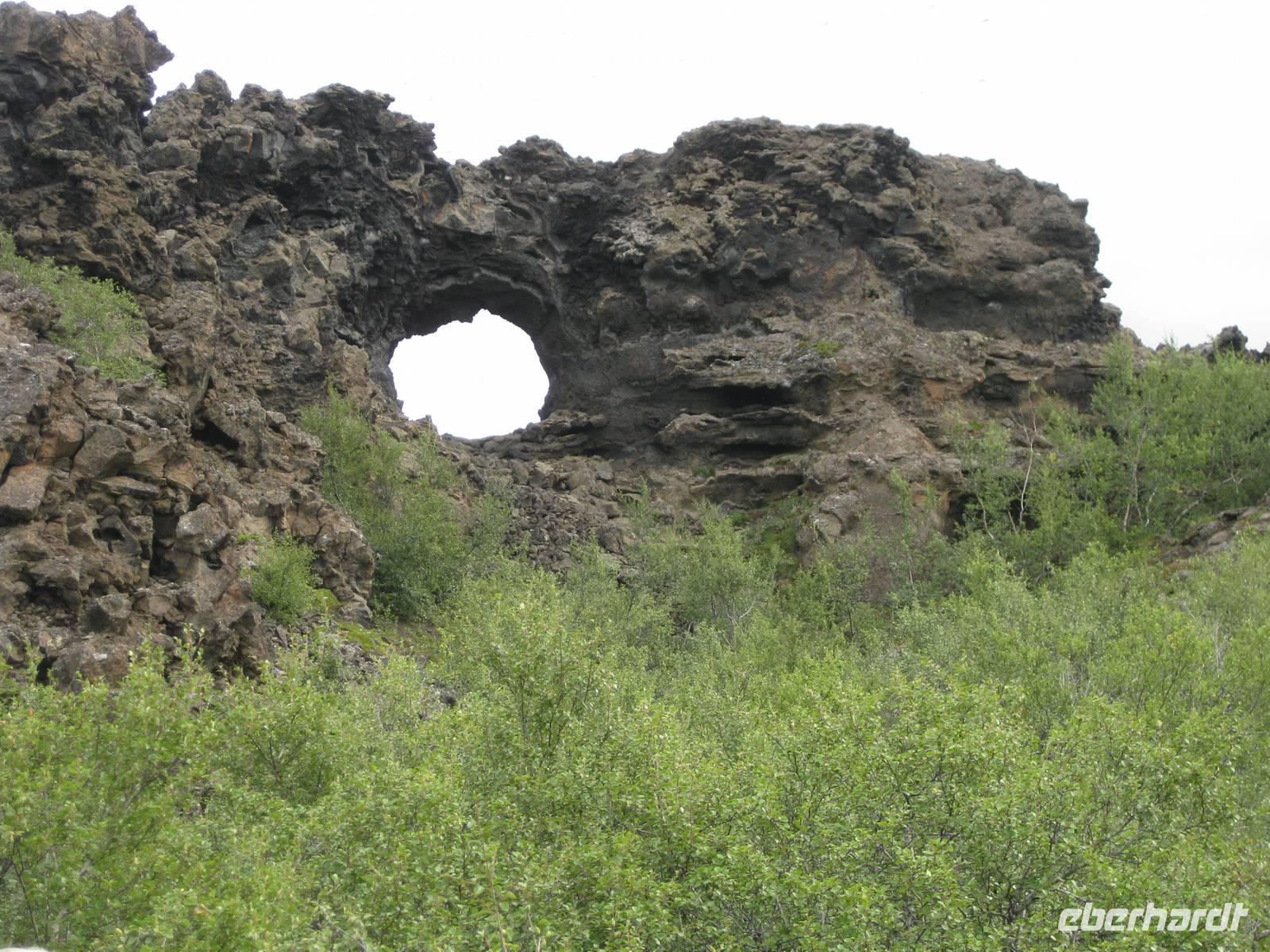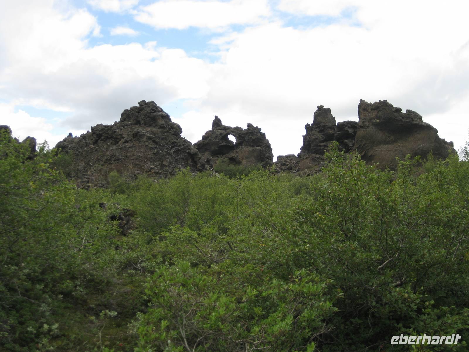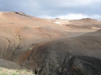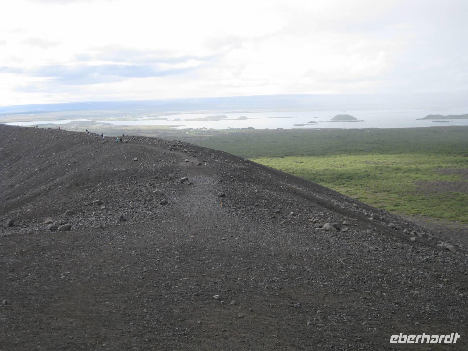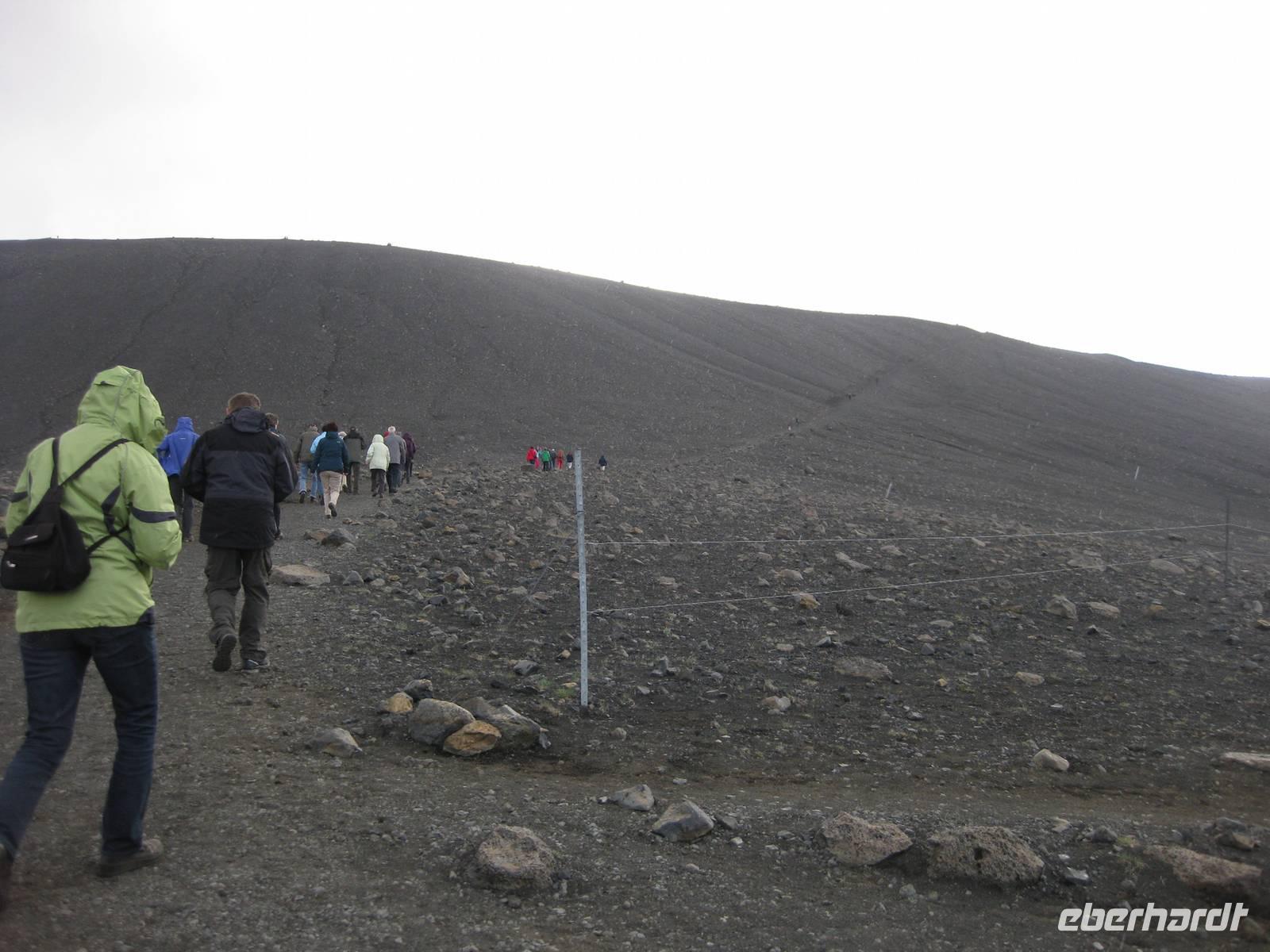 Dann setzen wir unsere Fahrt fort und fahren zum Labyrinth Dimmuborgir. Hier machen wir einen Rundgang durch das Labyrinth und bestaunen die bizarren Lava-Felsgebilde. Nach dem Rundgang fahren wir nur ein kleines Stück mit dem Bus weiter bis zum Ringwallkrater „Hverfjall". Rosa besteigt mit uns den Krater. Oben angekommen können wir in den Krater hineinschauen und wir haben vom Kraterrand aus einen faszinierenden Blick über das Myvatn-Gebiet. Dann steigen wir wieder hinab.