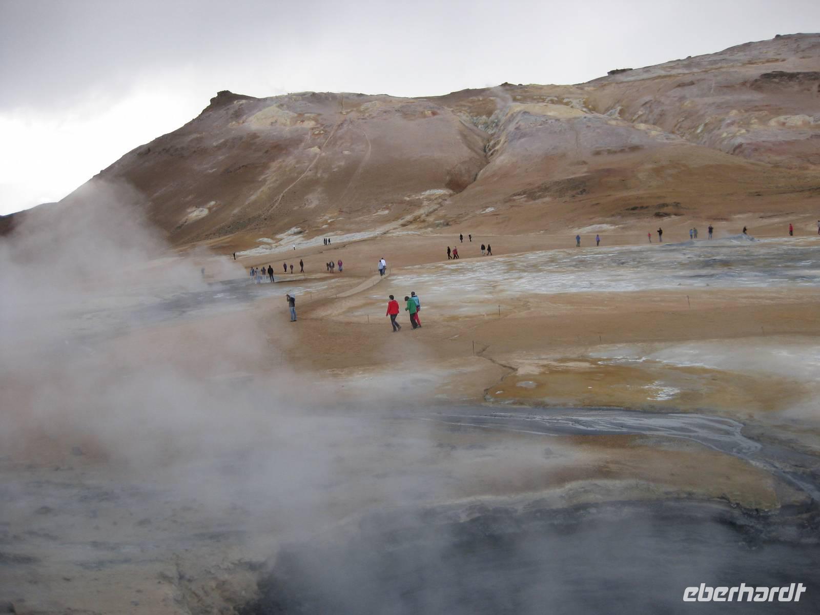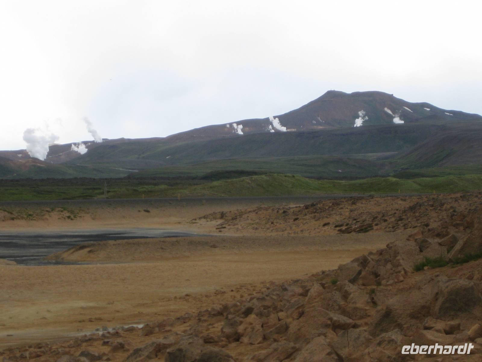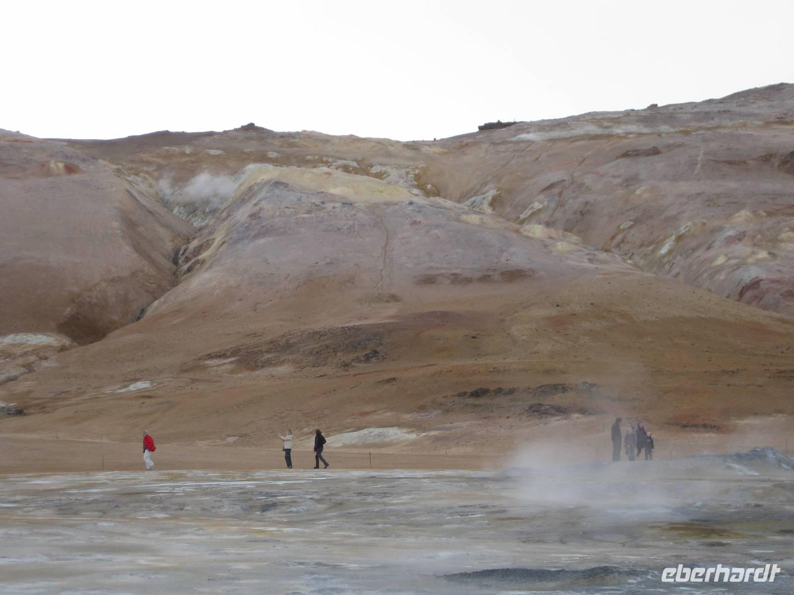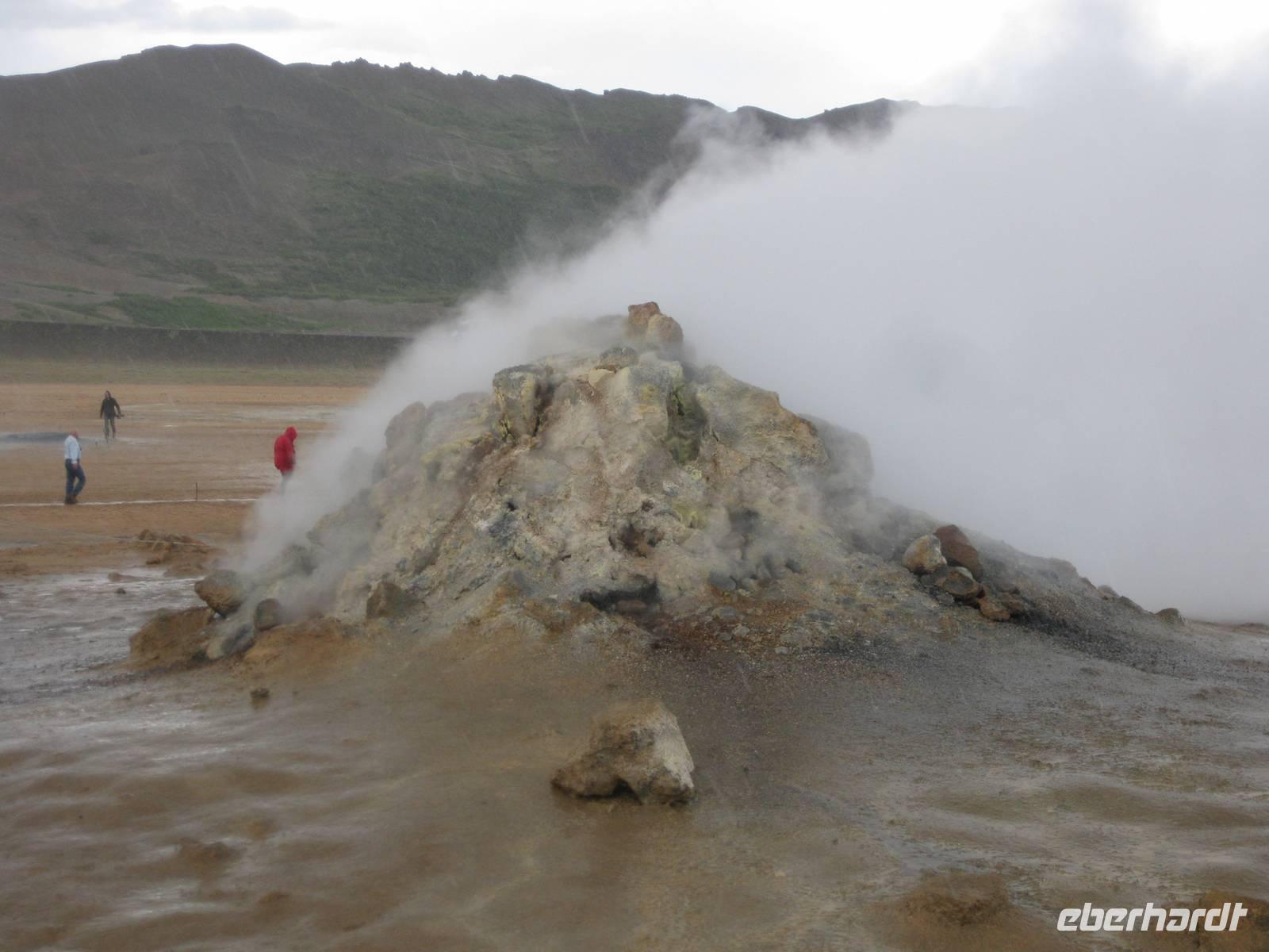 Nach dem Baden fahren wir zum Hochtemperaturgebiet Hverir. Hier brodeln überall heiße Schlammquellen und es riecht nach Schwefel. So muss es in des Teufels Küche sein. Leider prasselt hier ein Regenschauer auf uns nieder, so dass wir den Besuch schneller beenden müssen - schade. Die Sonne ist aber schnell wieder da. Langsam begeben wir uns wieder auf die Rückfahrt nach Akureyri. Zunächst fahren wir weiter auf der Straße rund um den Myvatn-See. Wir legen noch einige Fotostopps ein. Pünktlich zum Abendessen sind wir wieder im Edda-Hotel Akureyri.