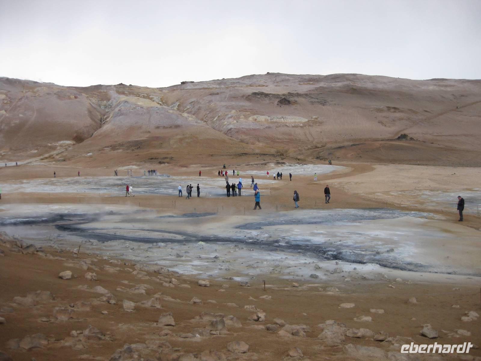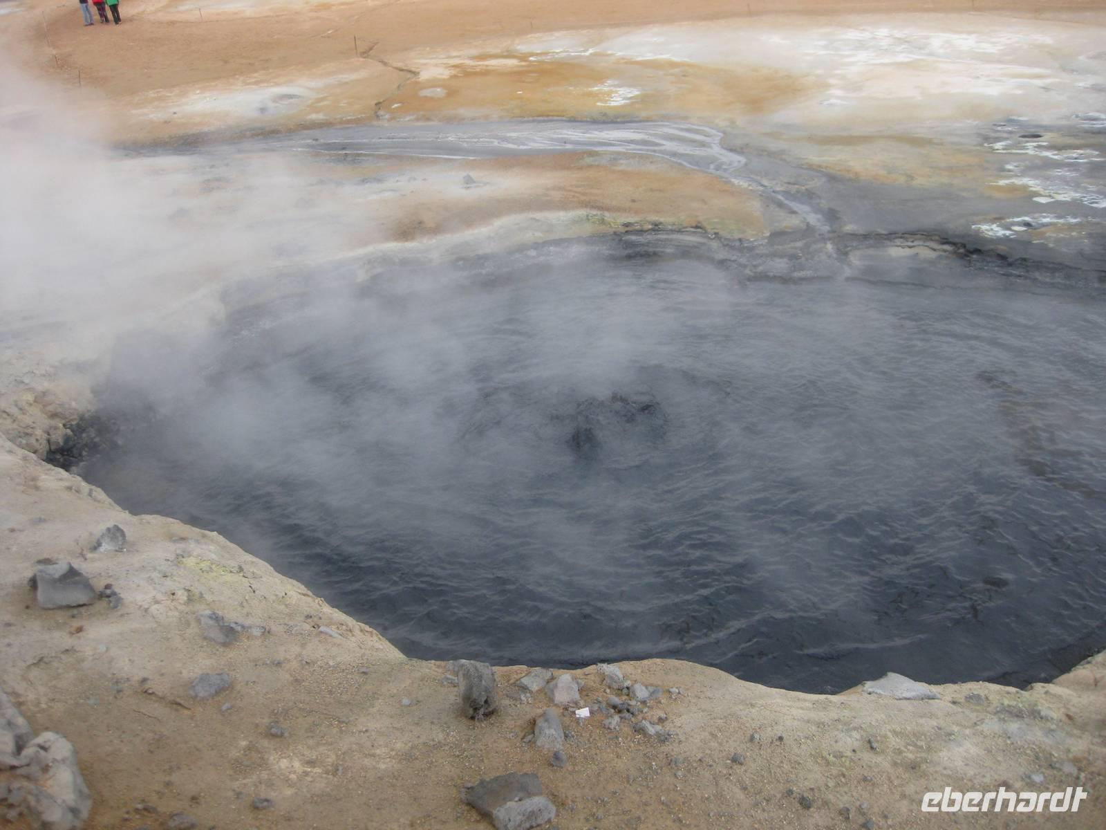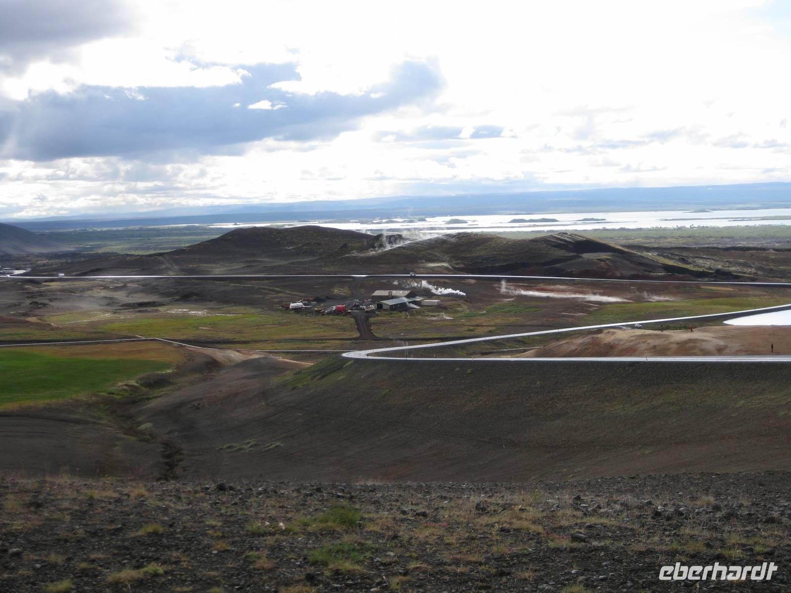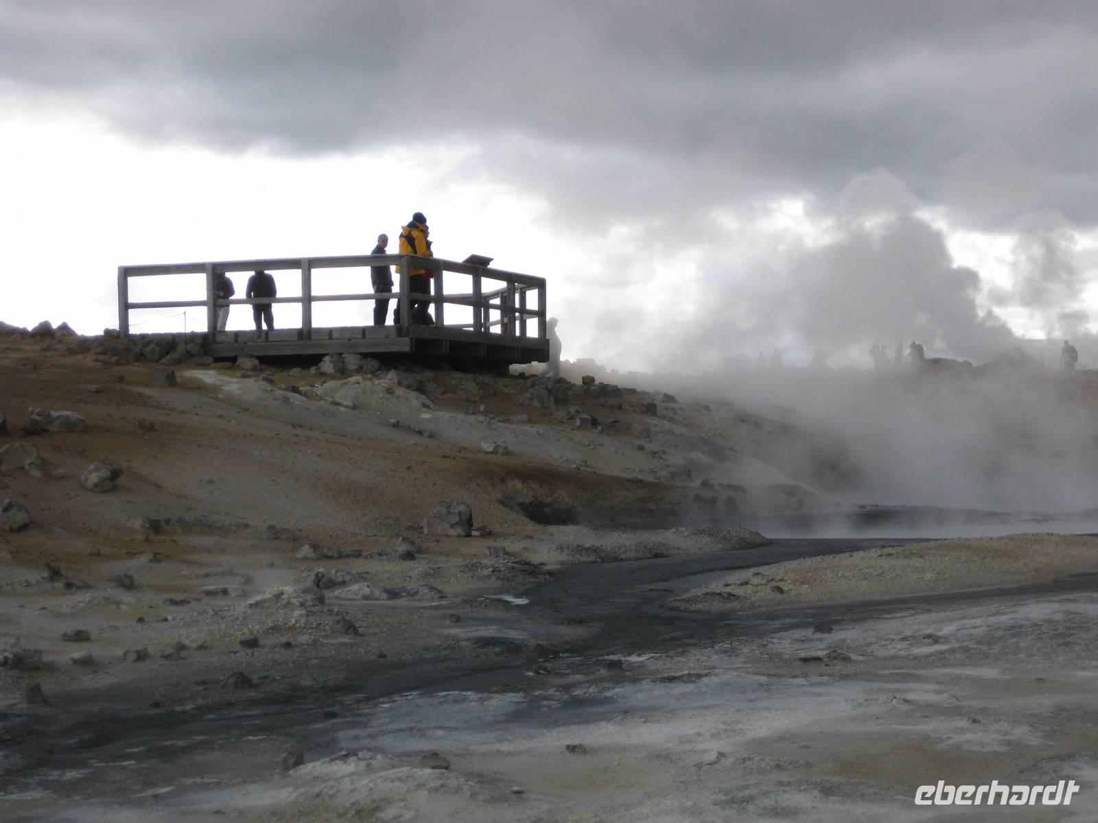 Nach dem Baden fahren wir zum Hochtemperaturgebiet Hverir. Hier brodeln überall heiße Schlammquellen und es riecht nach Schwefel. So muss es in des Teufels Küche sein. Leider prasselt hier ein Regenschauer auf uns nieder, so dass wir den Besuch schneller beenden müssen - schade. Die Sonne ist aber schnell wieder da. Langsam begeben wir uns wieder auf die Rückfahrt nach Akureyri. Zunächst fahren wir weiter auf der Straße rund um den Myvatn-See. Wir legen noch einige Fotostopps ein. Pünktlich zum Abendessen sind wir wieder im Edda-Hotel Akureyri.