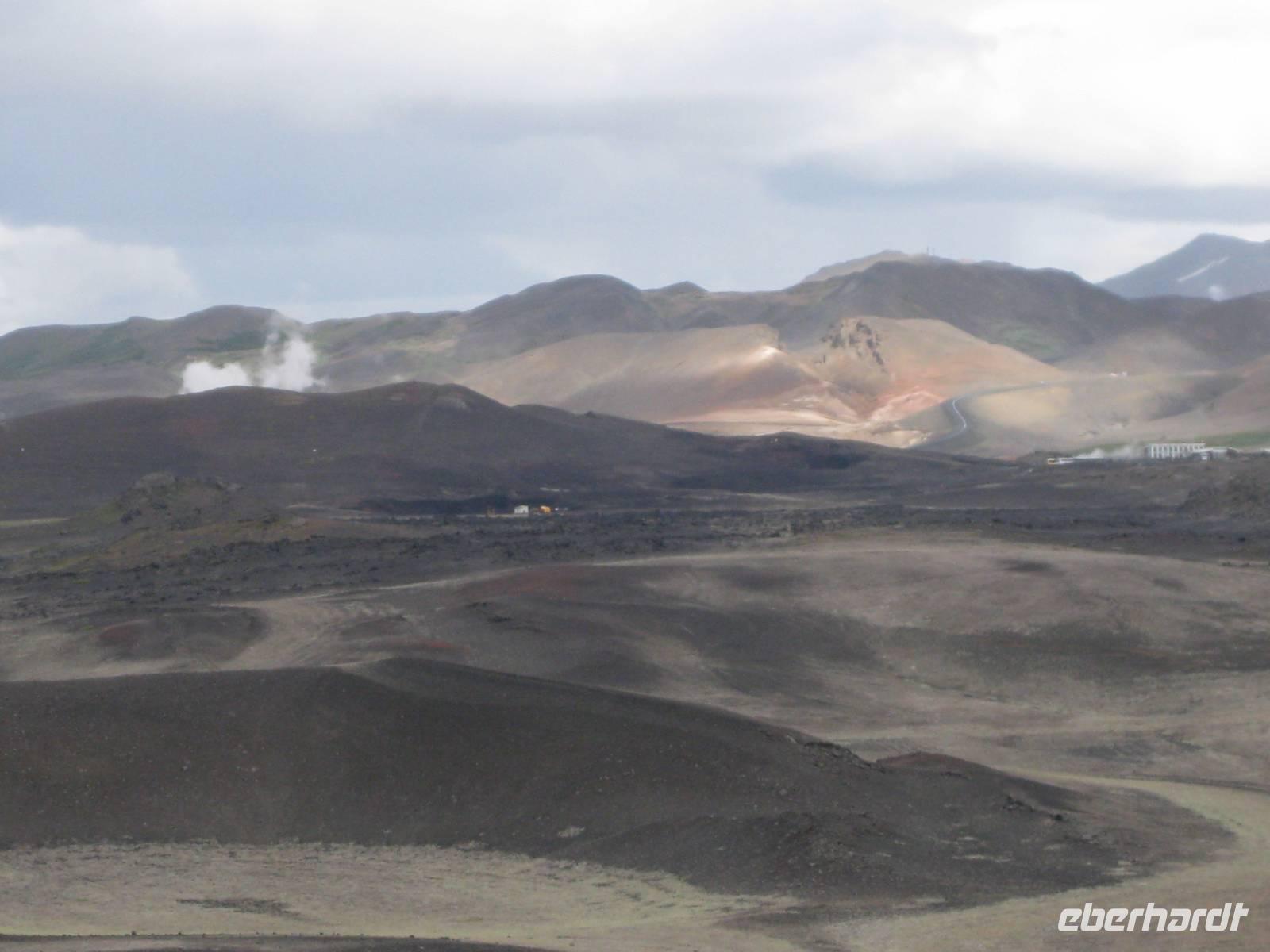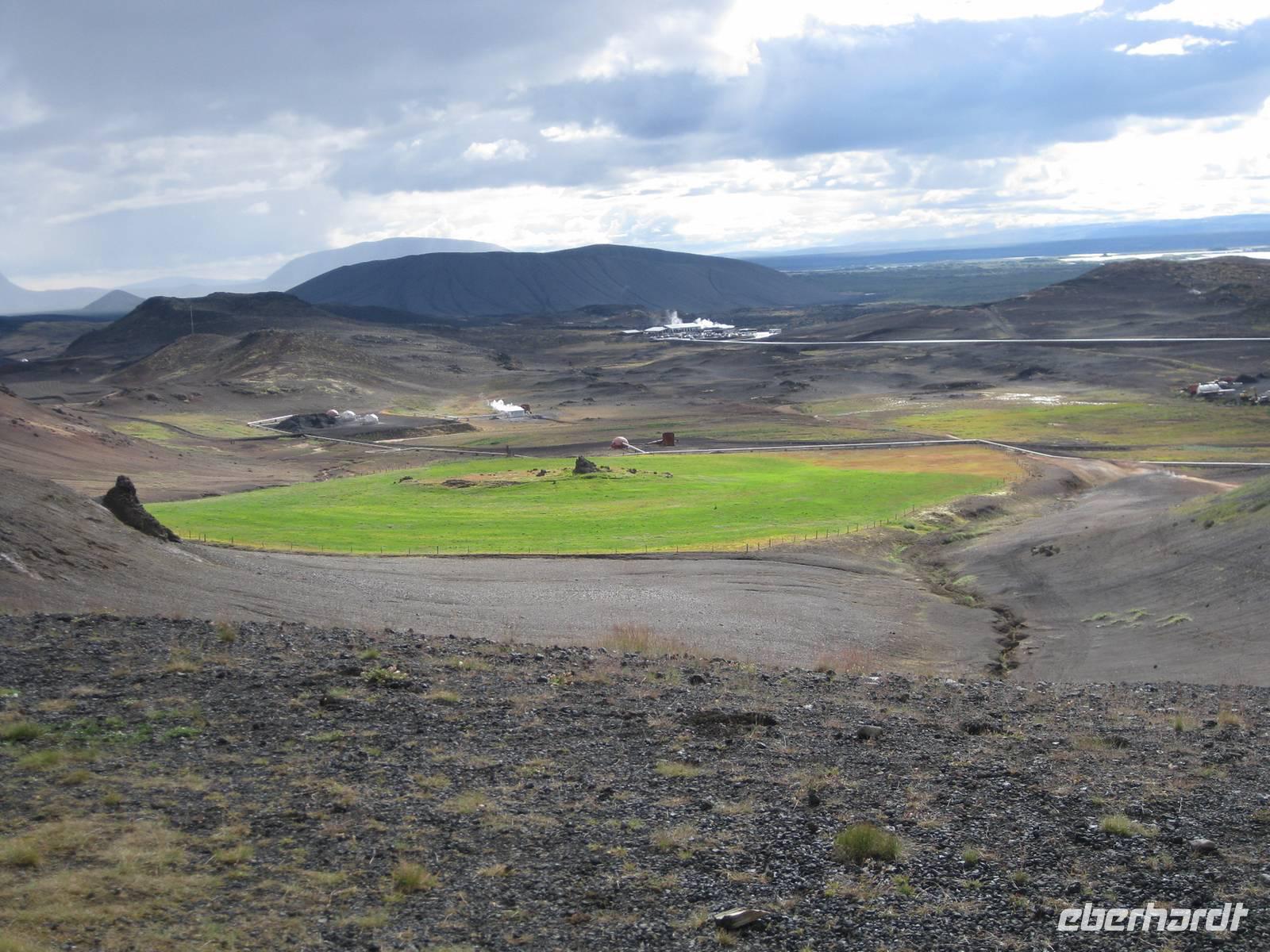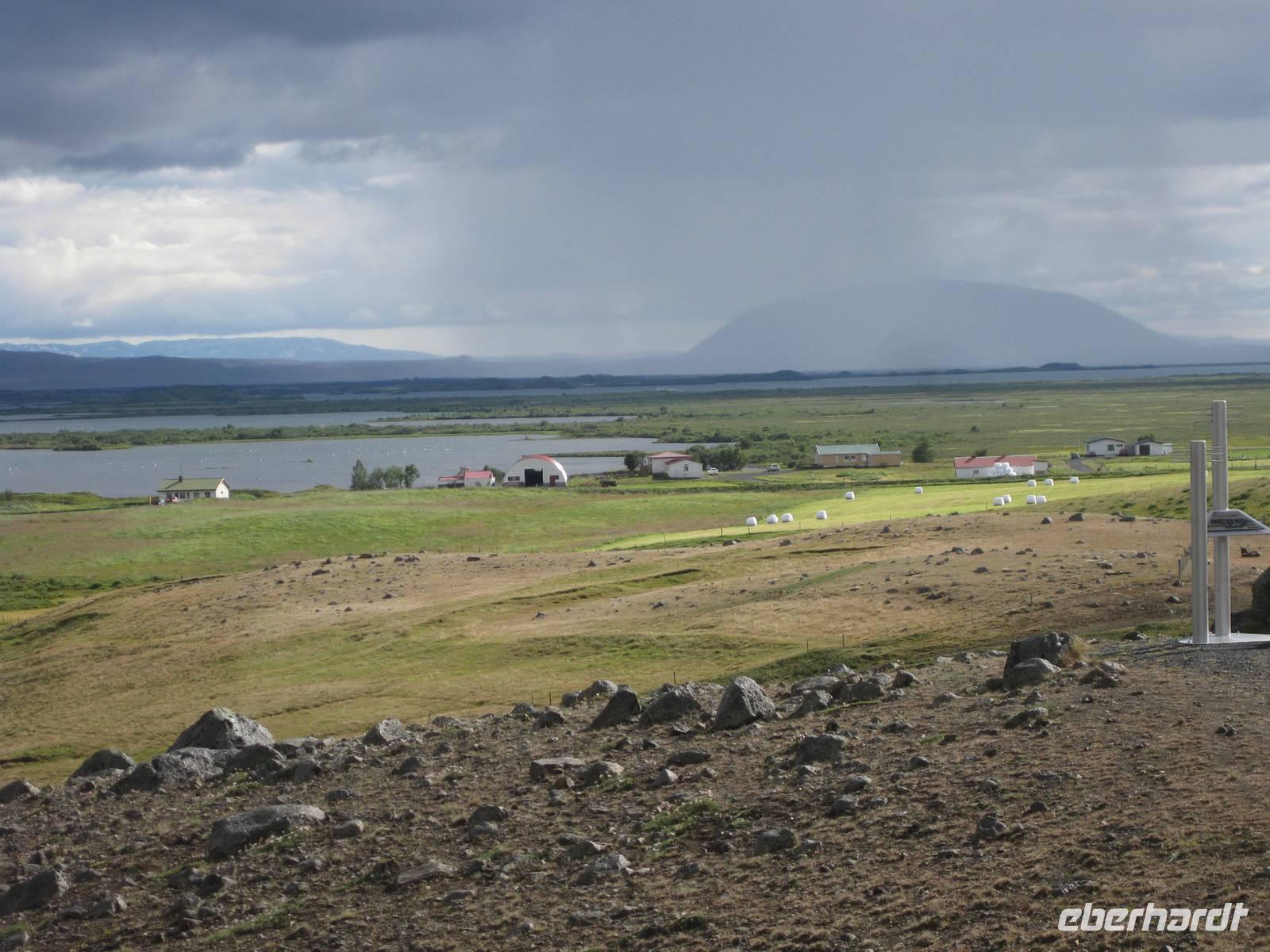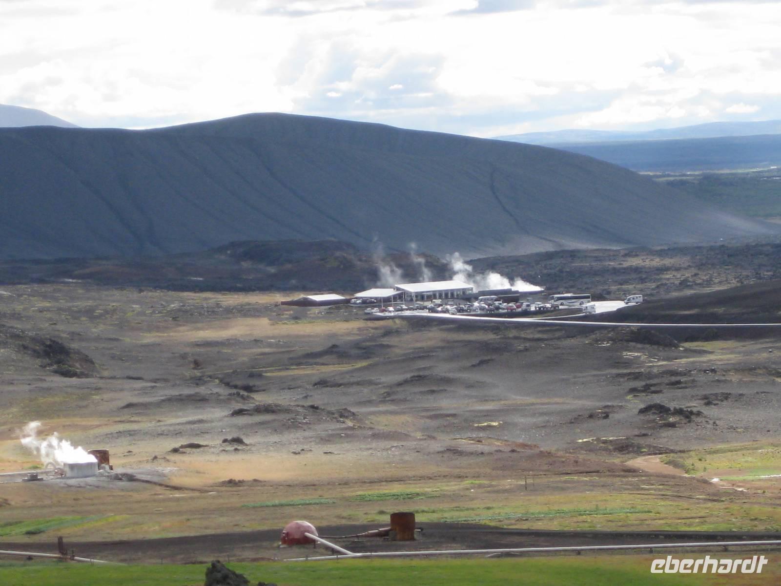 Nach dem Baden fahren wir zum Hochtemperaturgebiet Hverir. Hier brodeln überall heiße Schlammquellen und es riecht nach Schwefel. So muss es in des Teufels Küche sein. Leider prasselt hier ein Regenschauer auf uns nieder, so dass wir den Besuch schneller beenden müssen - schade. Die Sonne ist aber schnell wieder da. Langsam begeben wir uns wieder auf die Rückfahrt nach Akureyri. Zunächst fahren wir weiter auf der Straße rund um den Myvatn-See. Wir legen noch einige Fotostopps ein. Pünktlich zum Abendessen sind wir wieder im Edda-Hotel Akureyri.