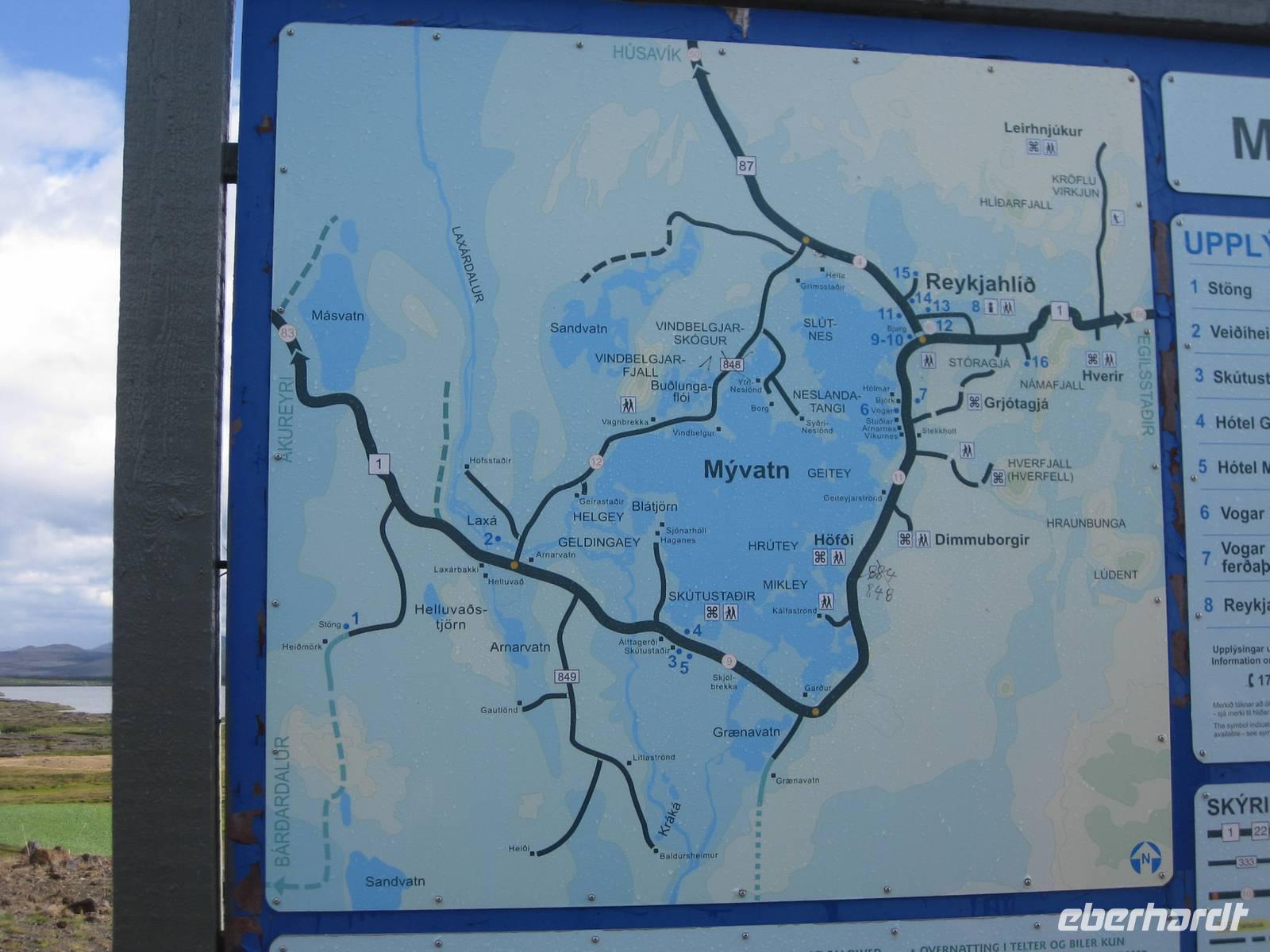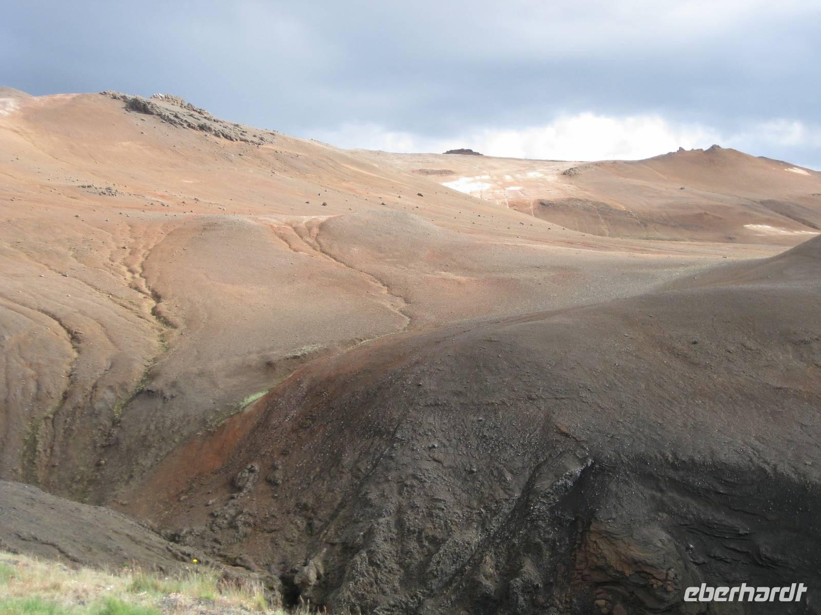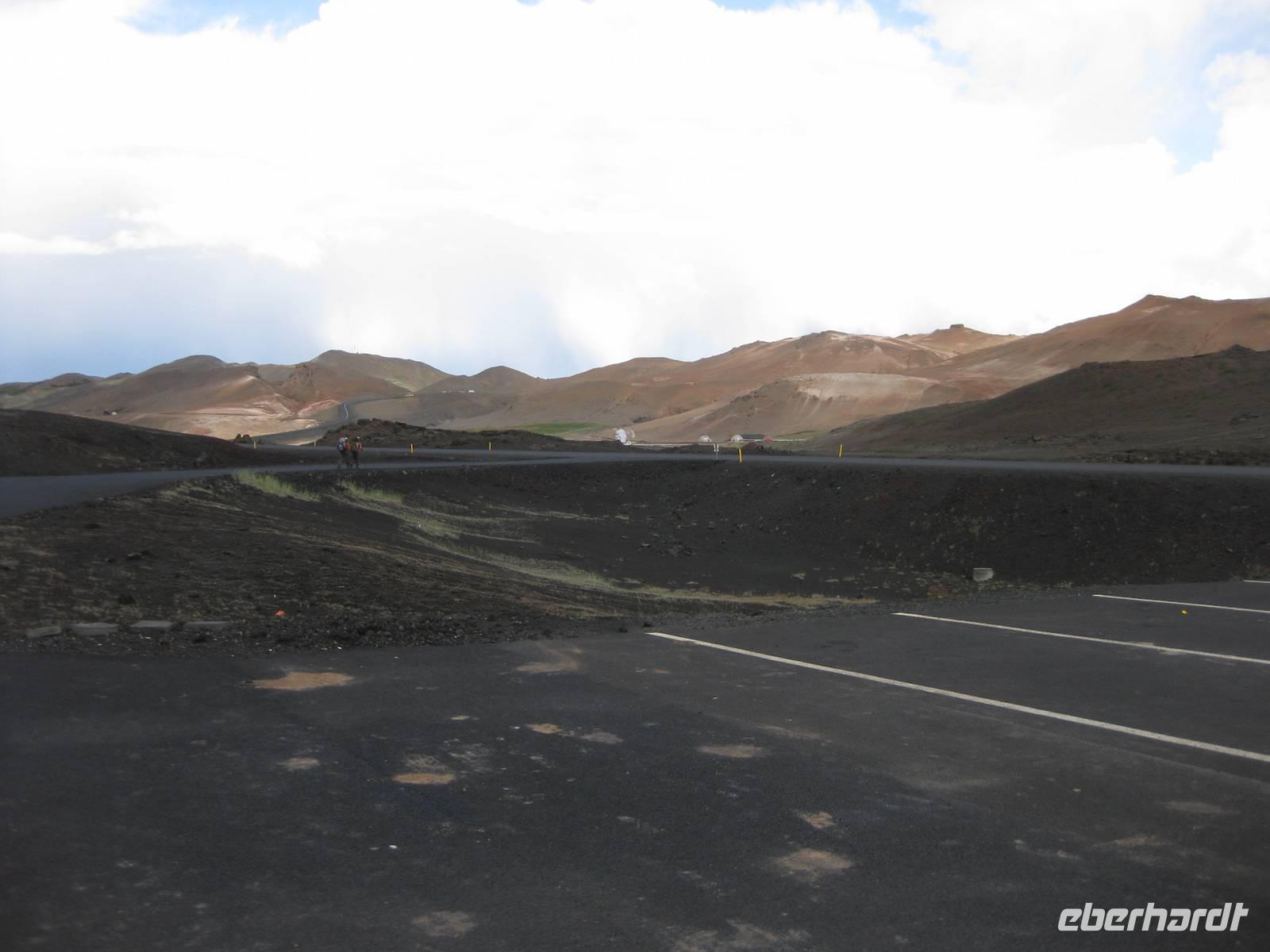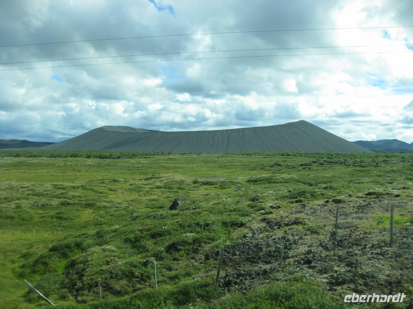 Nach dem Baden fahren wir zum Hochtemperaturgebiet Hverir. Hier brodeln überall heiße Schlammquellen und es riecht nach Schwefel. So muss es in des Teufels Küche sein. Leider prasselt hier ein Regenschauer auf uns nieder, so dass wir den Besuch schneller beenden müssen - schade. Die Sonne ist aber schnell wieder da. Langsam begeben wir uns wieder auf die Rückfahrt nach Akureyri. Zunächst fahren wir weiter auf der Straße rund um den Myvatn-See. Wir legen noch einige Fotostopps ein. Pünktlich zum Abendessen sind wir wieder im Edda-Hotel Akureyri.