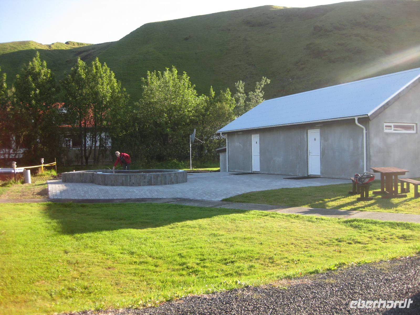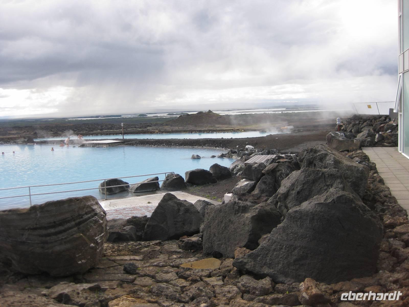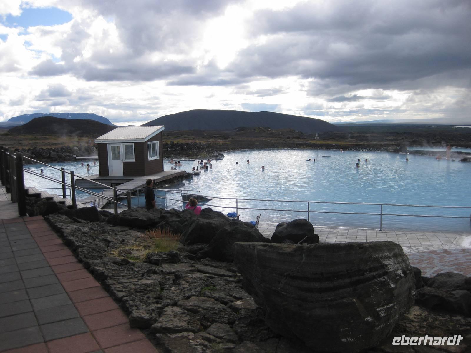 Unser nächstes Ziel ist die Badelandschaft „Jardbödin", das Pendant zur „Blauen Lagune" im Norden Islands. Alle Gäste kommen mit in's Bad. Das warme Wasser ist mit 36-40 Grad C gerade angenehm, denn heute ist es recht kühl. Wir verweilen im warmen Wasser und genießen es. Natürlich müssen wir auch die „heißen Pötte" ausprobieren. Wir haben viel Spaß.