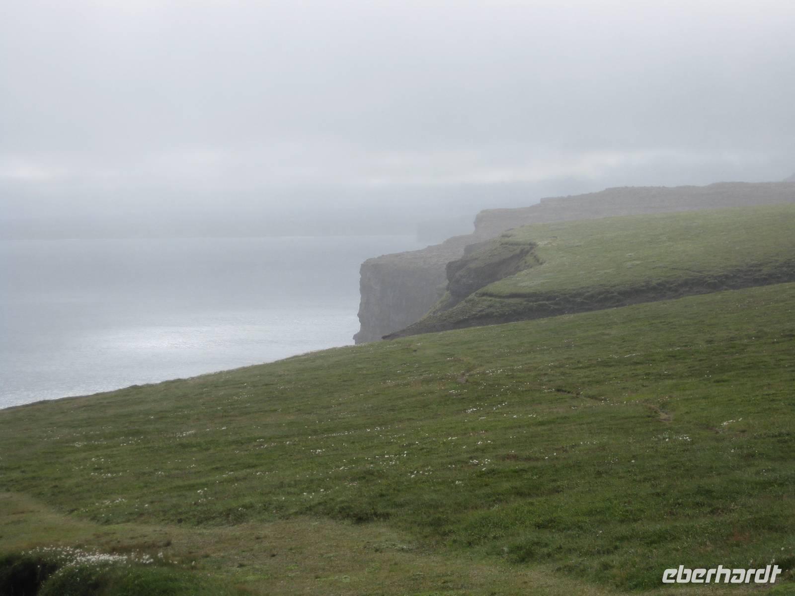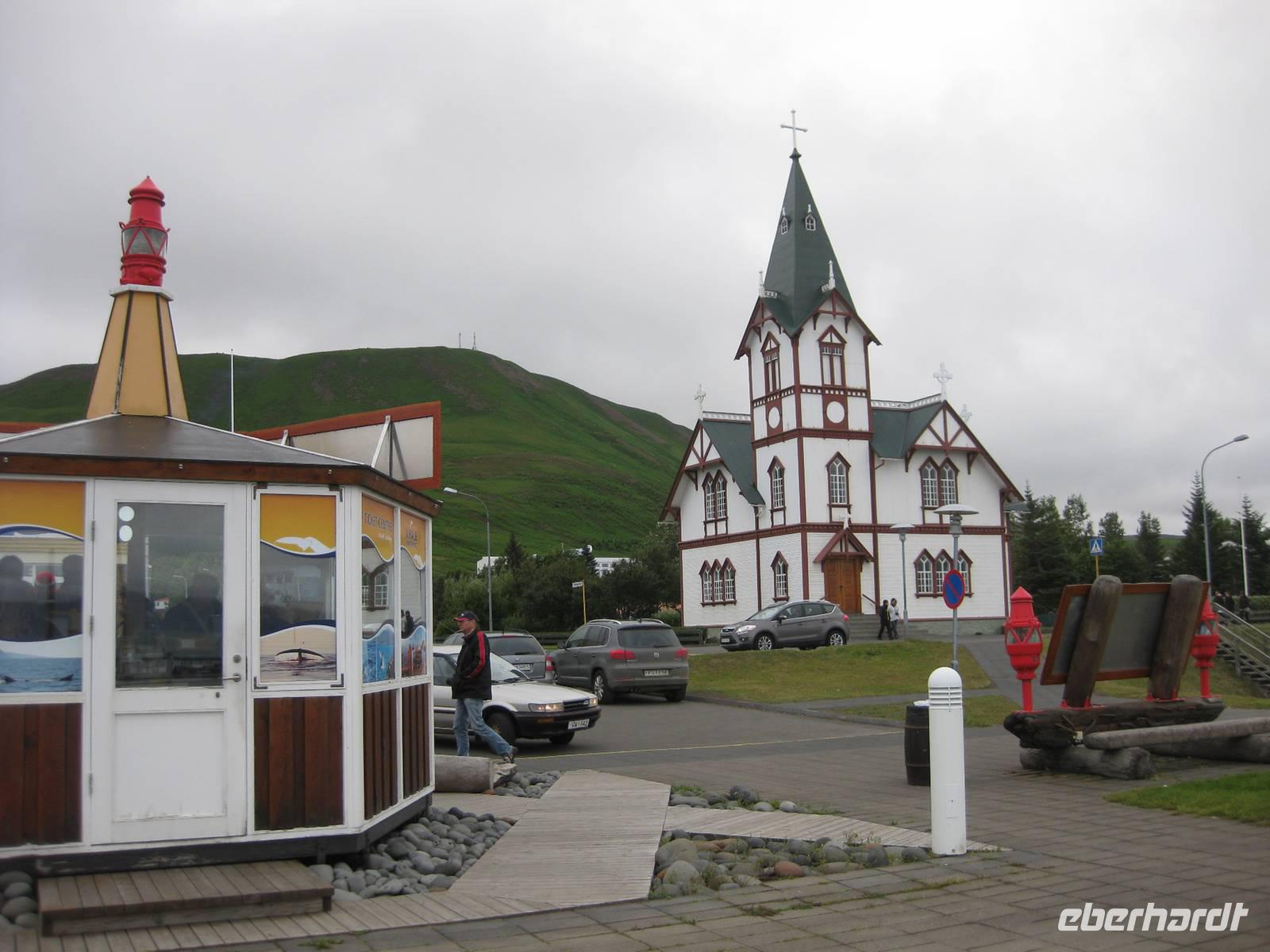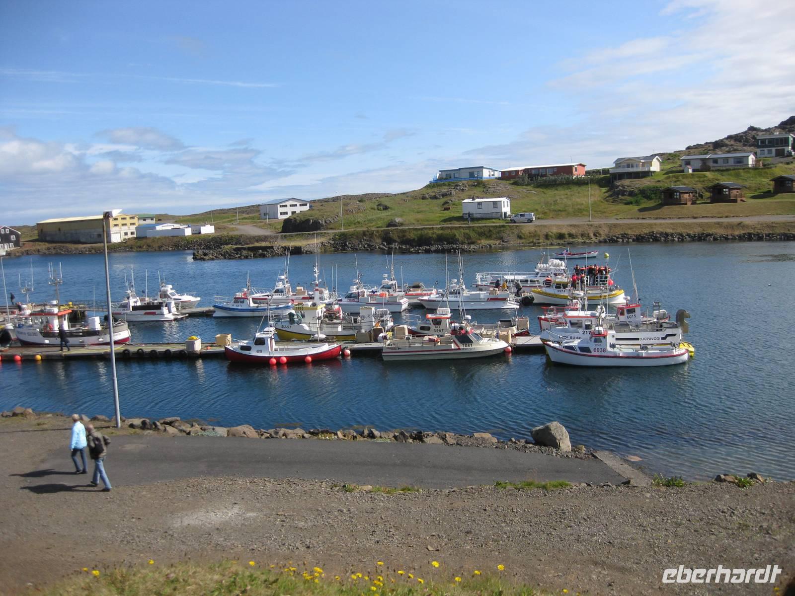 Auf dem Weg nach Husavik erzählt uns Rosa die Lebensgeschichte des berühmten isländischen Dichters Jon Sveinsson, genannt „Nonni", der in Akureyri aufgewachsen ist und gelebt hat. Dann erreichen wir Husavik, ein kleines Städtchen schon sehr im Norden Islands. Hier machen wir eine Pause. Wir haben Zeit, um den Hafen und die kleine Kirche zu besichtigen. Auch der Besuch des Walmuseums ist möglich - alles sehr interessant. Dann fahren wir weiter an der Küste entlang und kommen zum nördlichsten Punkt unserer Reise. Wir schauen an den Küstenfelsen, ob wir die Papageientaucher sehen.