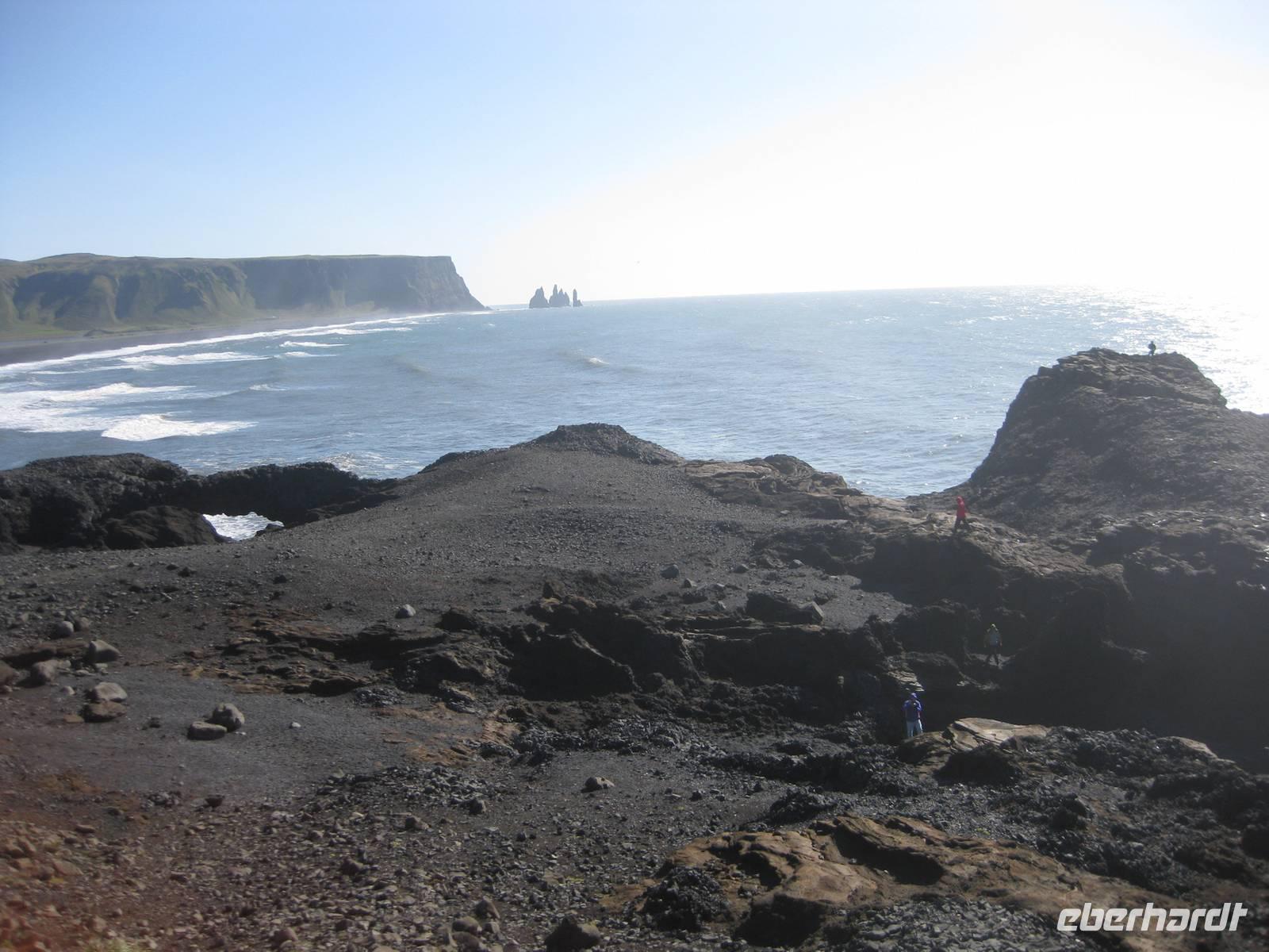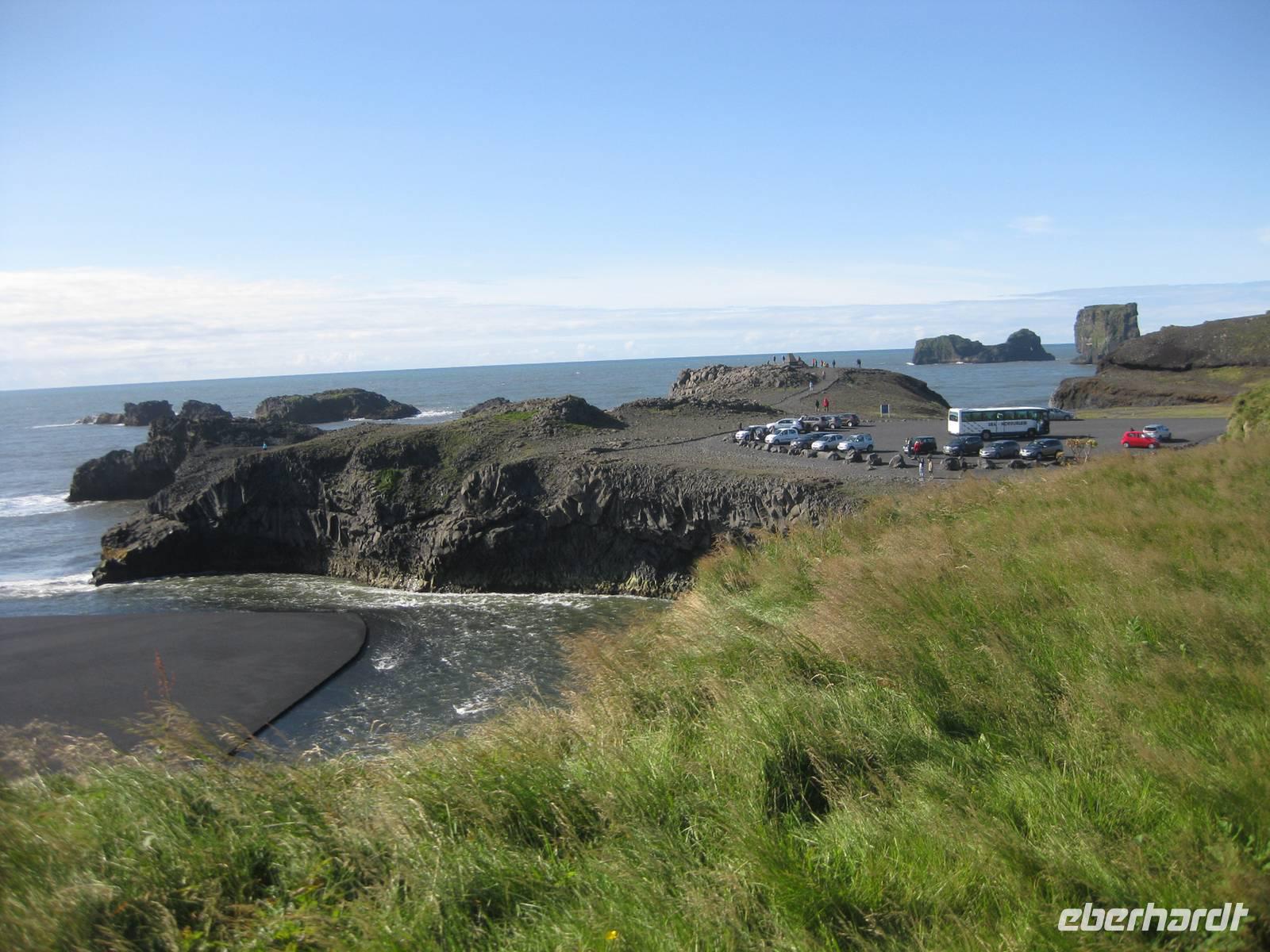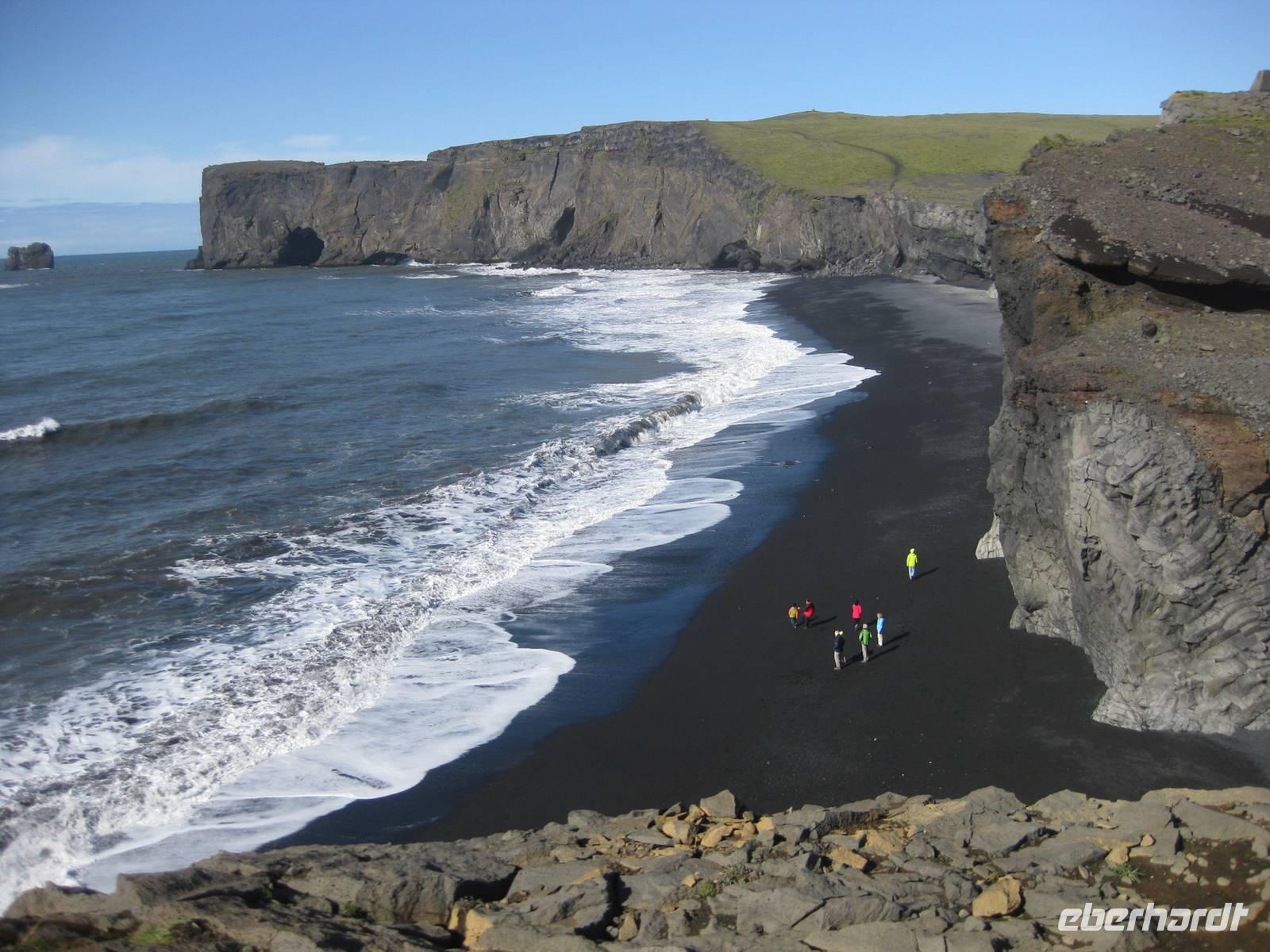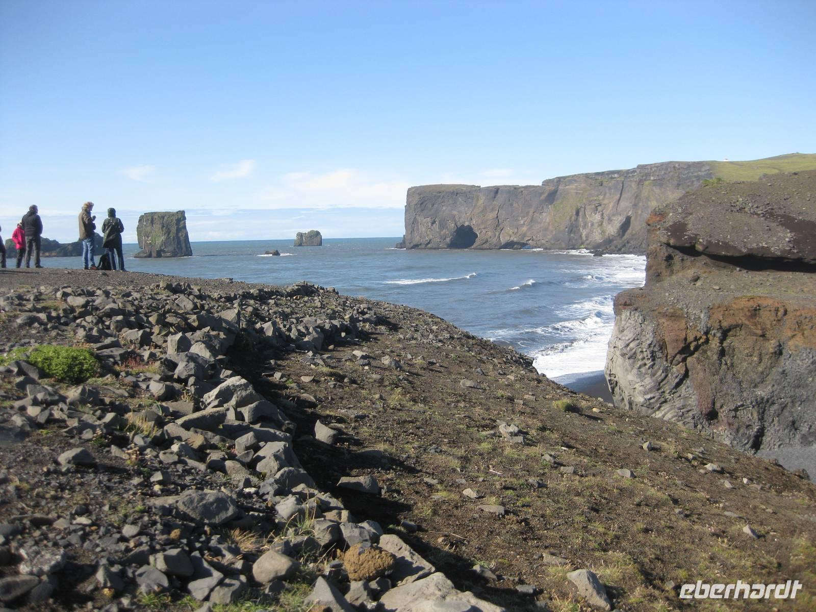 Dann geht die Fahrt weiter zur Halbinsel „Dyrholaey", Islands Südkap. Wir erleben einen grandiosen Blick auf die Gletscher Myrdal mit dem Vulkan Katla im Inneren und auf den „Eyjafjallajökull", der 2010 die Welt in Atem hielt. Von „Dyrholaey" aus hat man auch eine Superaussicht auf die schwarze Sanderküste und auf das markante, von der Brandung geschlagene Felsentor. Hier leben auch viele Seevögel, leider sind die Papageientaucher nicht da.