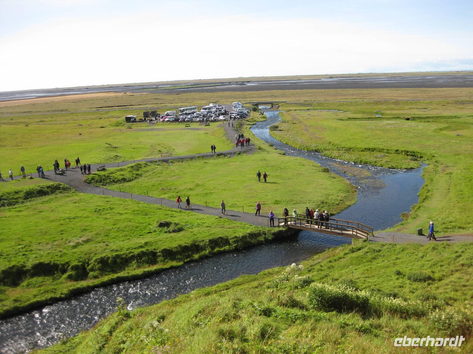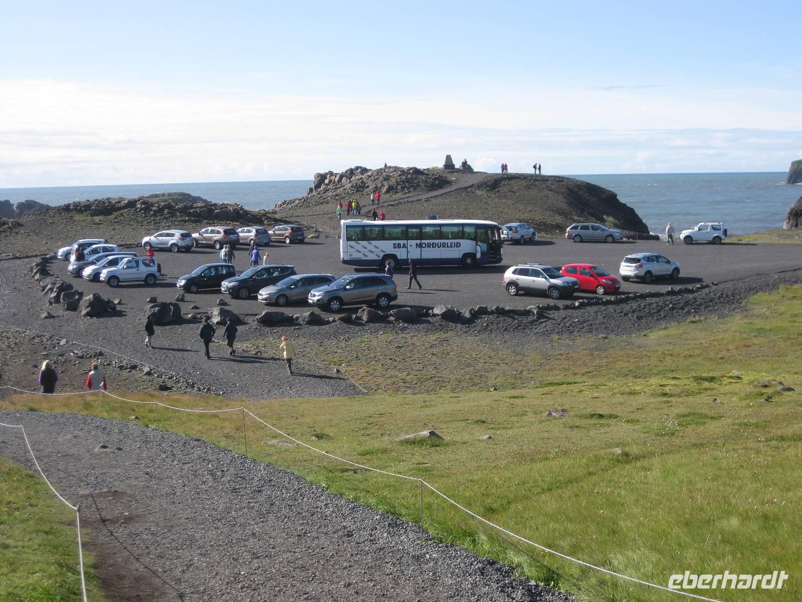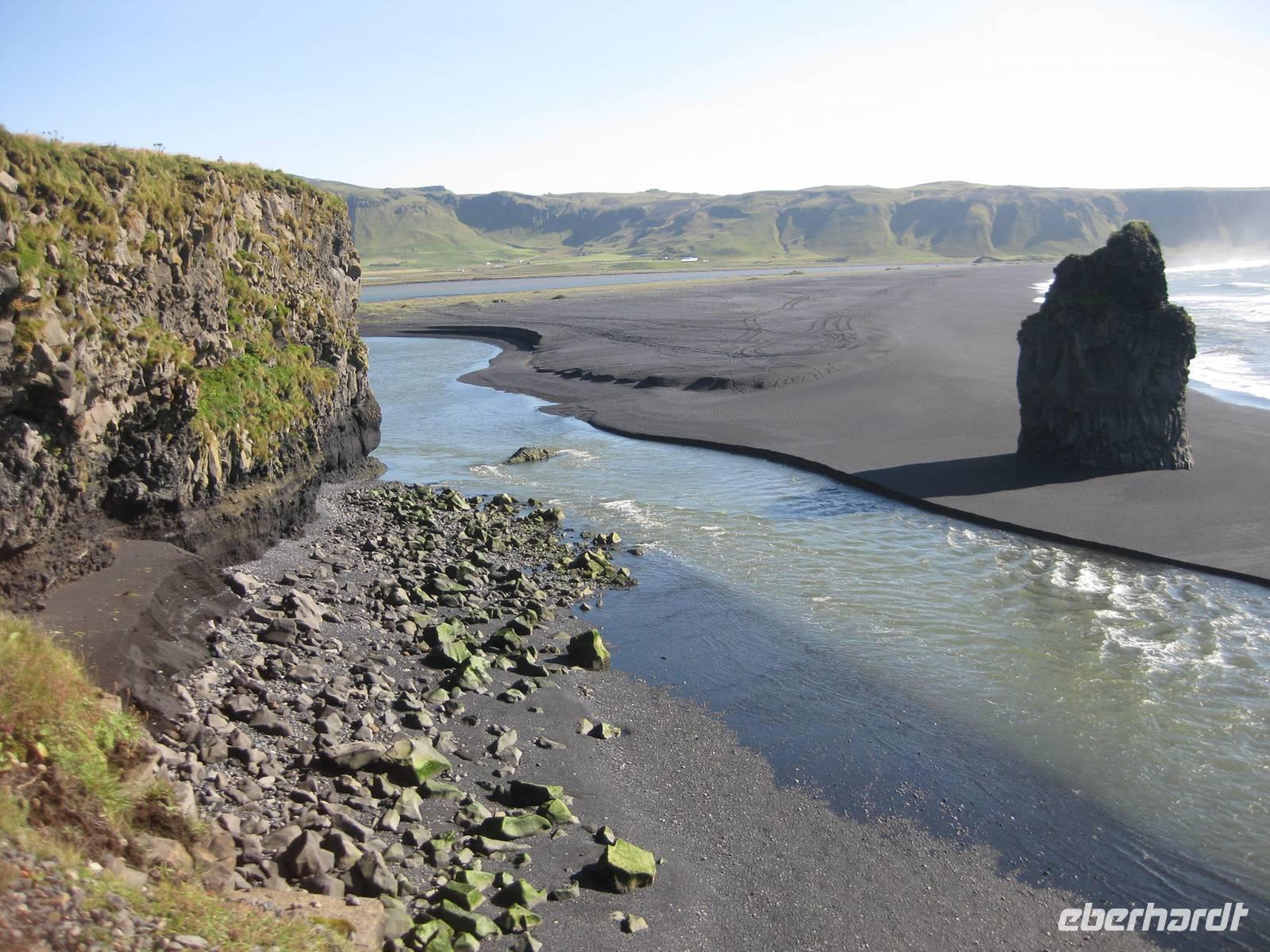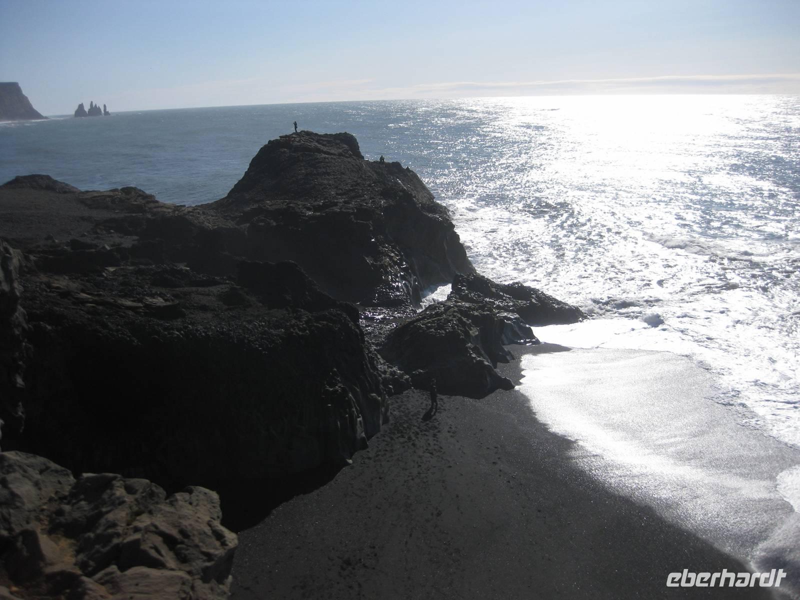 Dann geht die Fahrt weiter zur Halbinsel „Dyrholaey", Islands Südkap. Wir erleben einen grandiosen Blick auf die Gletscher Myrdal mit dem Vulkan Katla im Inneren und auf den „Eyjafjallajökull", der 2010 die Welt in Atem hielt. Von „Dyrholaey" aus hat man auch eine Superaussicht auf die schwarze Sanderküste und auf das markante, von der Brandung geschlagene Felsentor. Hier leben auch viele Seevögel, leider sind die Papageientaucher nicht da.
