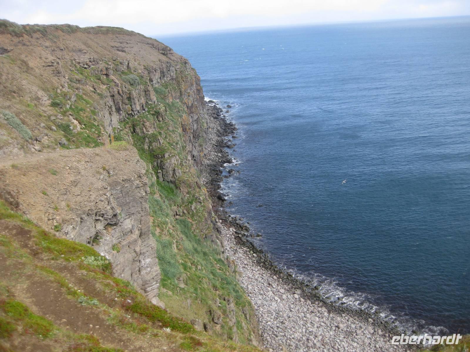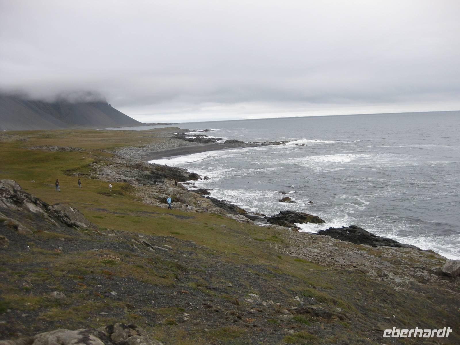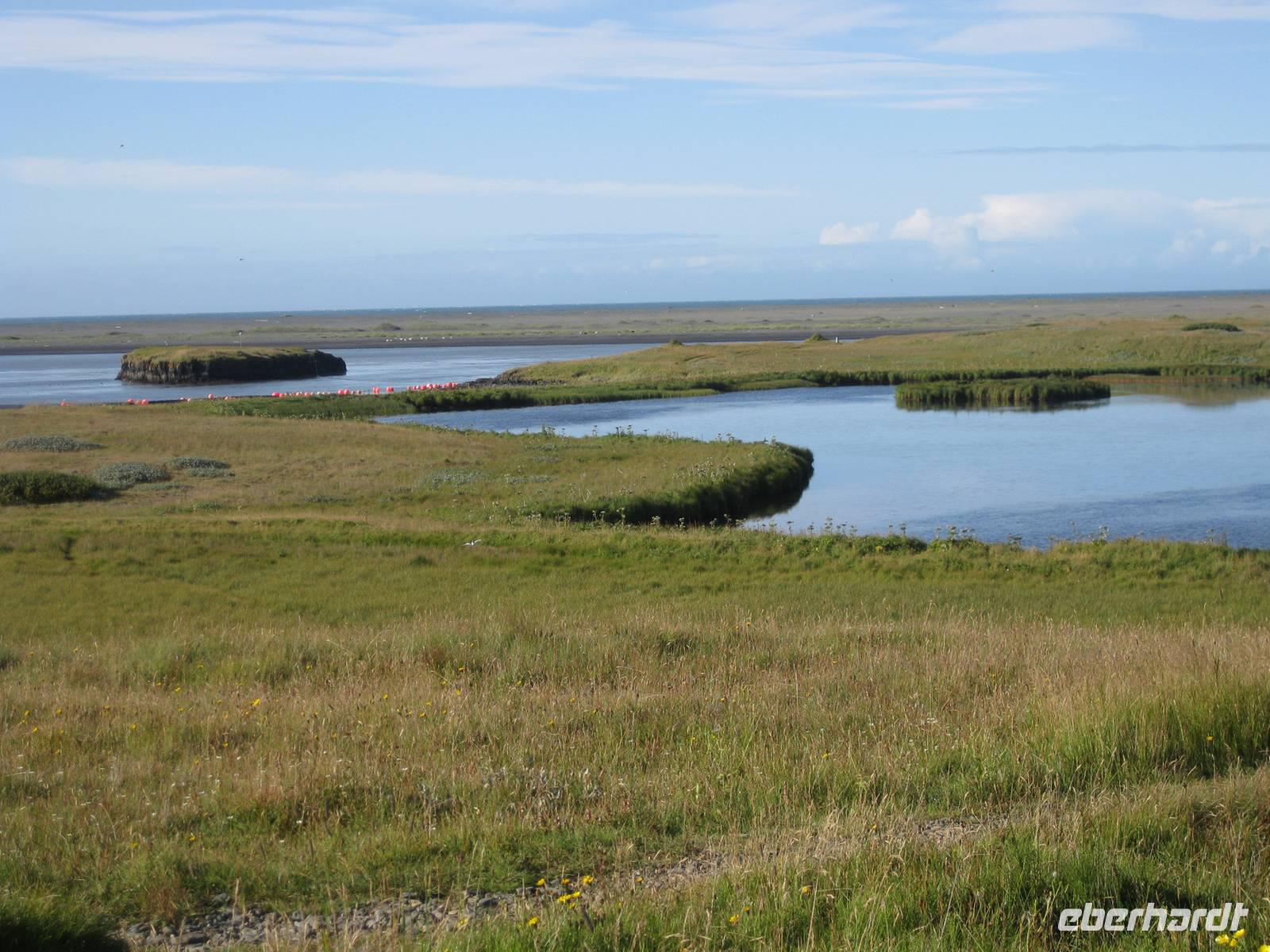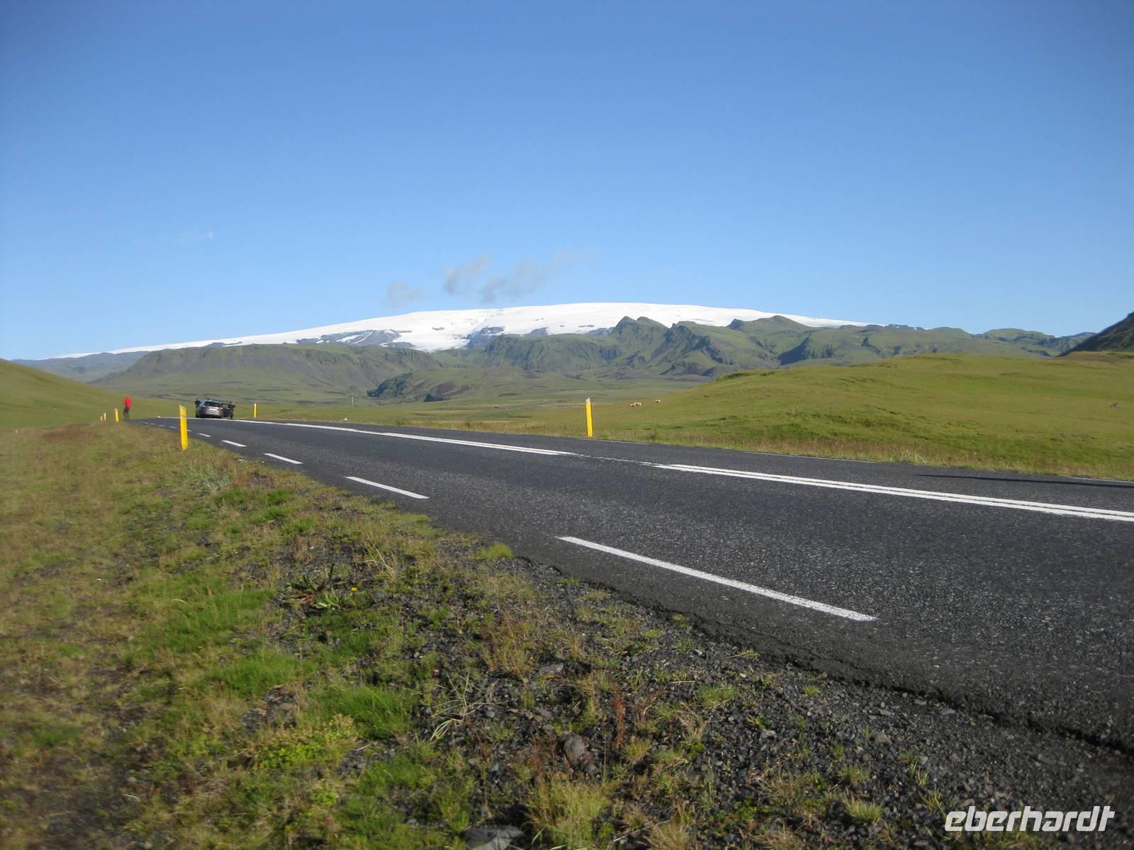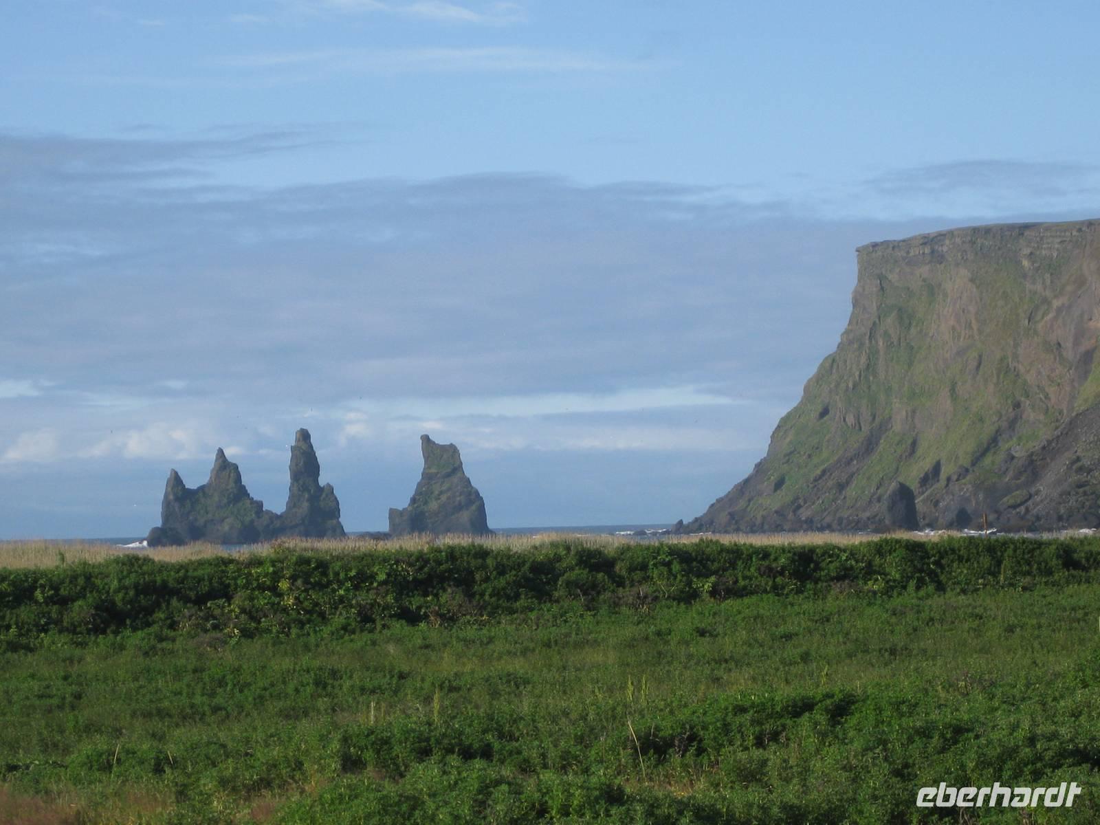 Dann geht die Fahrt weiter zur Halbinsel „Dyrholaey", Islands Südkap. Wir erleben einen grandiosen Blick auf die Gletscher Myrdal mit dem Vulkan Katla im Inneren und auf den „Eyjafjallajökull", der 2010 die Welt in Atem hielt. Von „Dyrholaey" aus hat man auch eine Superaussicht auf die schwarze Sanderküste und auf das markante, von der Brandung geschlagene Felsentor. Hier leben auch viele Seevögel, leider sind die Papageientaucher nicht da.