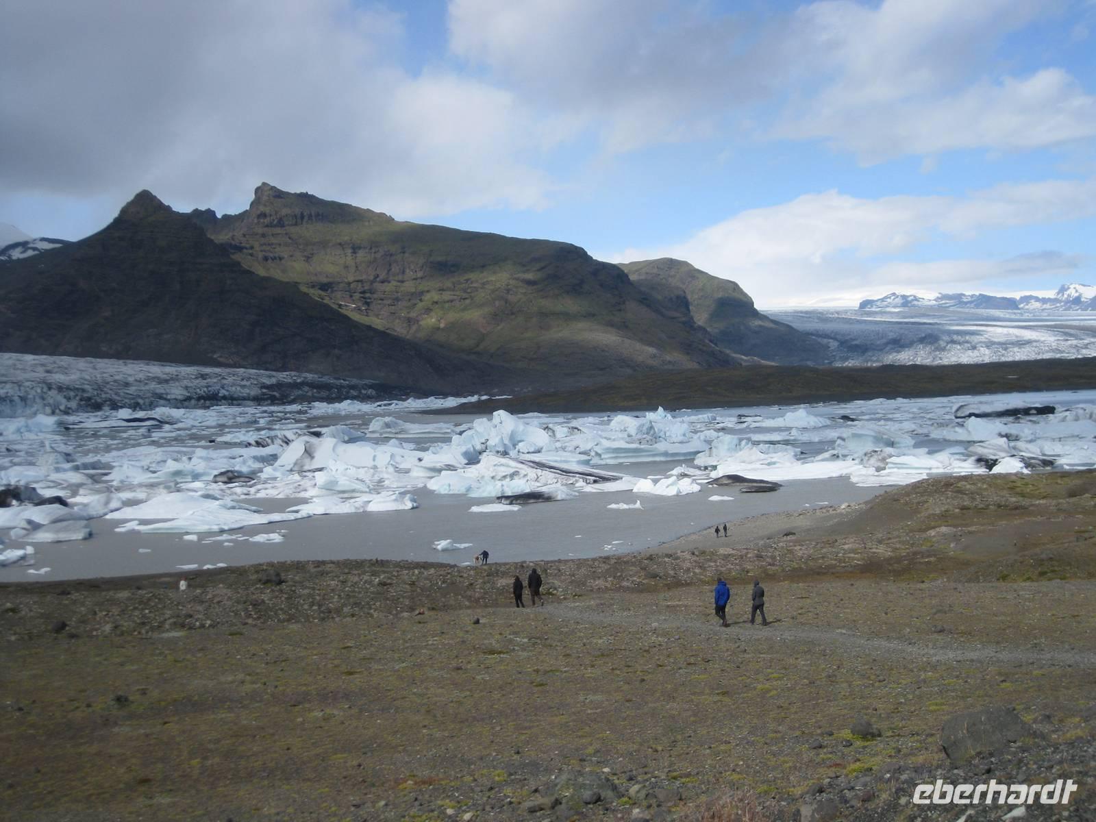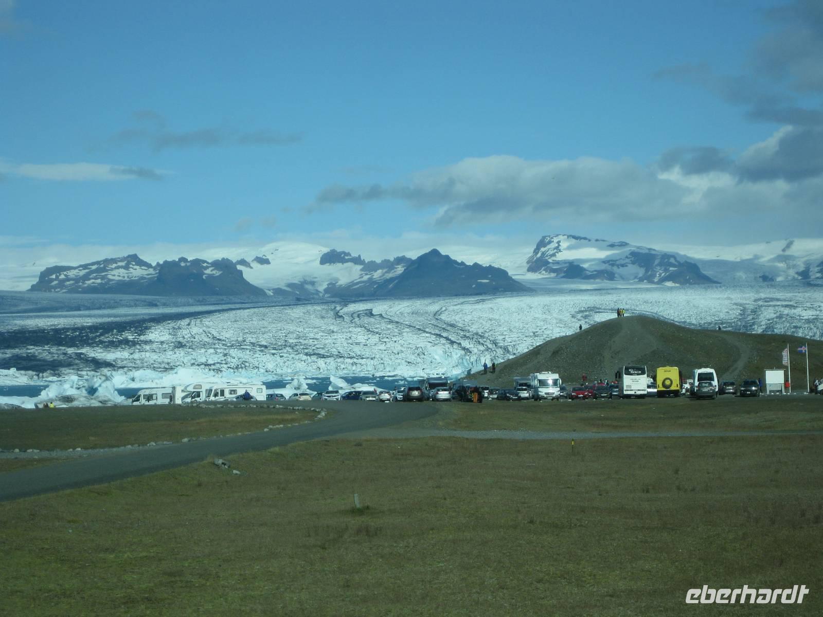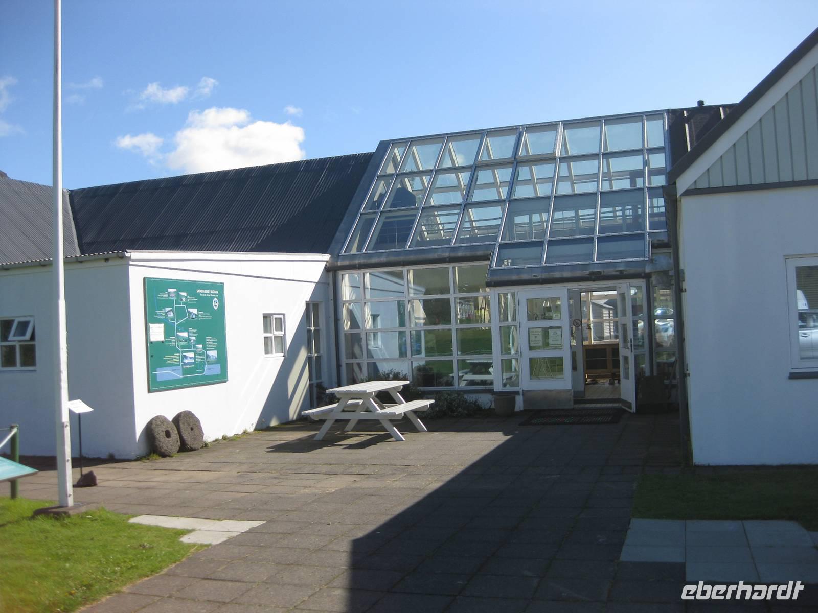 Auf unserer weiteren Fahrt besuchen wir noch mehrere Gletscherseen und fahren auch ganz dicht an eine Gletscherzunge heran. Nach der Mittagspause erreichen wir das Visitor Centre des Nationalparks Skaftafell. Hier machen wir noch einmal Stopp. Es gibt eine Filmdokumentation über den Vulkanausbruch im Jahr 1996, eine Ausstellung und viel Infomaterial. Bei schönem Wetter kann man von hier aus den höchsten Berg Islands, den vergletscherten Hvannadalshnukur mit seinen 2.119 Metern Höhe sehen.