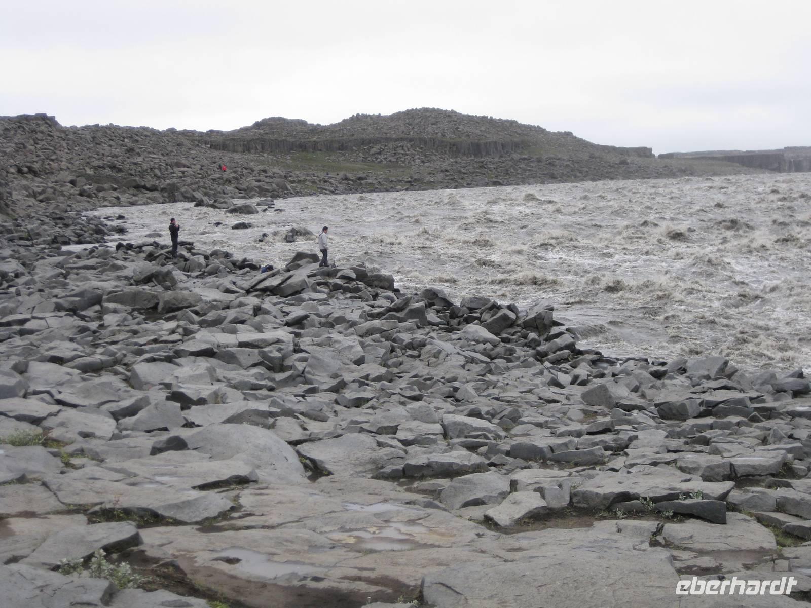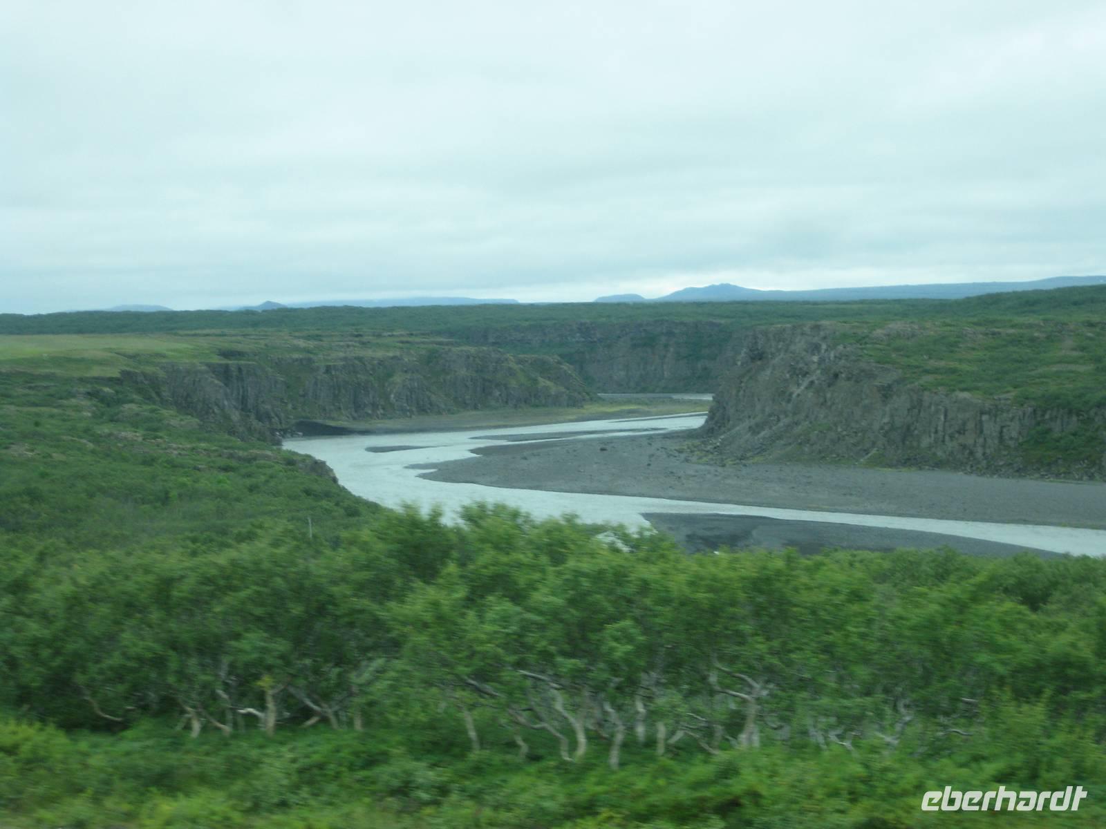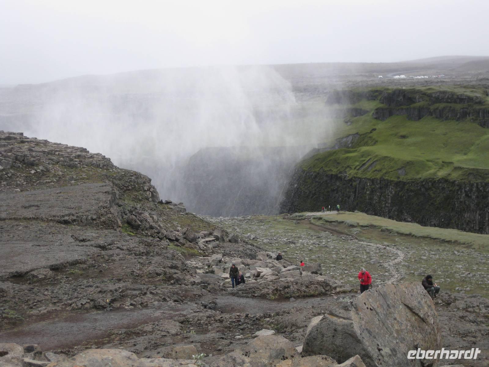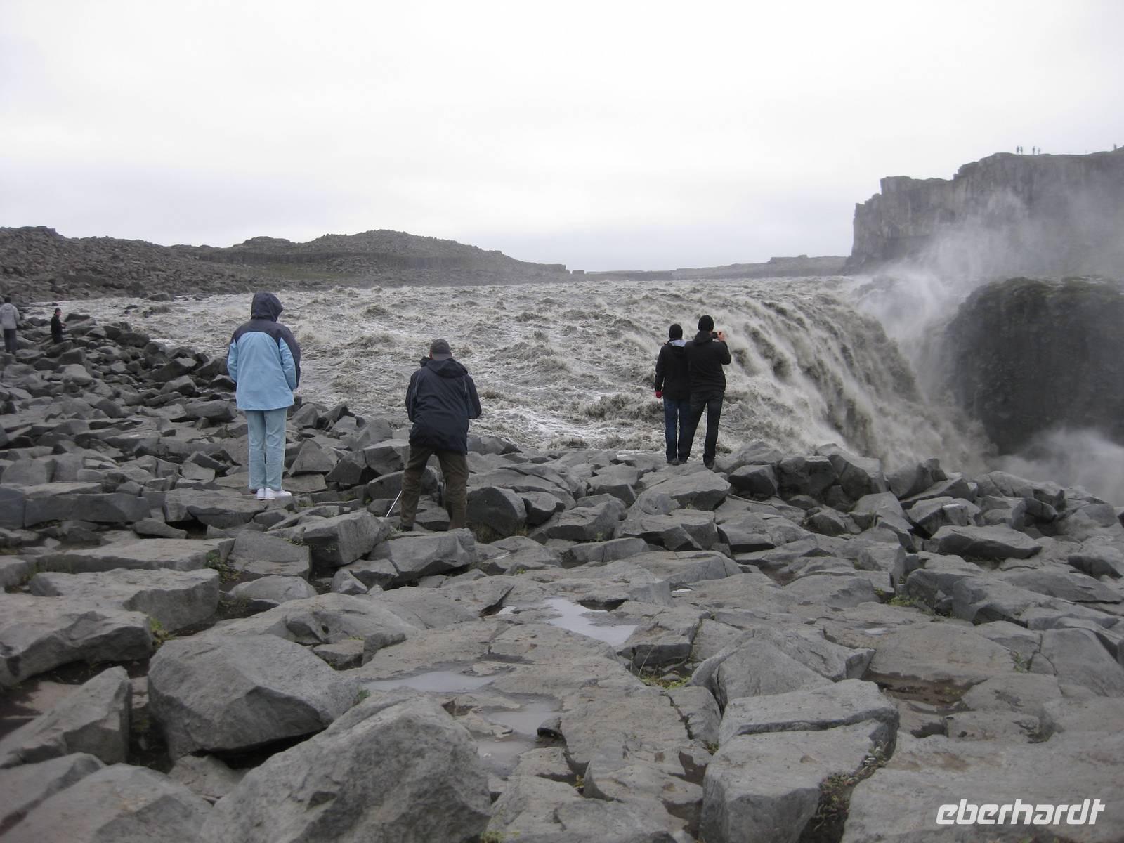 Nachdem wir uns gestärkt haben, setzen wir unsere Fahrt fort. Unser nächstes Ziel ist der „Dettifoss" -Wasserfall. Der befindet sich auch im Nationalpark Jökulsargljufur. Er ist nur auf einer Schotterstraße zu erreichen. Da rumpelt es ganz schön. Mit dem Anblick des Canyons, in den der „Dettifoss" hineinstürzt und dem „Dettifoss" selbst, werden wir entschädigt. Wir lassen uns vom wasserreichsten Wasserfall Europas faszinieren. Die Fallhöhe beträgt 44 Meter. Nachdem wir ausreichend verweilt haben, geht die Fahrt weiter auf der Schotterstraße durch den Nationalpark.