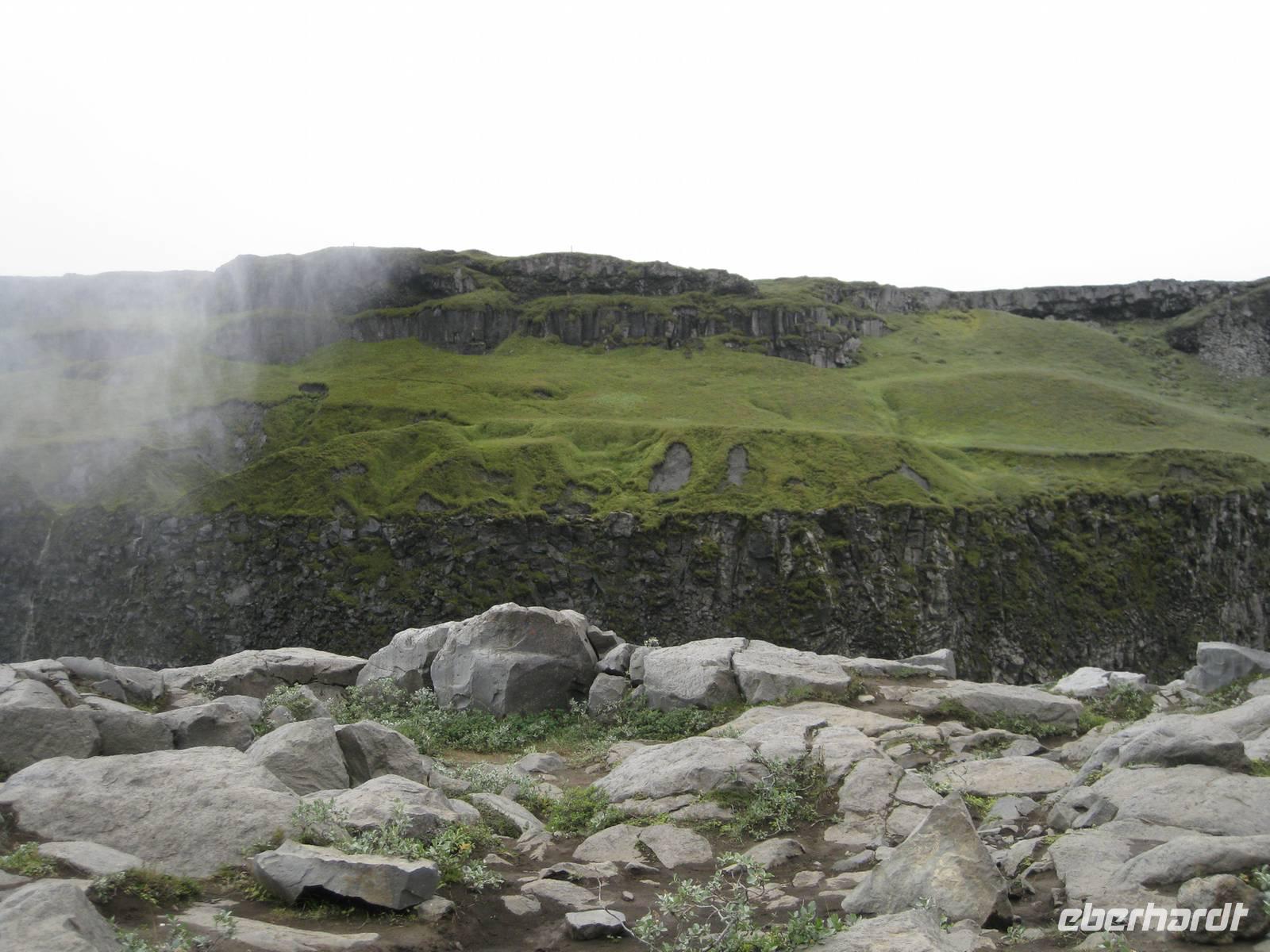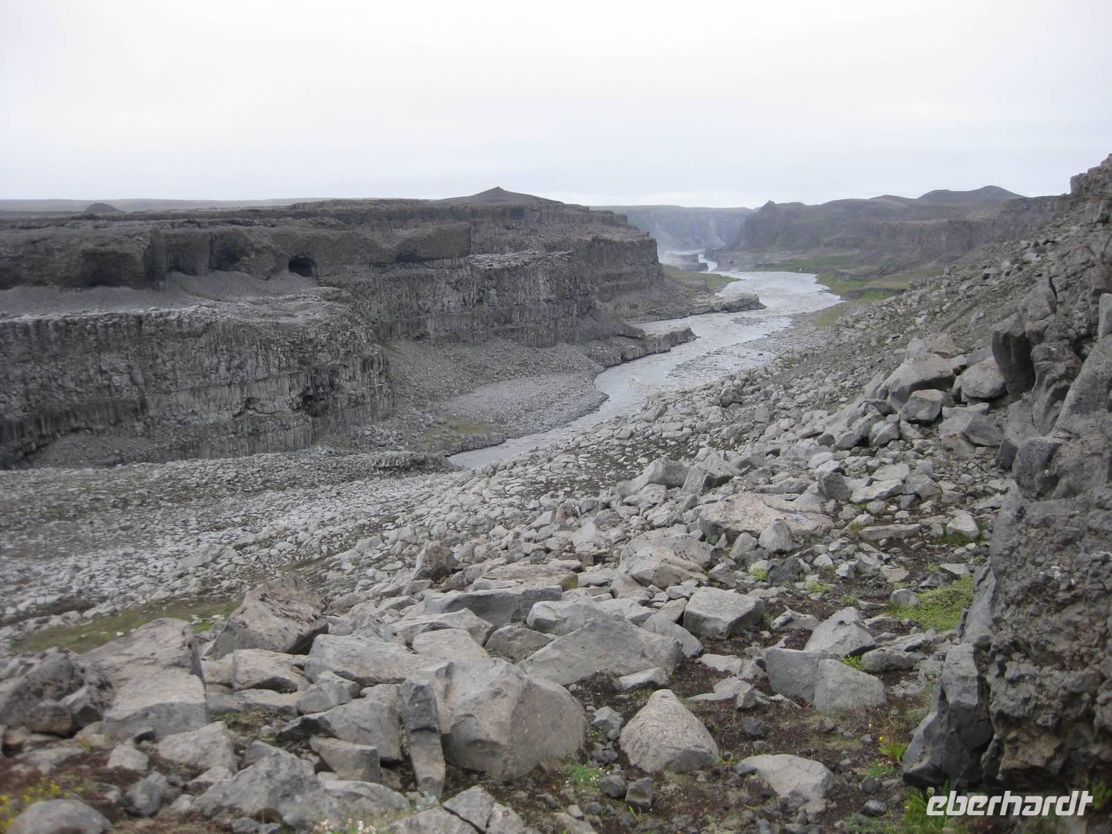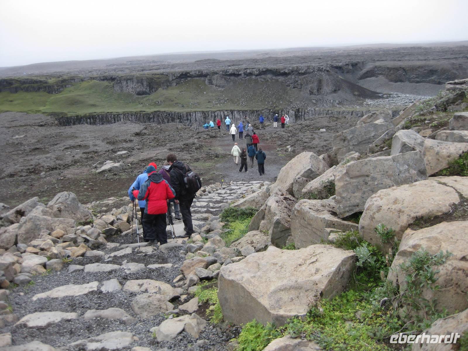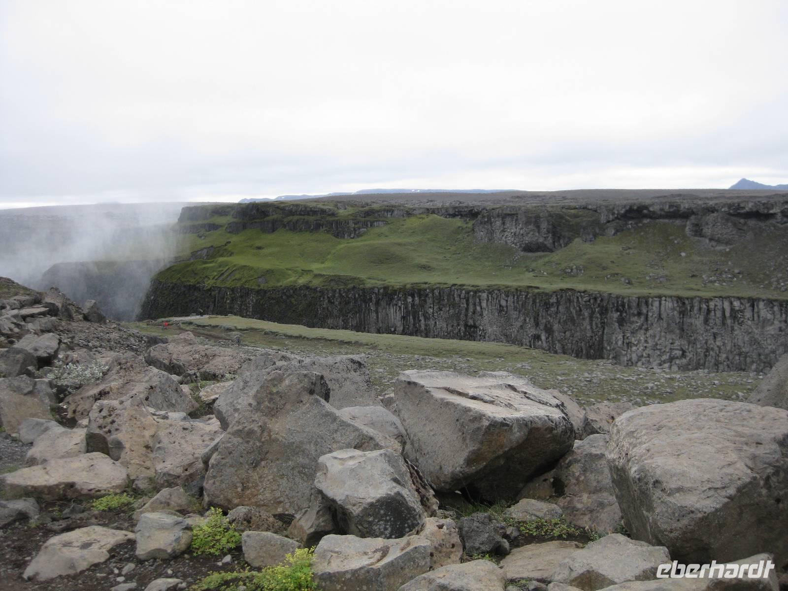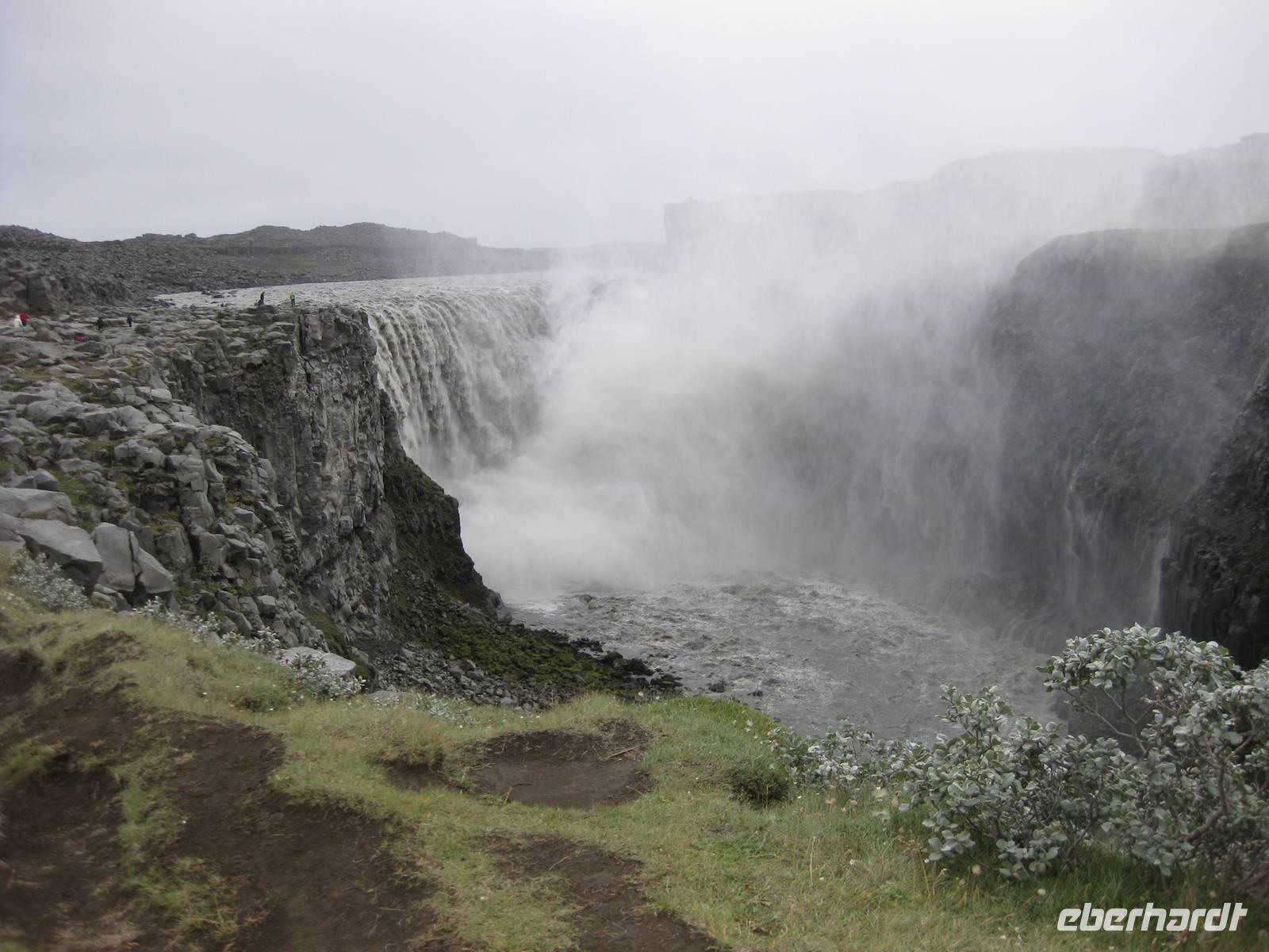 Nachdem wir uns gestärkt haben, setzen wir unsere Fahrt fort. Unser nächstes Ziel ist der „Dettifoss" -Wasserfall. Der befindet sich auch im Nationalpark Jökulsargljufur. Er ist nur auf einer Schotterstraße zu erreichen. Da rumpelt es ganz schön. Mit dem Anblick des Canyons, in den der „Dettifoss" hineinstürzt und dem „Dettifoss" selbst, werden wir entschädigt. Wir lassen uns vom wasserreichsten Wasserfall Europas faszinieren. Die Fallhöhe beträgt 44 Meter. Nachdem wir ausreichend verweilt haben, geht die Fahrt weiter auf der Schotterstraße durch den Nationalpark.