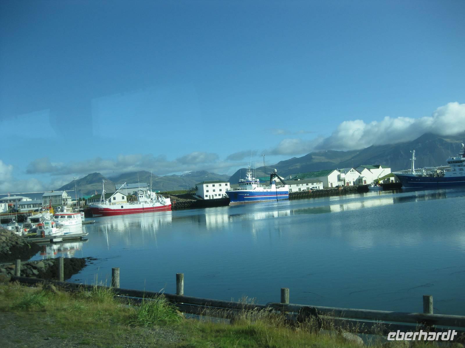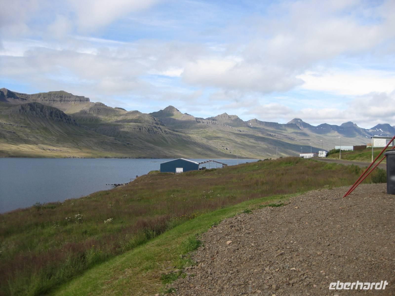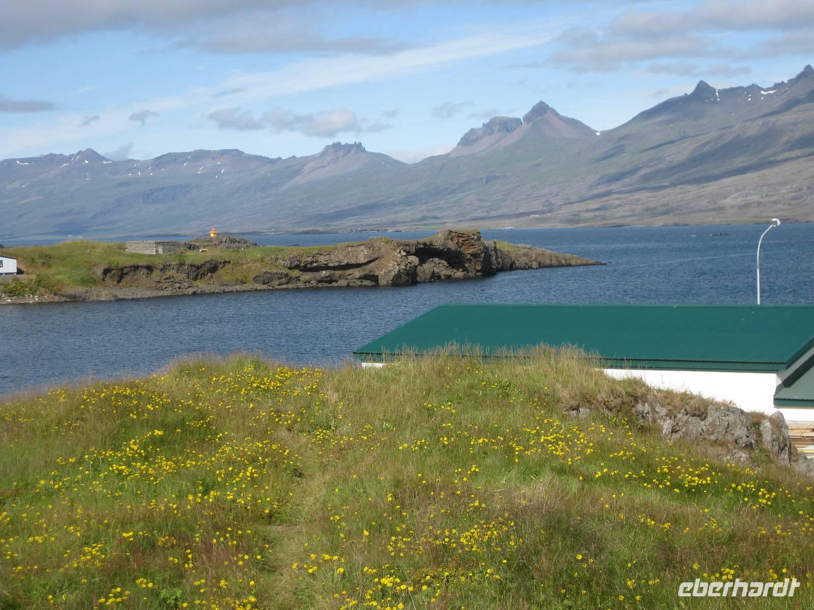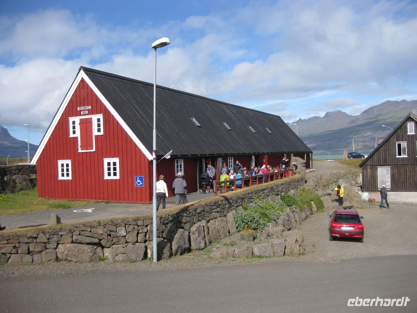 In Djupivogur machen wir Mittagspause. In der „Langabud" gibt es eine typische isländische Suppe, Lachsbrote und frische Kuchen und Torten. Djupivogur liegt direkt am Berufjördur.