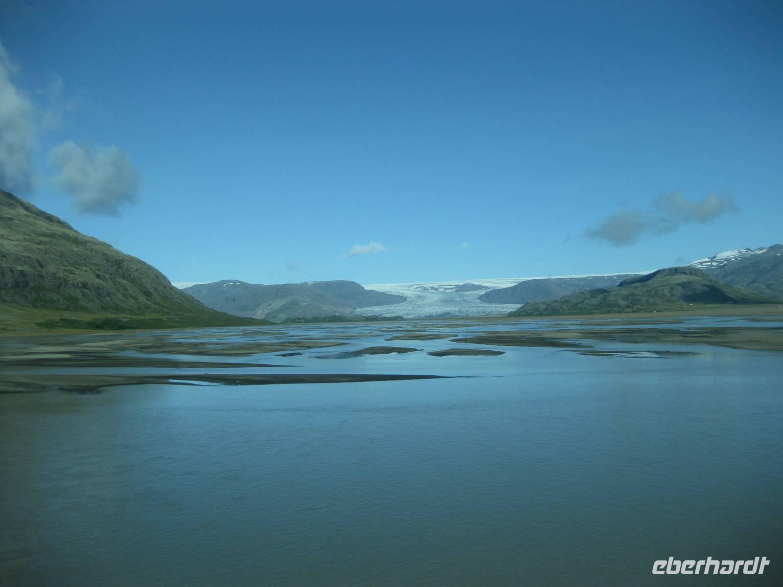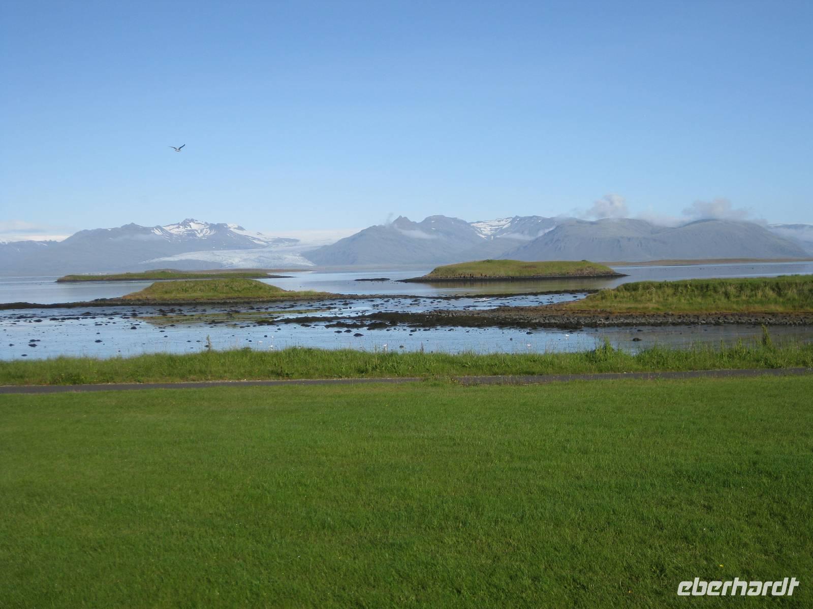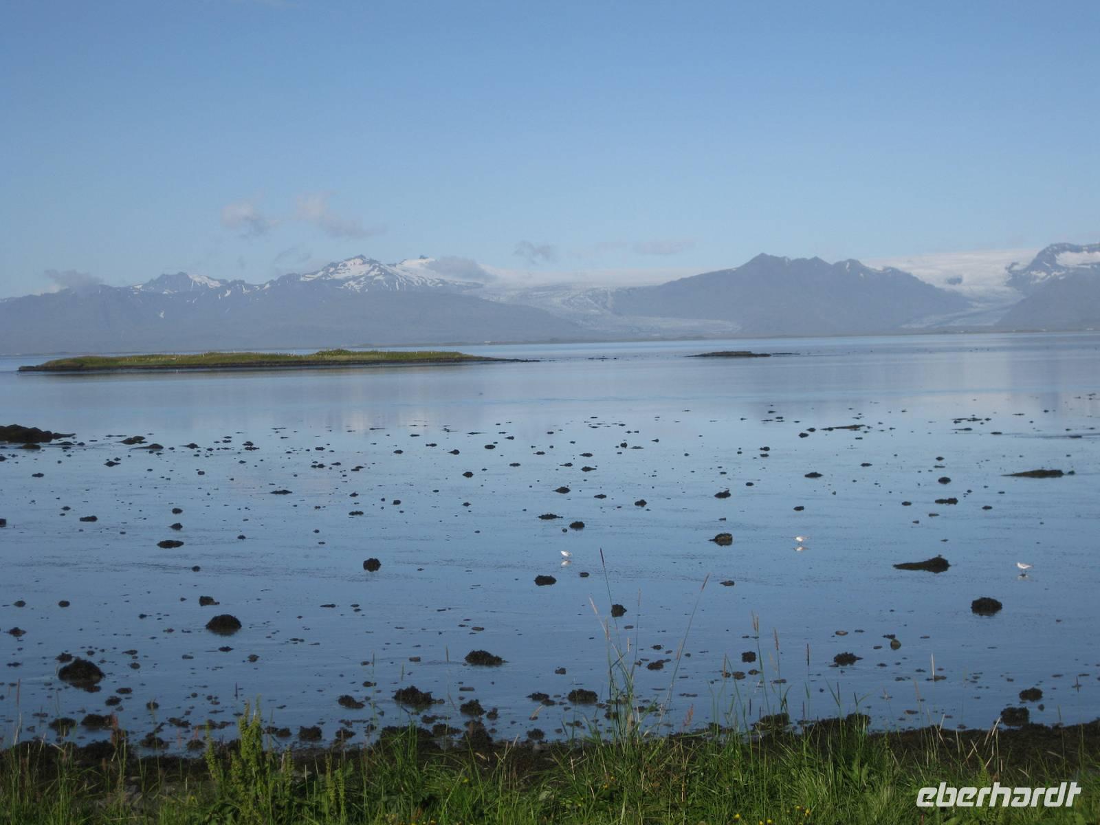 Heute Morgen werden wir von strahlendem Sonnenschein geweckt. Am Himmel sind keine Wolken zu sehen. In der Ferne zeigen sich die Gletscherzungen vom Vatnajökull, die bis fast an das Meer reichen - faszinierend.