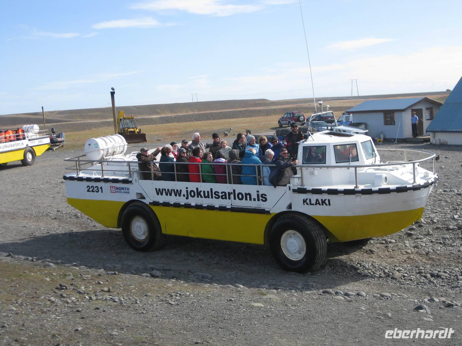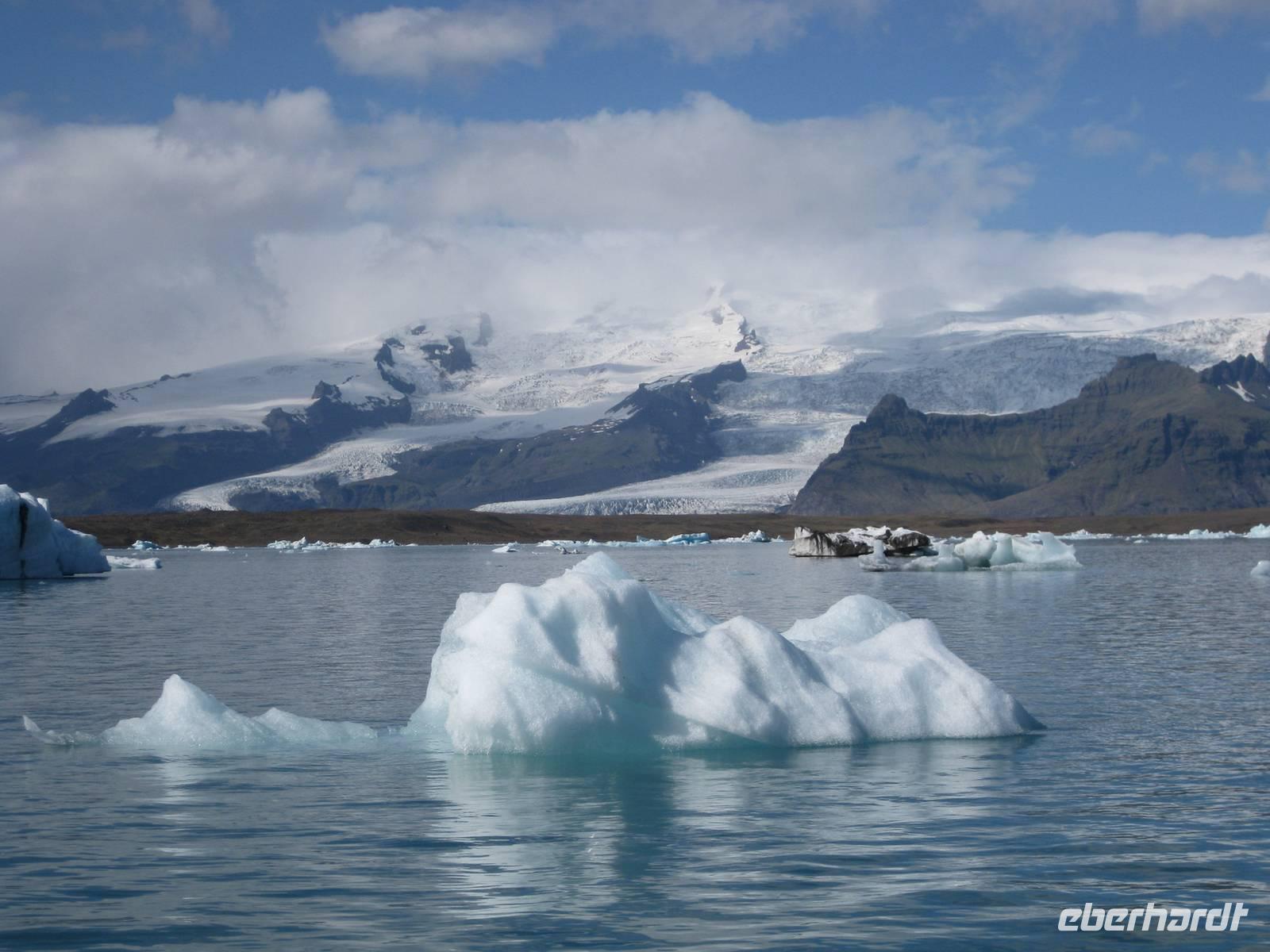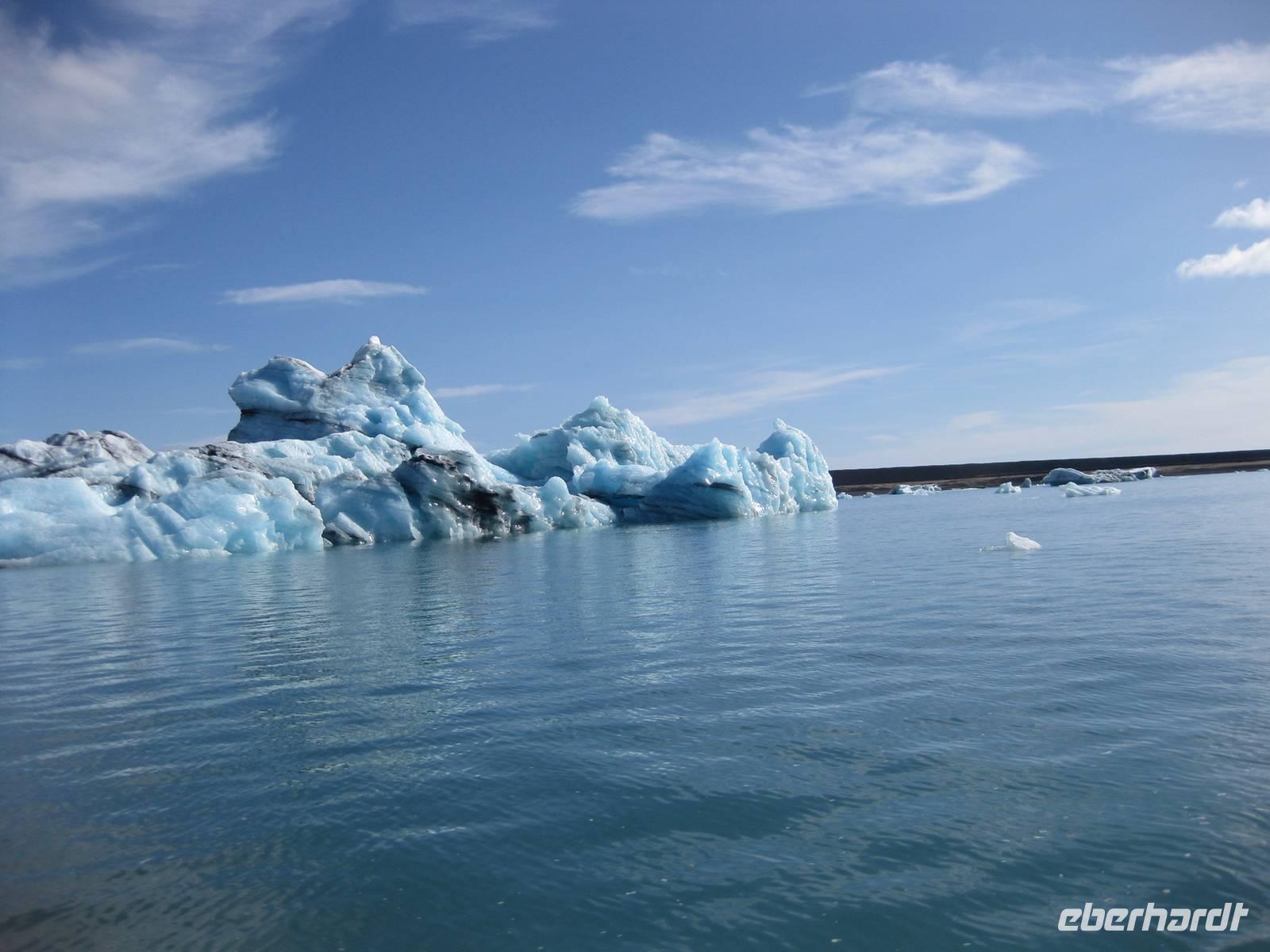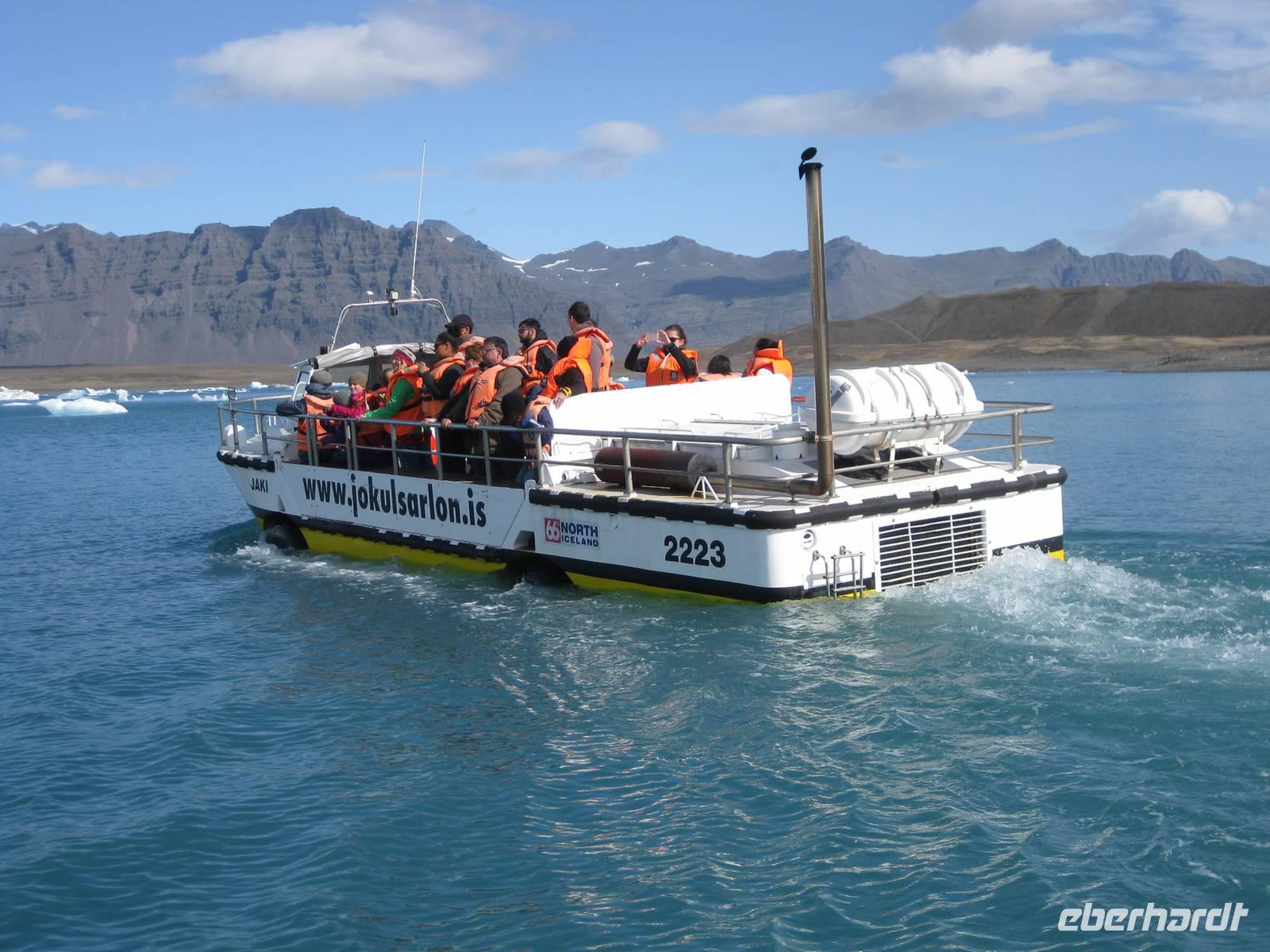 Nach knapp zwei Stunden erreichen wir den Gletschersee Jökulsarlon - die „Gletscherlagune", in dem weiße, blaue und schwarze Eisberge sind. Mit Amphibienfahrzeugen können wir den See erkunden. Wir werden ganz dicht an die Eisberge herangefahren. Ein „Serviceboot" bringt glasklares Gletschereis zu unserem Fahrzeug. Wir nehmen eine Kostprobe. Nach dem Ausflug auf der „Gletscherlagune" treffen wir uns wieder an Land und nehmen eine Probe vom Brennivin, dem berühmt berüchtigten Schnaps Islands, mit Gletschereis. Eine tolle Überraschung finden die Gäste.