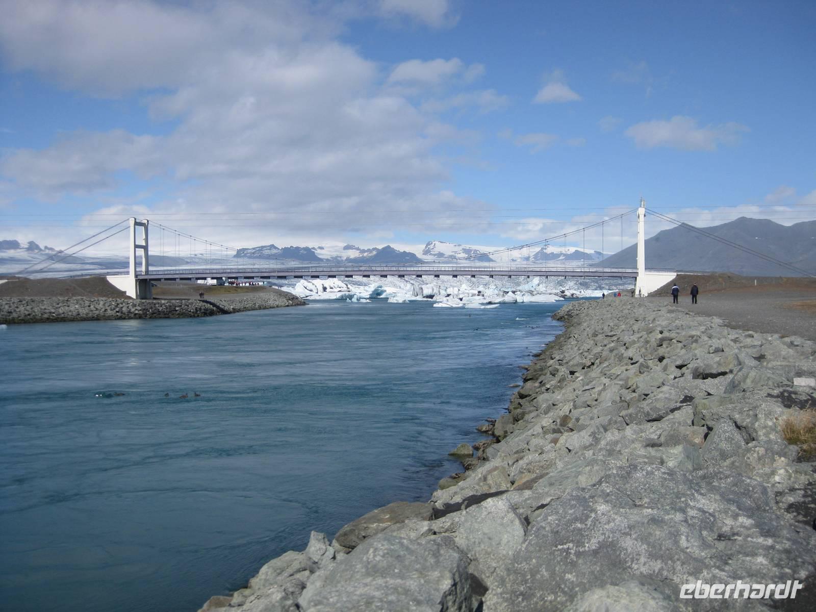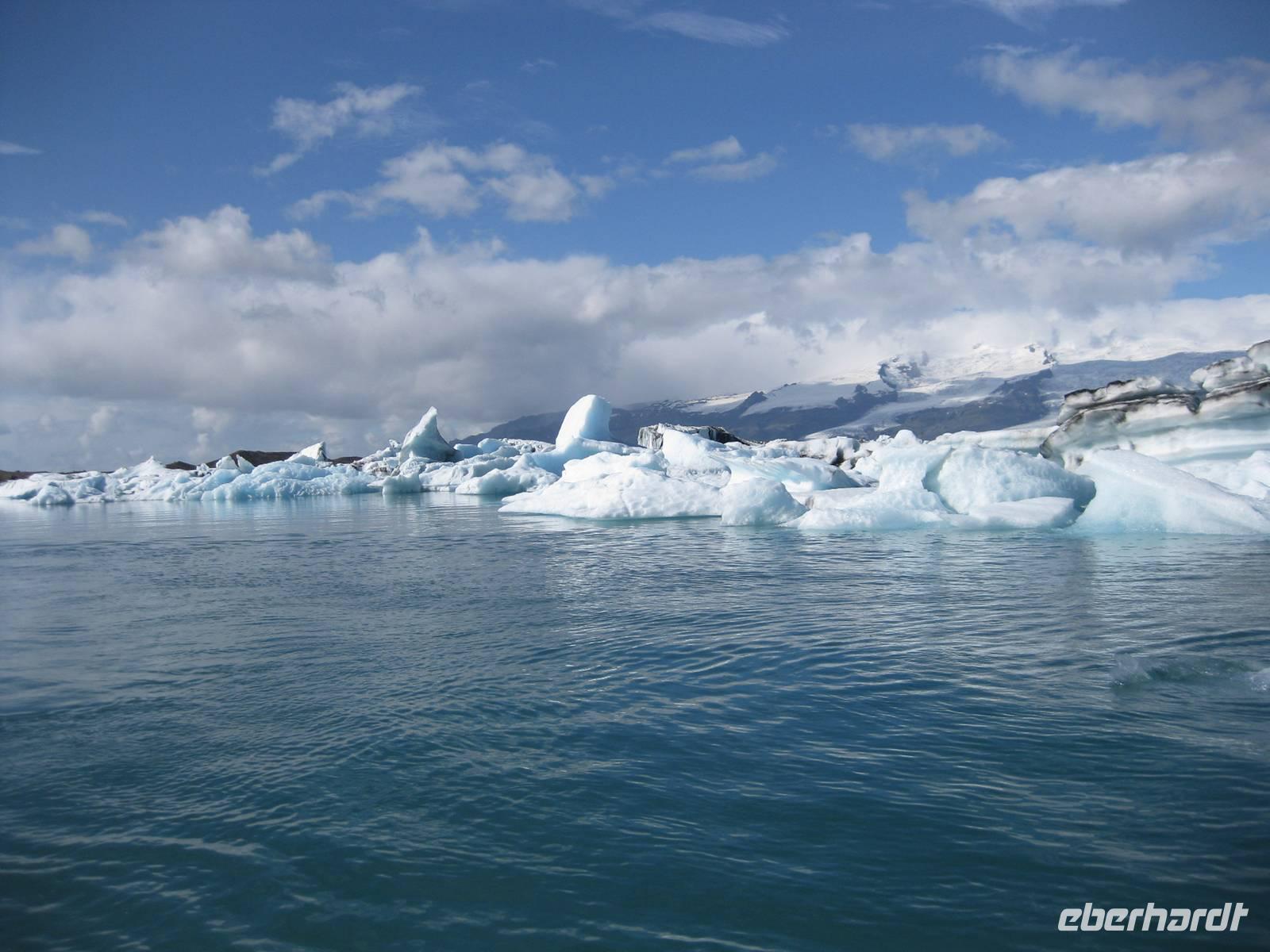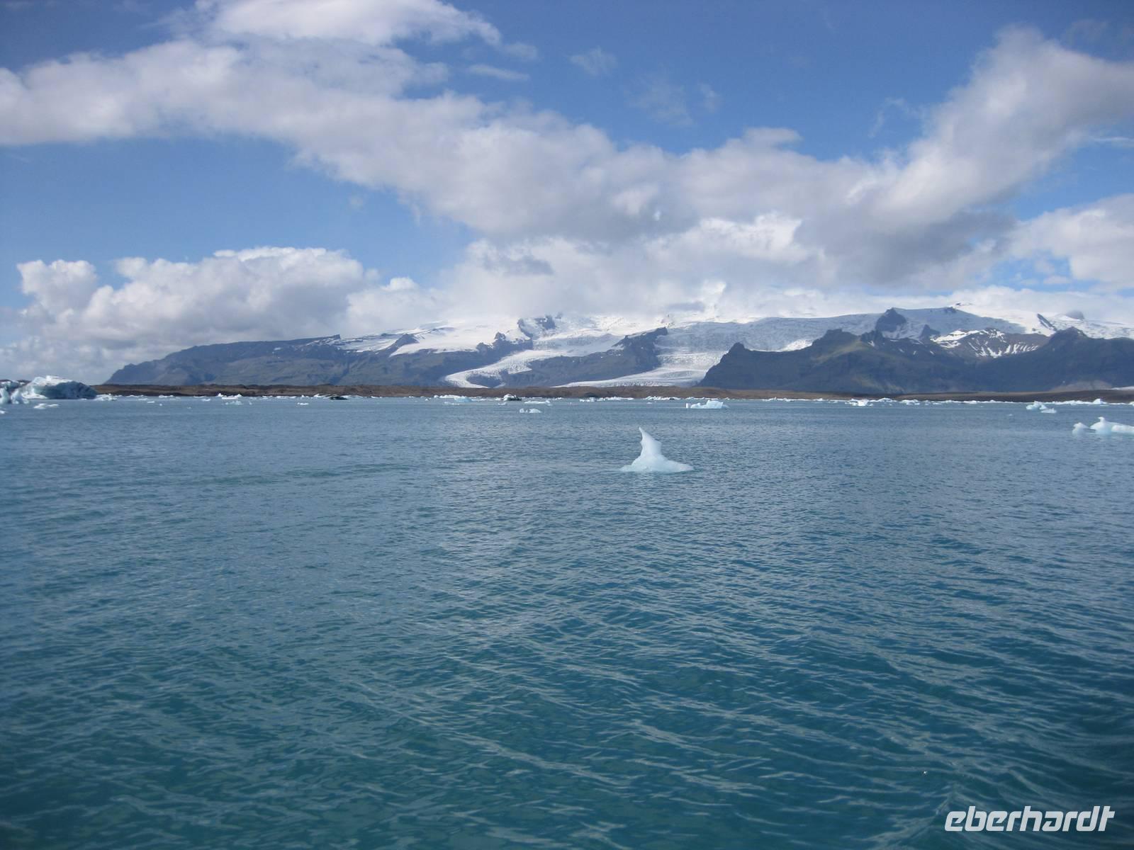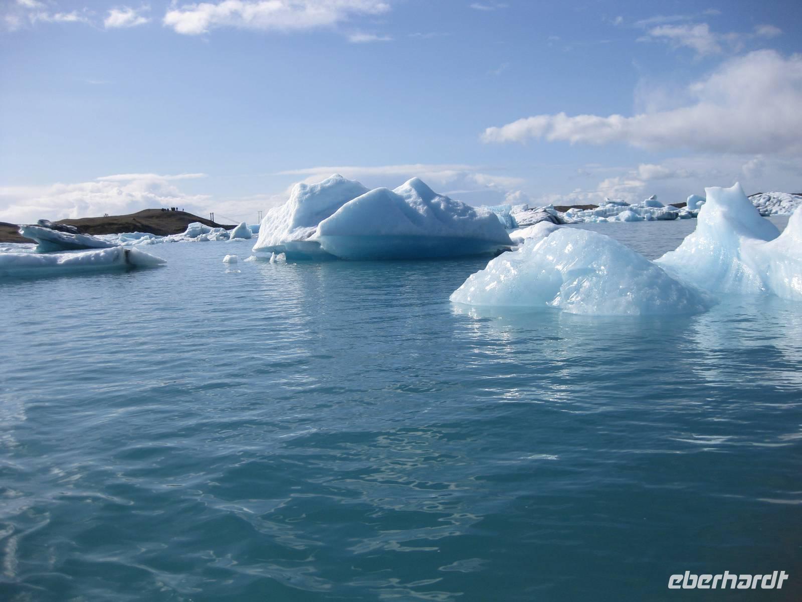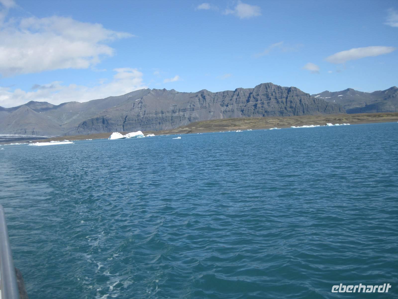 Nach knapp zwei Stunden erreichen wir den Gletschersee Jökulsarlon - die „Gletscherlagune", in dem weiße, blaue und schwarze Eisberge sind. Mit Amphibienfahrzeugen können wir den See erkunden. Wir werden ganz dicht an die Eisberge herangefahren. Ein „Serviceboot" bringt glasklares Gletschereis zu unserem Fahrzeug. Wir nehmen eine Kostprobe. Nach dem Ausflug auf der „Gletscherlagune" treffen wir uns wieder an Land und nehmen eine Probe vom Brennivin, dem berühmt berüchtigten Schnaps Islands, mit Gletschereis. Eine tolle Überraschung finden die Gäste.