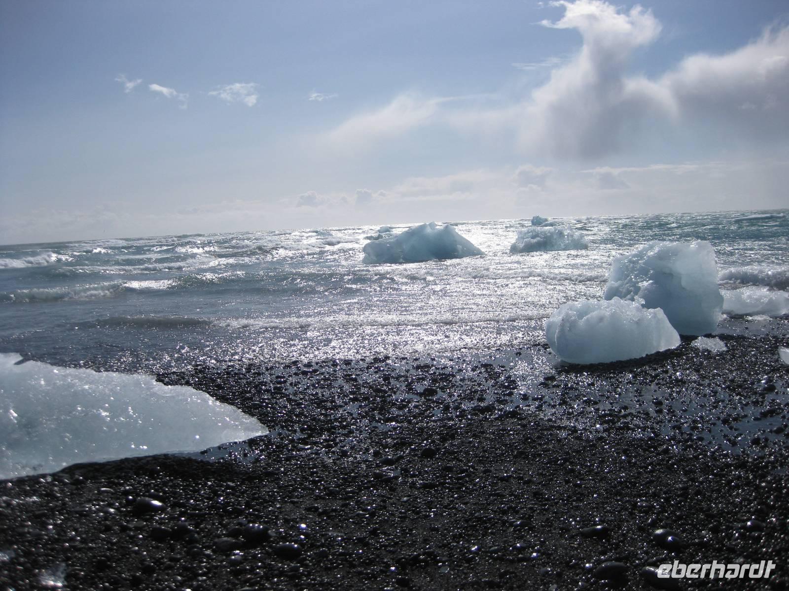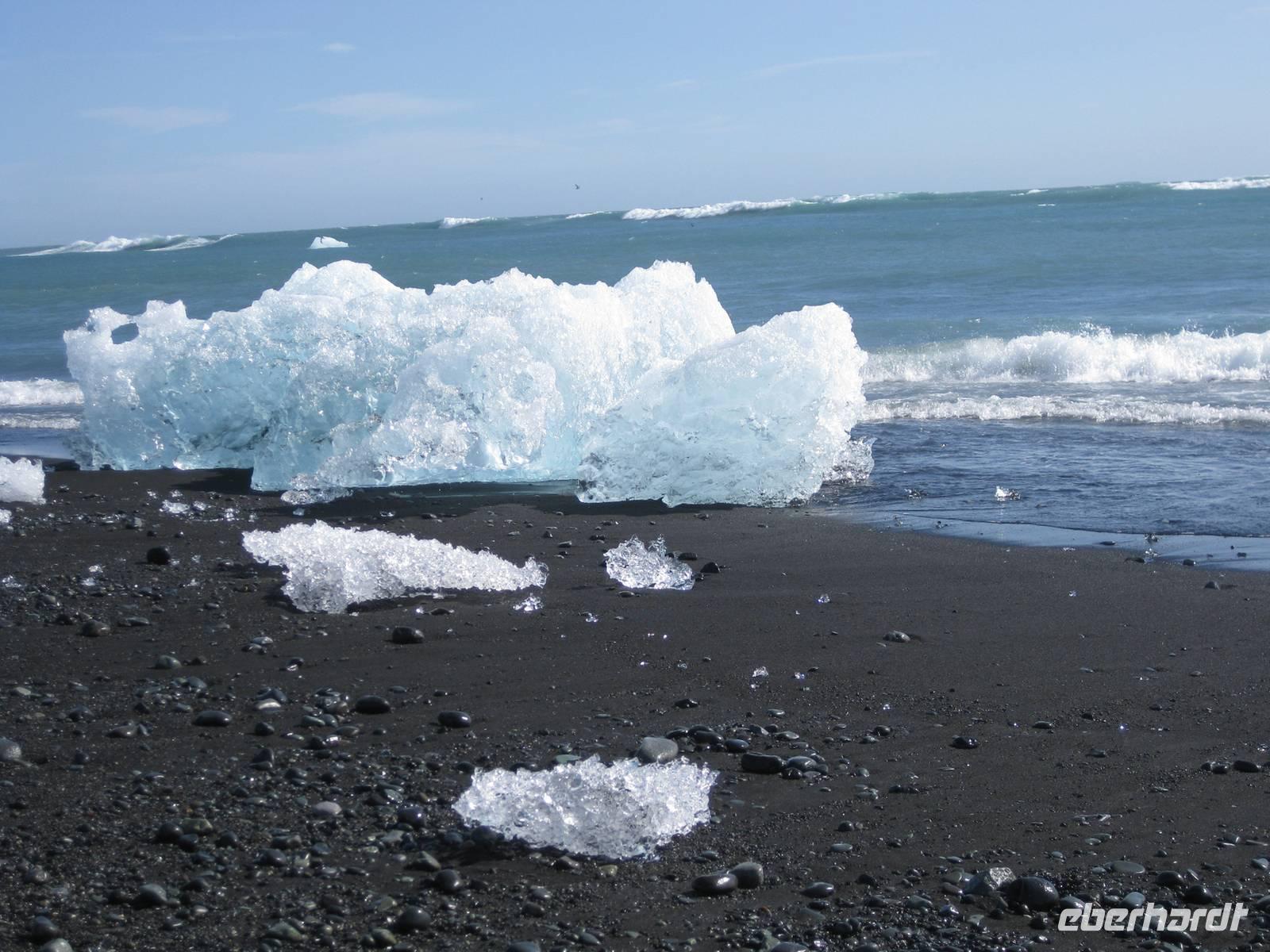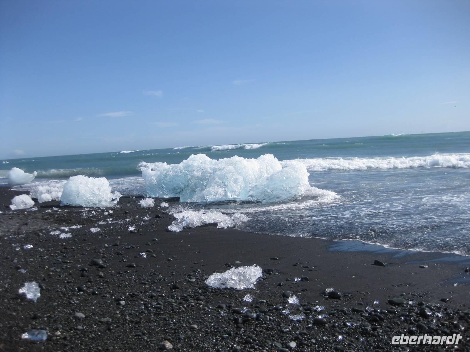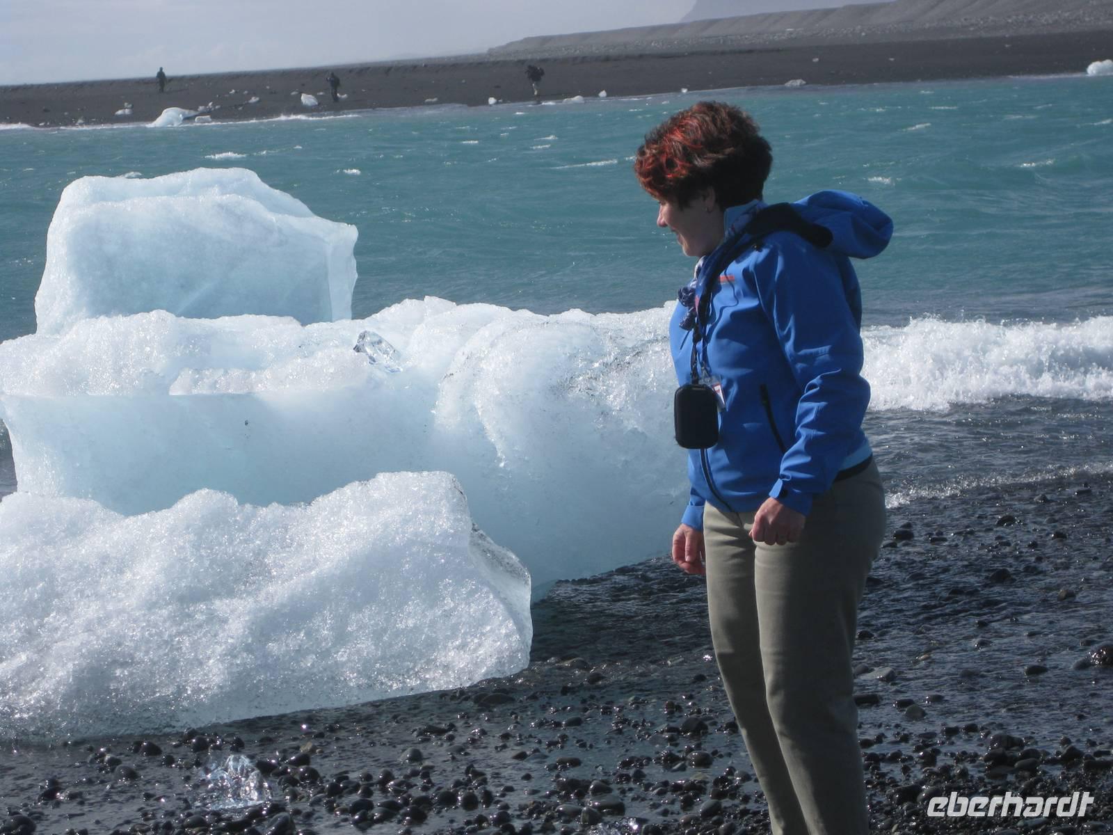 Bevor wir die Fahrt fortsetzen, begeben wir uns noch an den Strand. Hier fließt das Wasser von der „Gletscherlagune" in das Meer. Kleine Eisberge kommen angeschwommen und größere Eisberge liegen am Strand. Alles wird von der Sonne angestrahlt - ein überwältigendes Erlebnis.