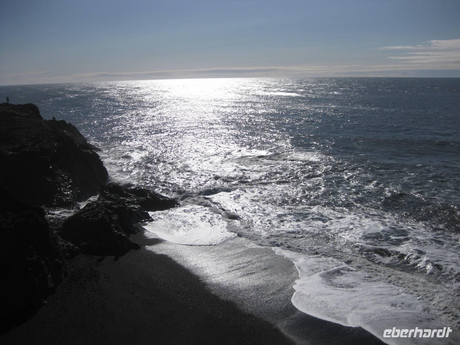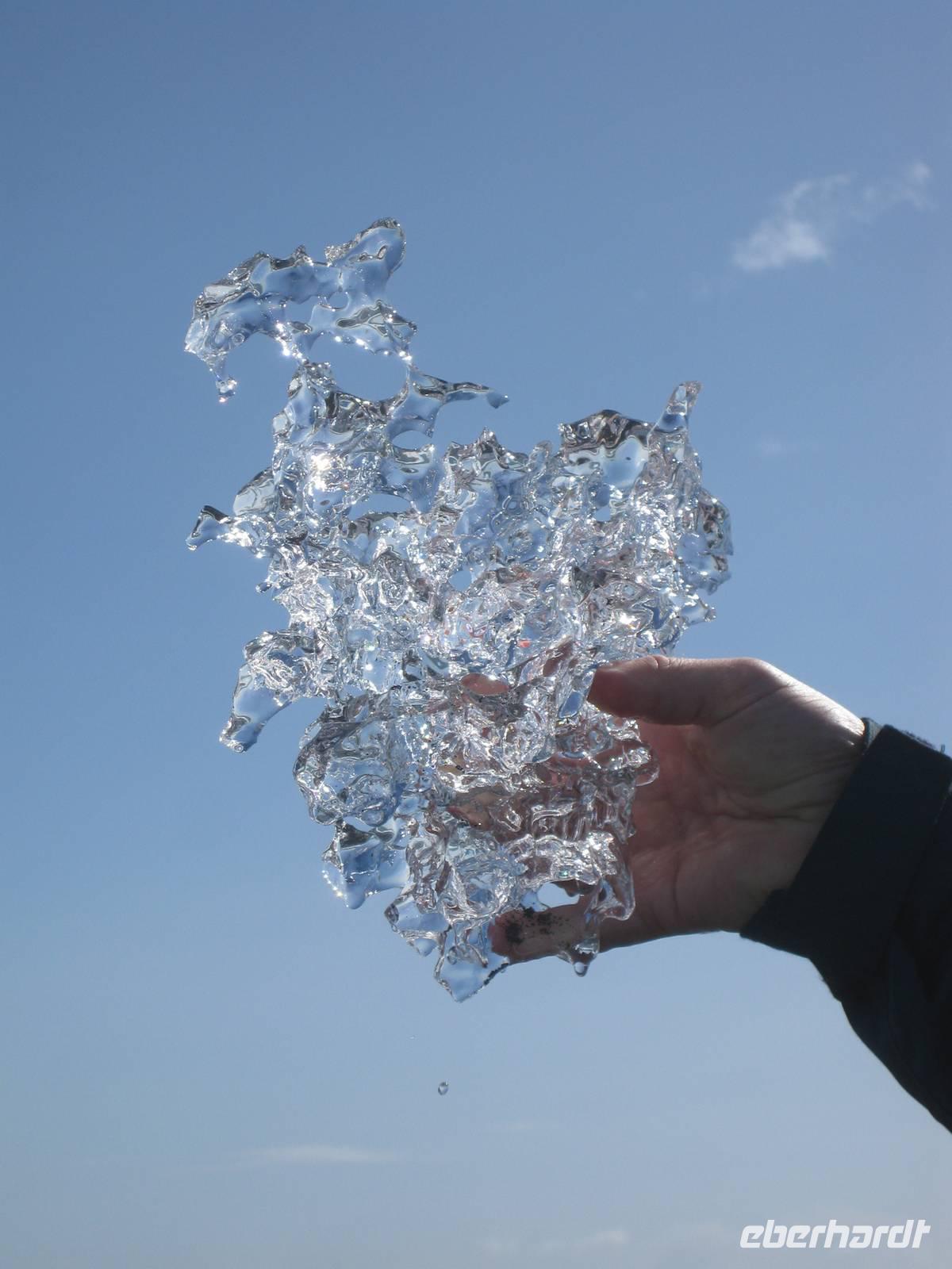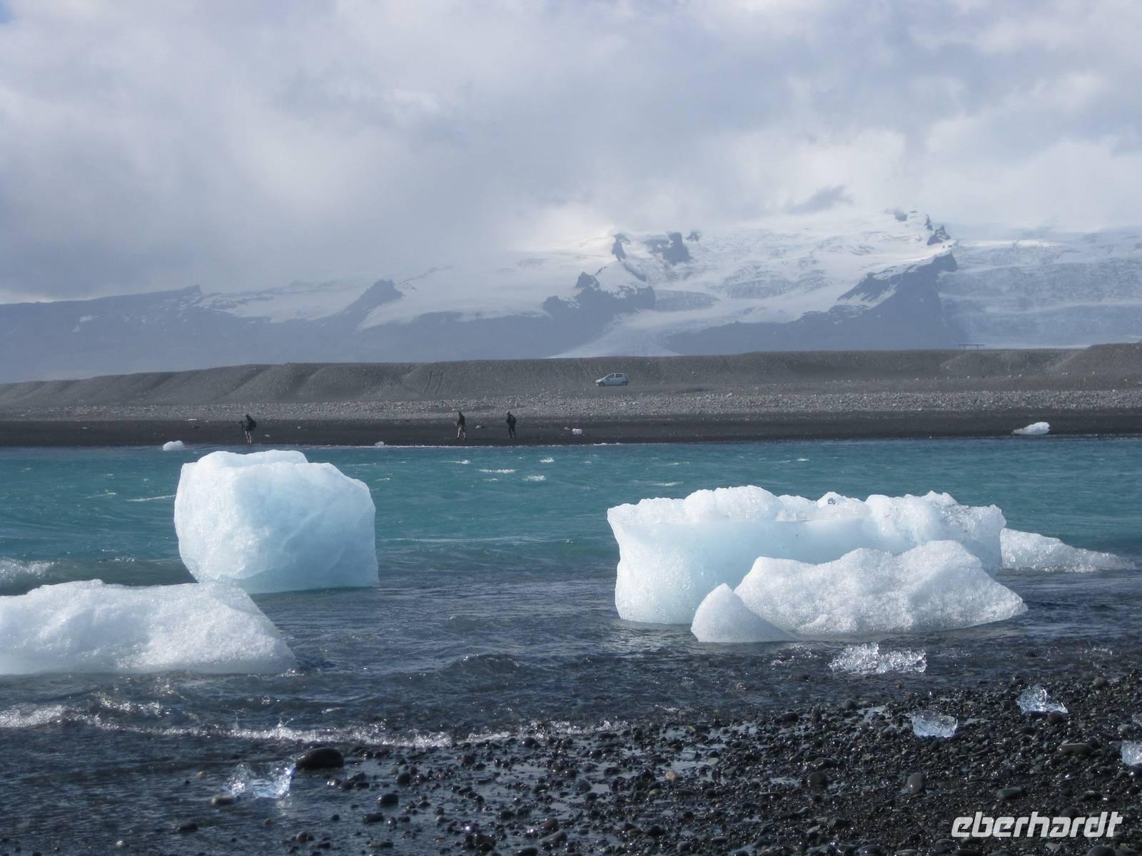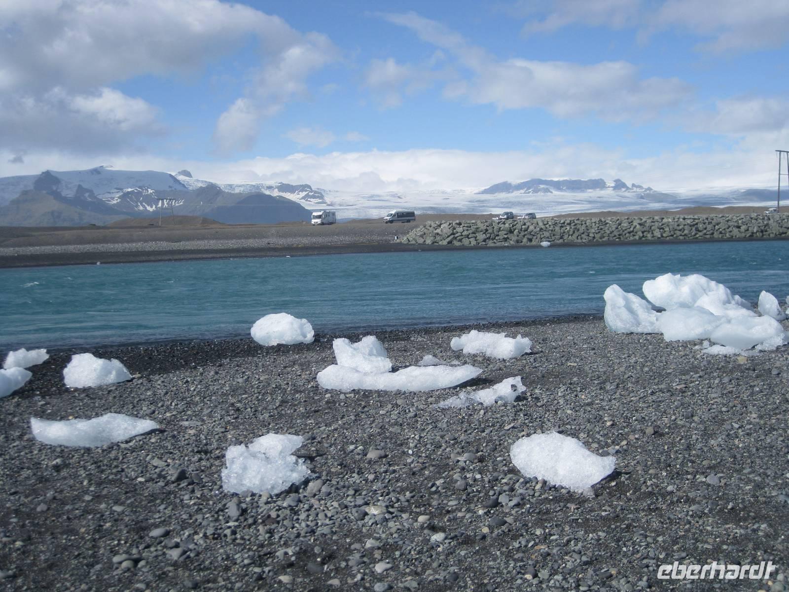 Bevor wir die Fahrt fortsetzen, begeben wir uns noch an den Strand. Hier fließt das Wasser von der „Gletscherlagune" in das Meer. Kleine Eisberge kommen angeschwommen und größere Eisberge liegen am Strand. Alles wird von der Sonne angestrahlt - ein überwältigendes Erlebnis.