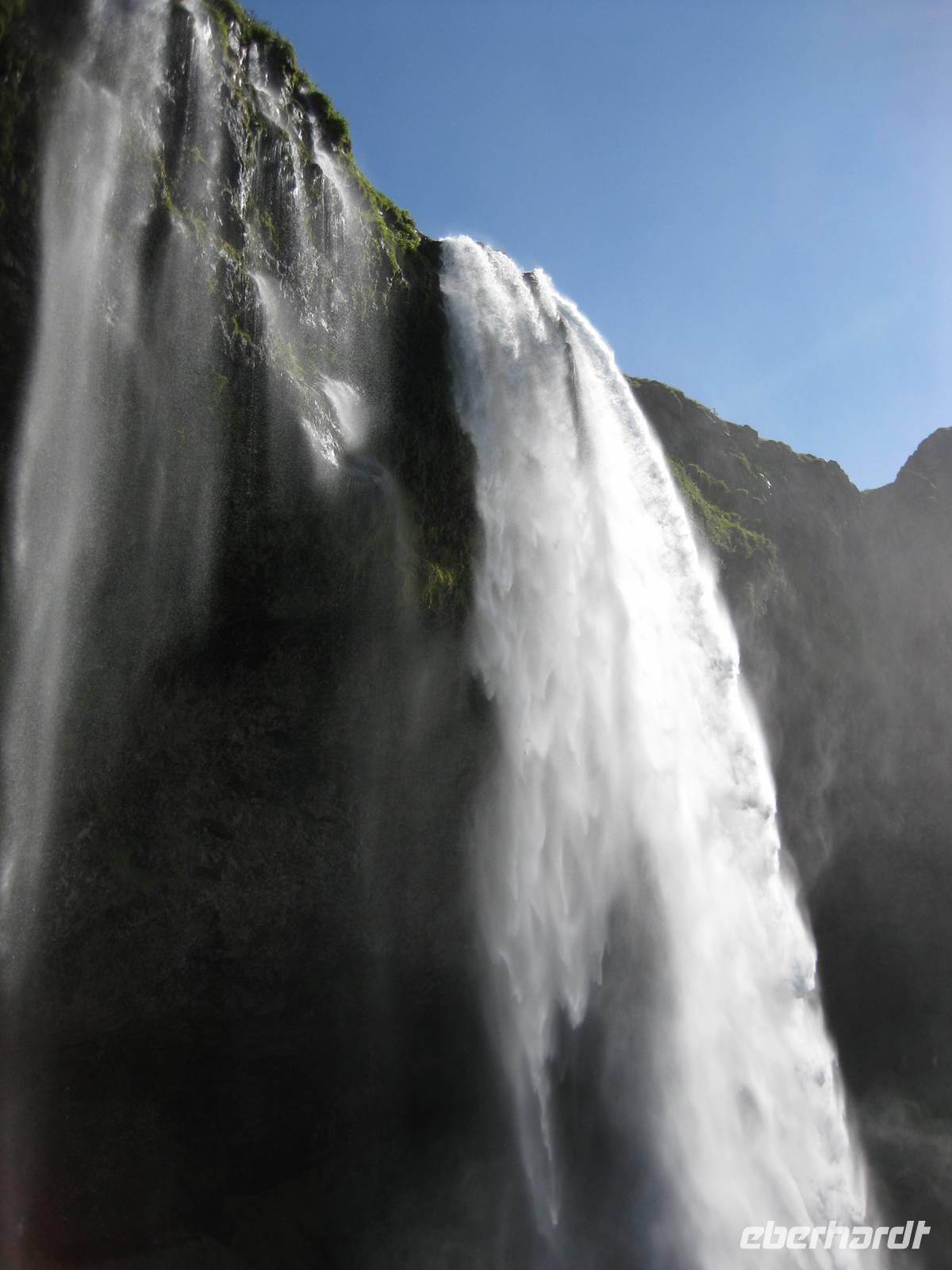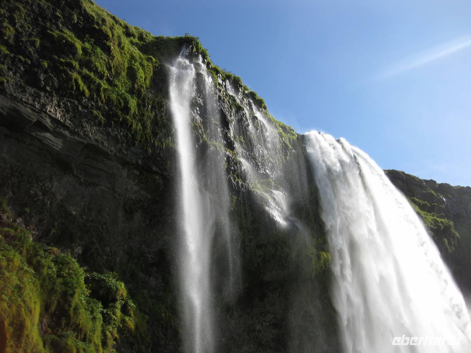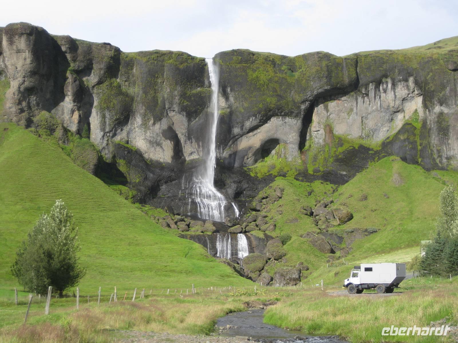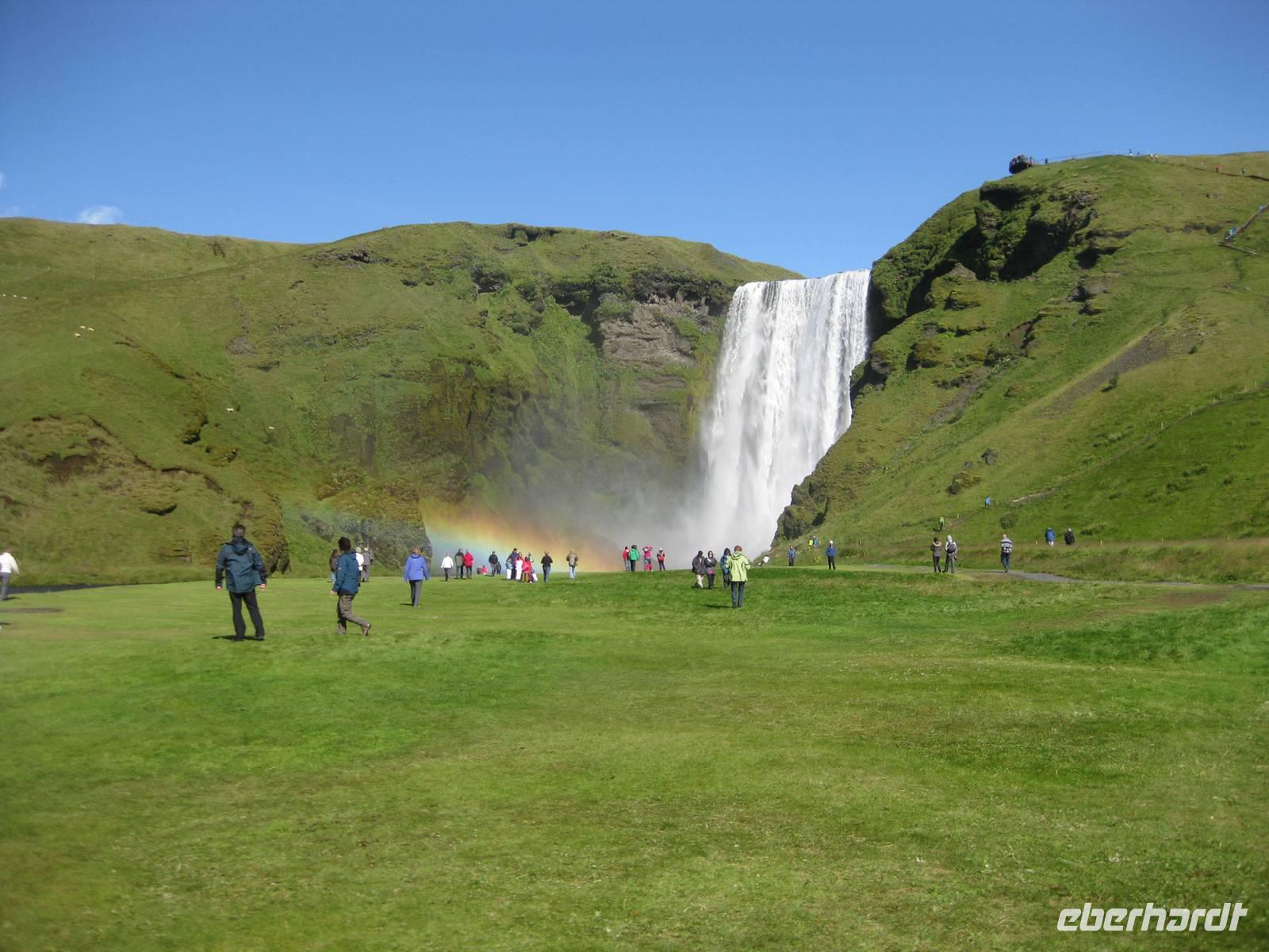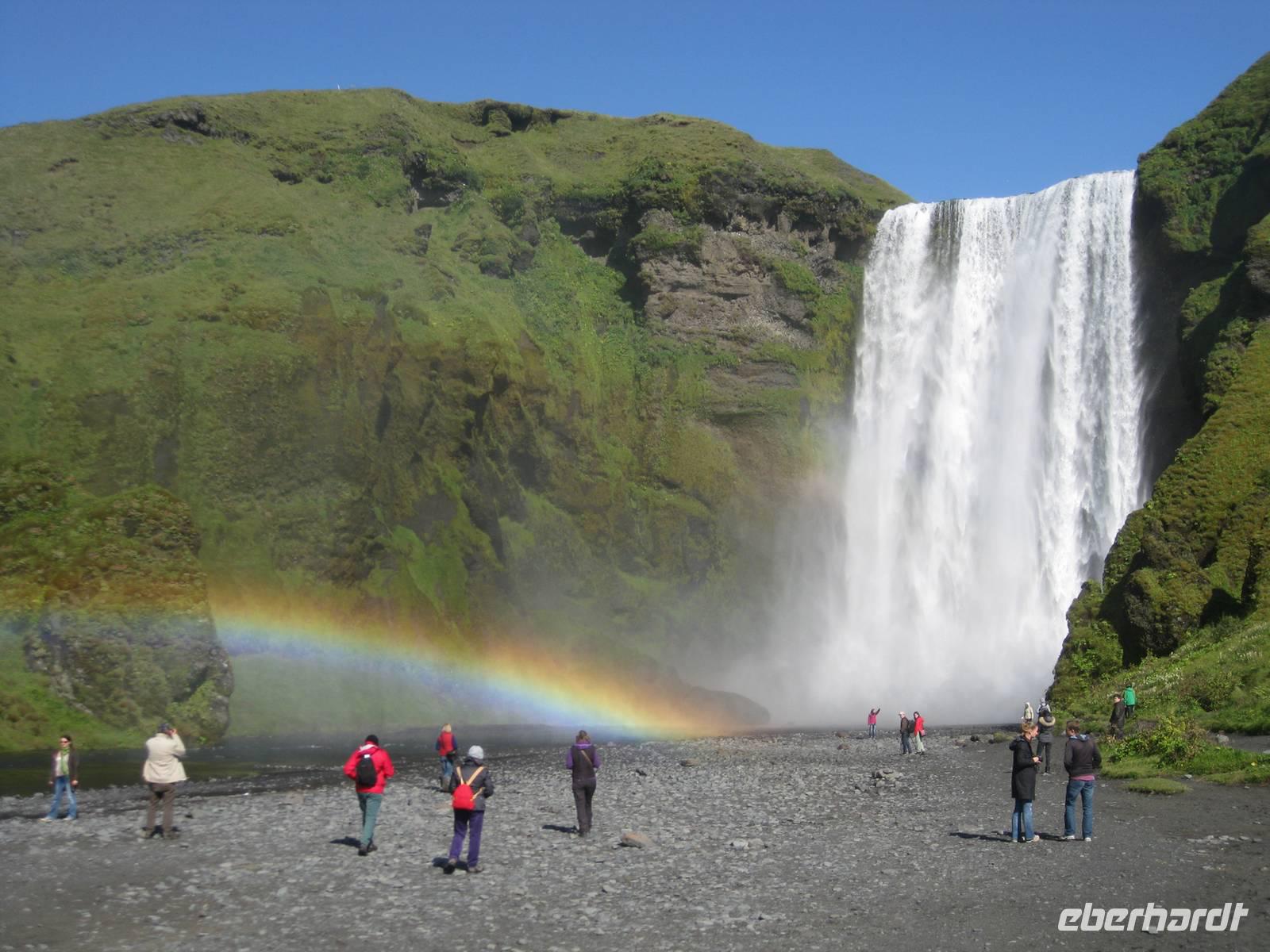 Ganz in der Nähe befindet sich der Skogafoss-Wasserfall. Wir können ihn schon von ferne sehen, er strahlt uns mit seinem Regenbogen entgegen. Hoch über ihm befindet sich der Gletscher Eyjafjallajökull. Natürlich besuchen wir den Skogafoss.