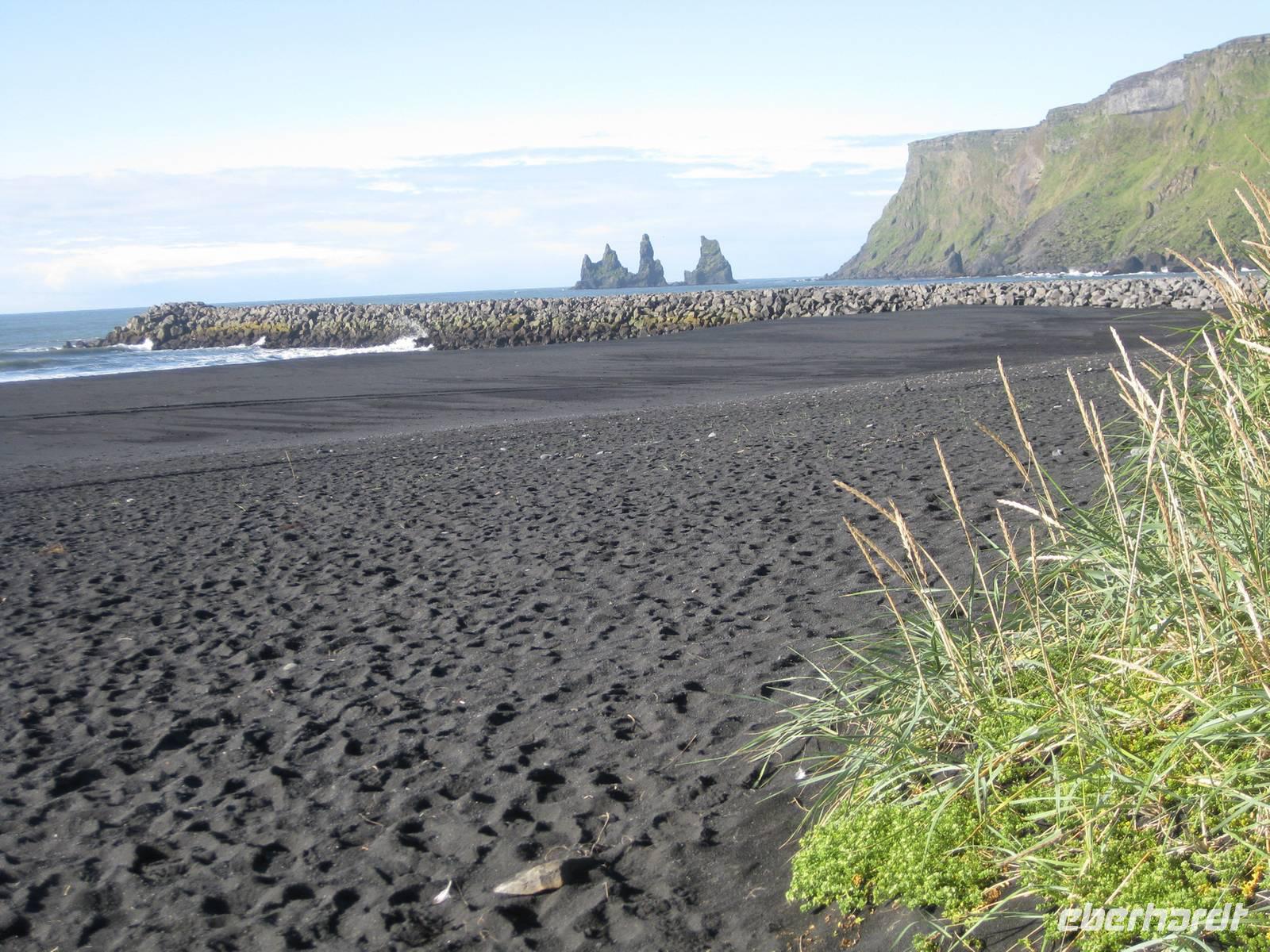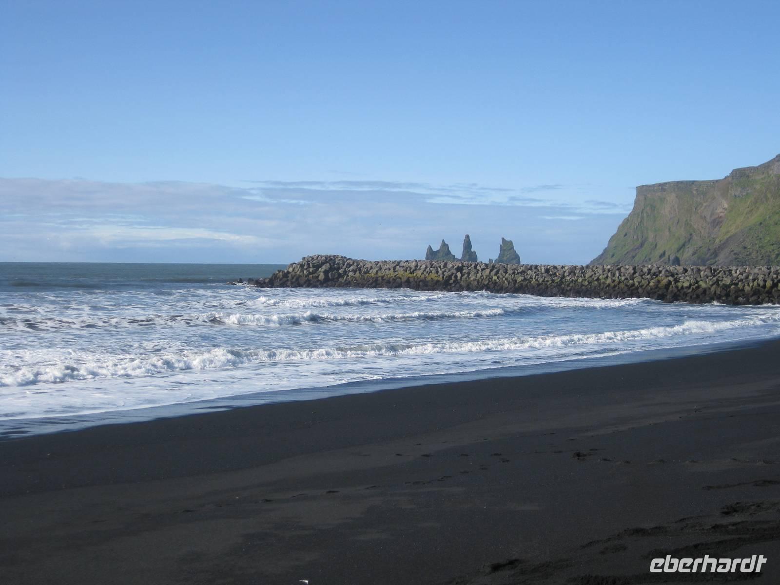 Auch heute werden wir wieder mit Sonnenschein geweckt. Es ist bestes Wetter. Nach dem Frühstück fahren wir nur ein kurzes Stück bis Vik. In dem kleinen Örtchen direkt am Meer besuchen wir eine Wollfabrik mit Shop. Dann laufen wir zum Strand mit schwarzem Sand. Von dort aus können wir die Felsnadeln „Reynisdrangar" im Meer sehen.