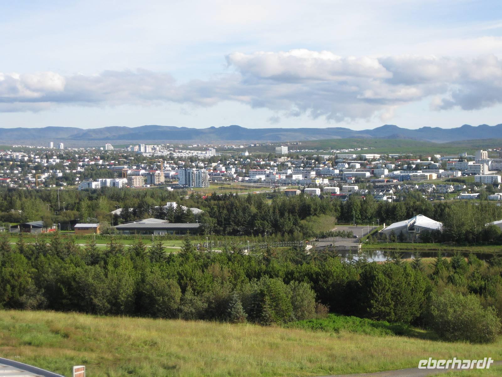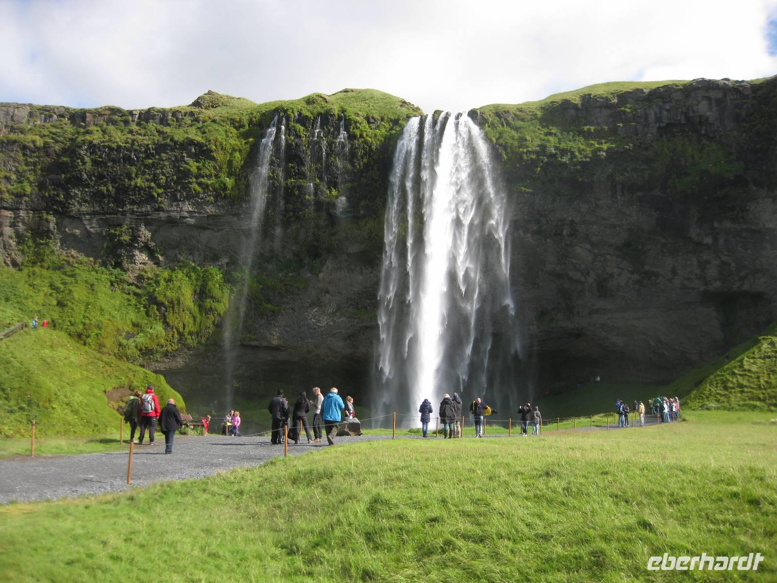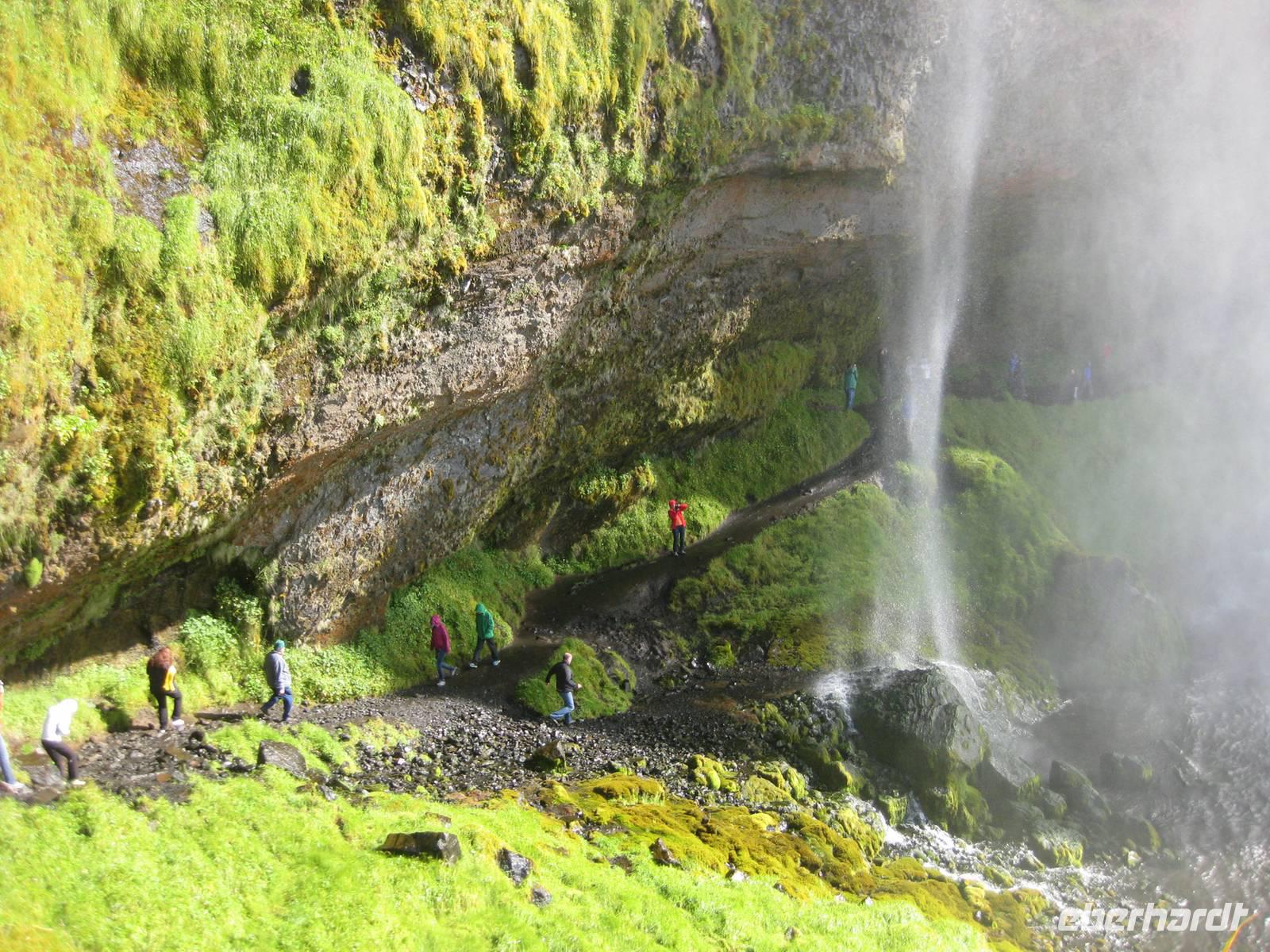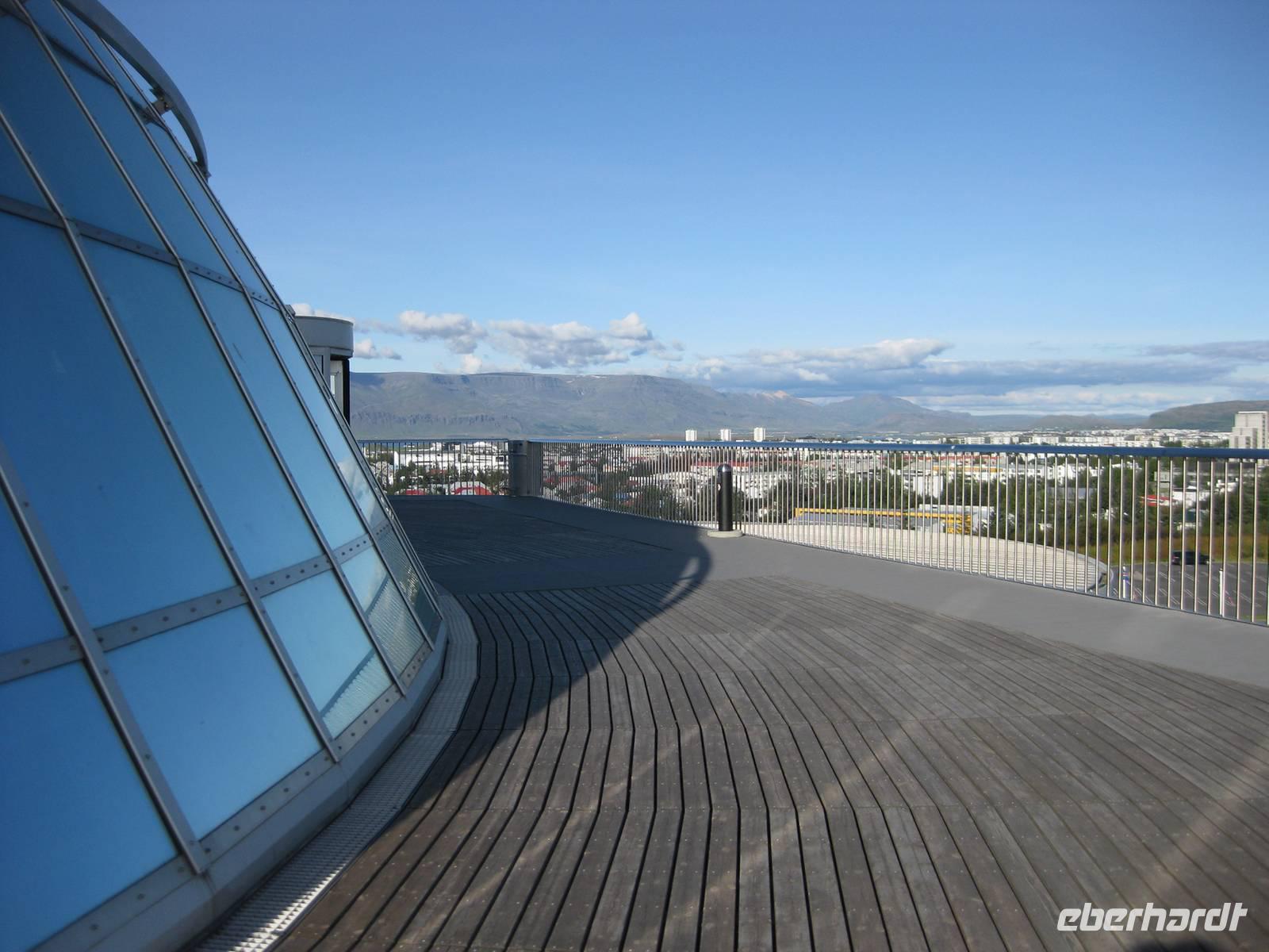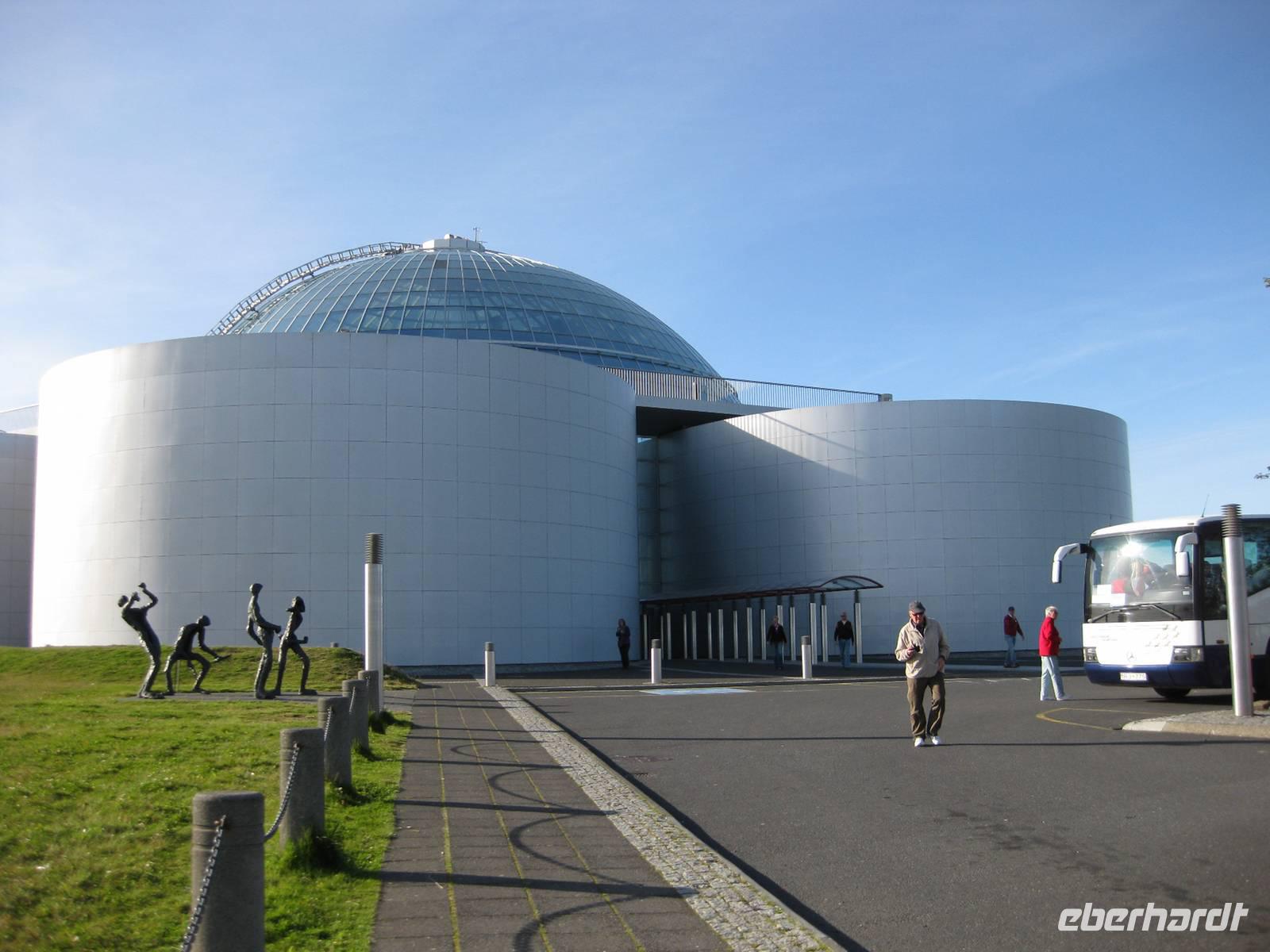 Und weiter geht unsere Fahrt in Richtung Reykjavik. Wir machen Mittagspause in einem kleinen Restaurant, das mal ein Kuhstall war, besuchen noch den Wasserfall „Seljalandsfoss", bei dem man hinter dem Wasserfall entlang laufen kann, sehen den Vulkan „Hekla" in der Ferne und kommen schließlich wieder nach Reykjavik. Hier schließt sich der Kreis. Wir fahren noch mal zum kleinen weißen Gästehaus „Höfdi", wo sich 1986 Gorbatschow und Reagan das erste Mal getroffen haben und damit das Ende des Kalten Krieges einläuteten. Wir machen ein Gruppenfoto. Unserer Rundreise beenden wir mit einem Besuch des „Perlan". Von der Aussichtsterrasse haben wir einen spektakulären Blick über Reykjavik und seine Umgebung.