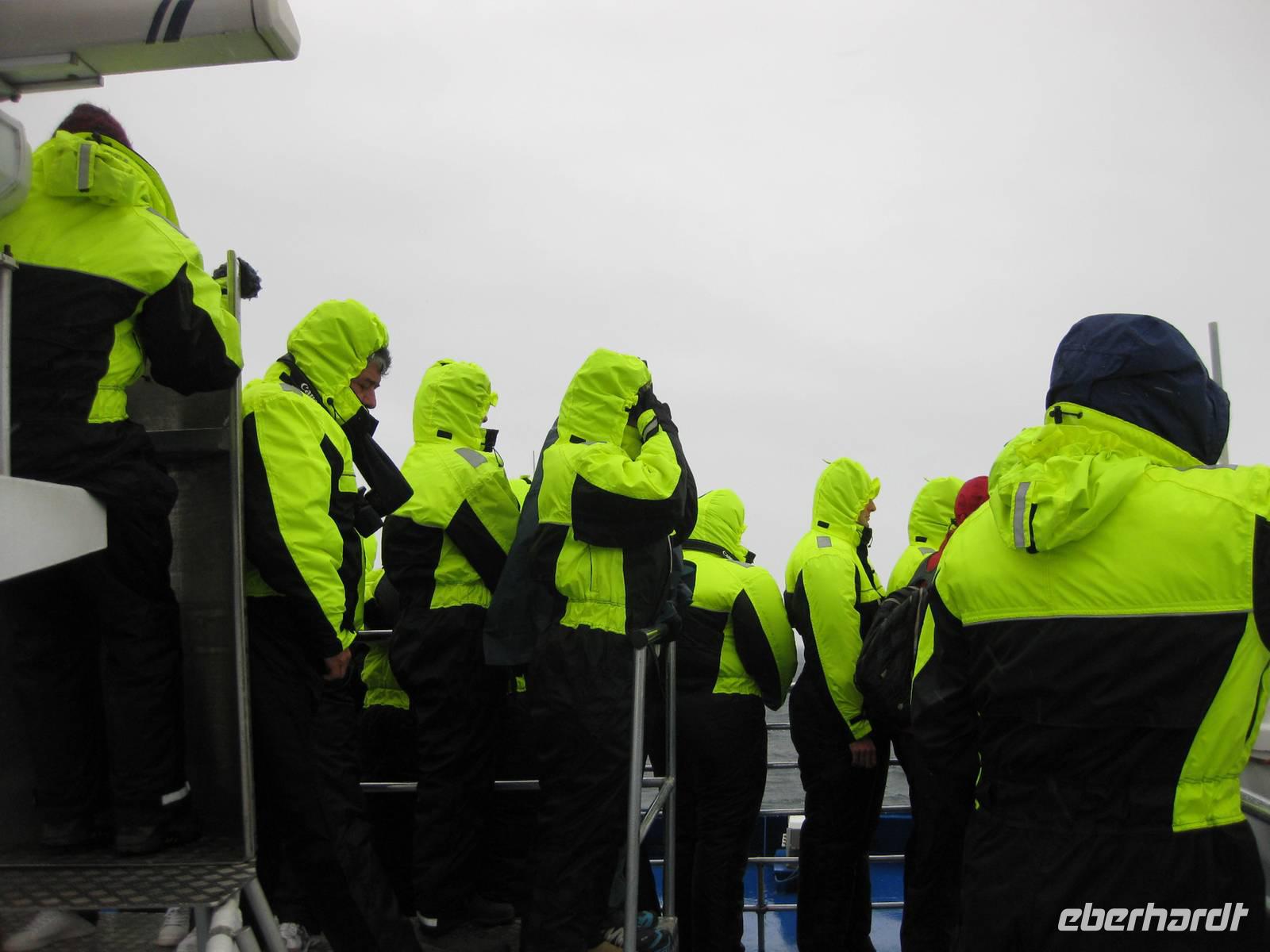 Nach dem Frühstück im Hotel begebe ich mich mit 11 Gästen zur Abfahrtsstelle des Schiffes zum Whale Watching. Leider regnet es, aber das Schiff legt trotzdem ab. Wir werden vorgewarnt, draußen ist das Meer unruhig. Es ist Wellengang, Wir sollten lieber vorbeugend eine Reisetablette nehmen. Zunächst platzieren wir uns erst einmal auf dem Mitteldeck im Cafe bzw. der Bar und fahren hinaus. Dann ziehen wir die Anzüge an, die uns vor Nässe und Kälte schützen und begeben uns nach oben auf's Deck. Wir halten Ausschau nach den Walen. Diese haben heute keine Lust, sie zeigen sich uns nicht. Hier oben an Deck in frischer Luft überstehen wir die etwas stürmische Fahrt recht gut. Gegen 12.00 Uhr legen wir wieder im Hafen an.
