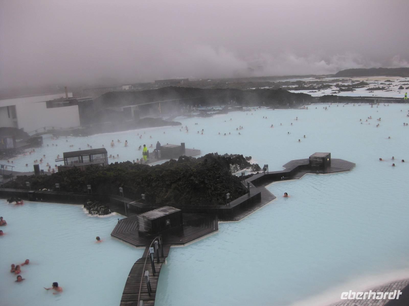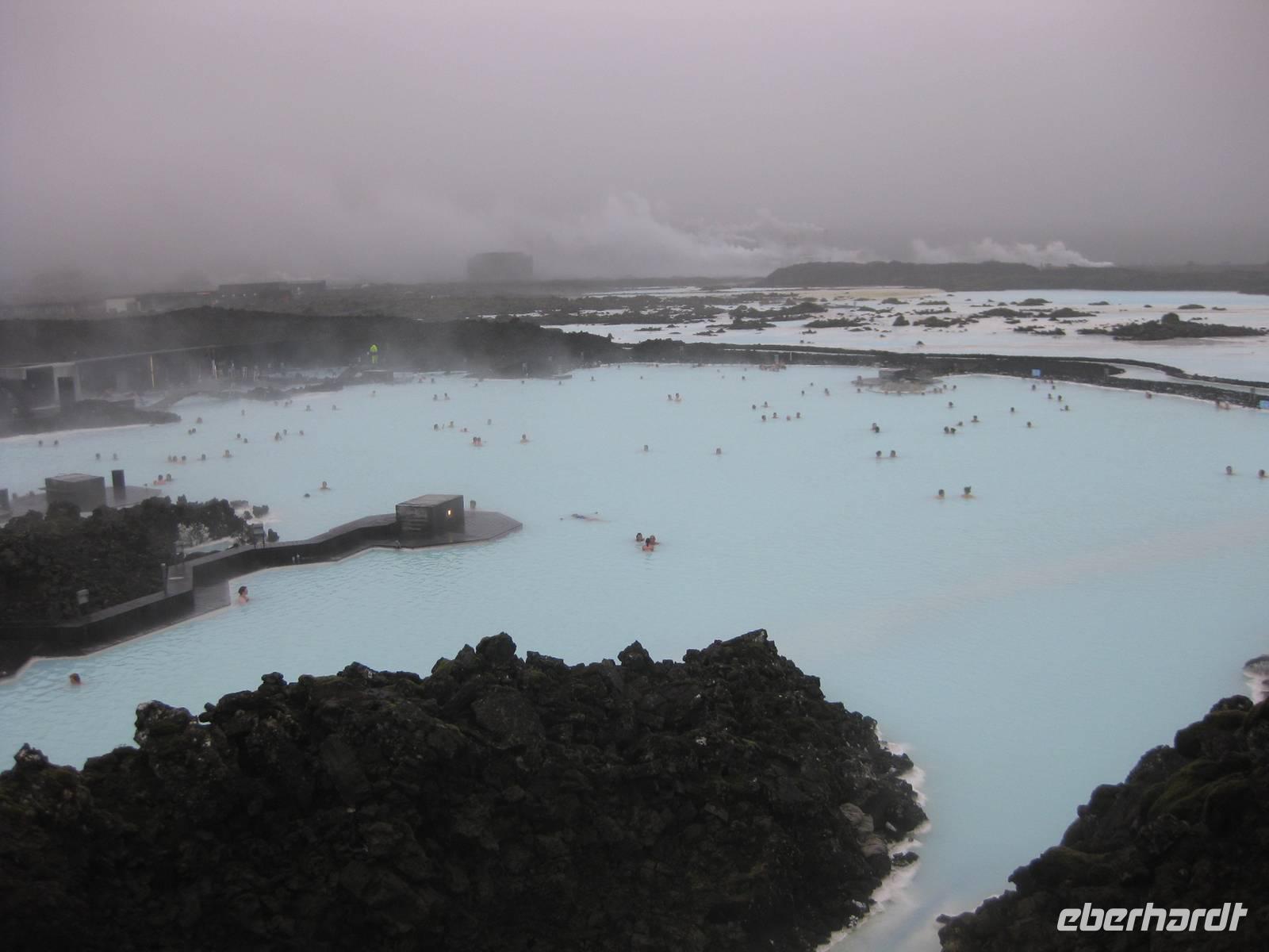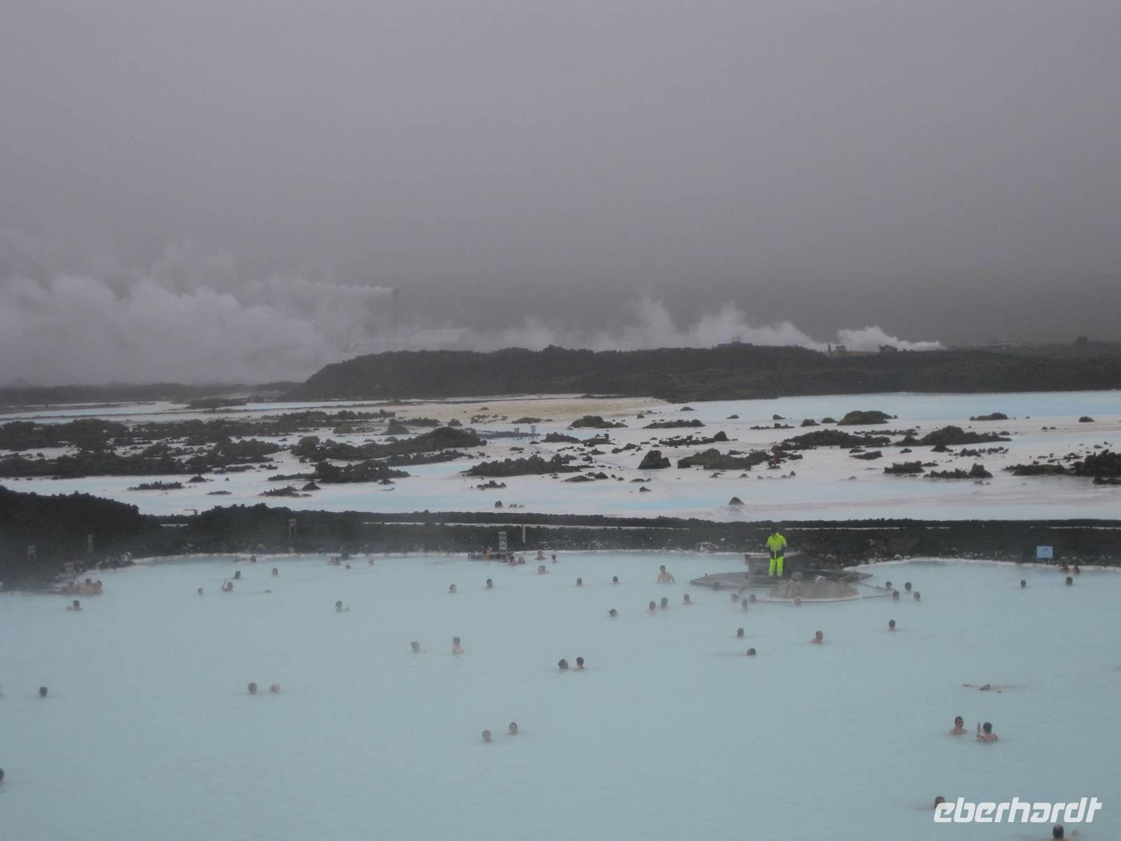 Am Nachmittag fahre ich mit 14 Gästen in die „Blaue Lagune" auf der Halbinsel Reykjanes. Der Bus holt uns am Hotel ab. Die „Blaue Lagune" ist eine luxuriöse Badelandschaft inmitten eines kargen Lavafeldes. Ein Bad hier zwischen Lavagrotten und -inseln ist ein unvergessliches Erlebnis und auch sehr wohltuend. Das Wasser kommt aus tiefen Bohrungen mit 240 Grad C und wird auf erträgliche Temperaturen abgekühlt. Es ist salzig wie das Meer und reichhaltig an Mineralien. Reibt man sich mit dem Mineralschlamm ein, so ist das sehr gut für die Haut. Man sieht hinterher viel jünger aus. Nach gut zwei Stunden verlassen wir die „Blaue Lagune" und fahren wieder zum Hotel zurück.