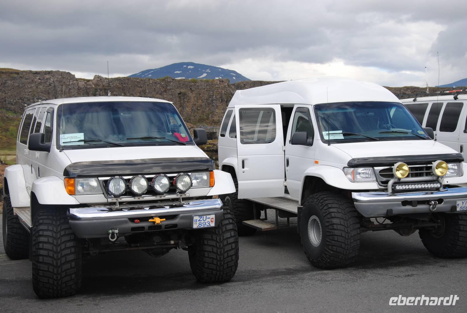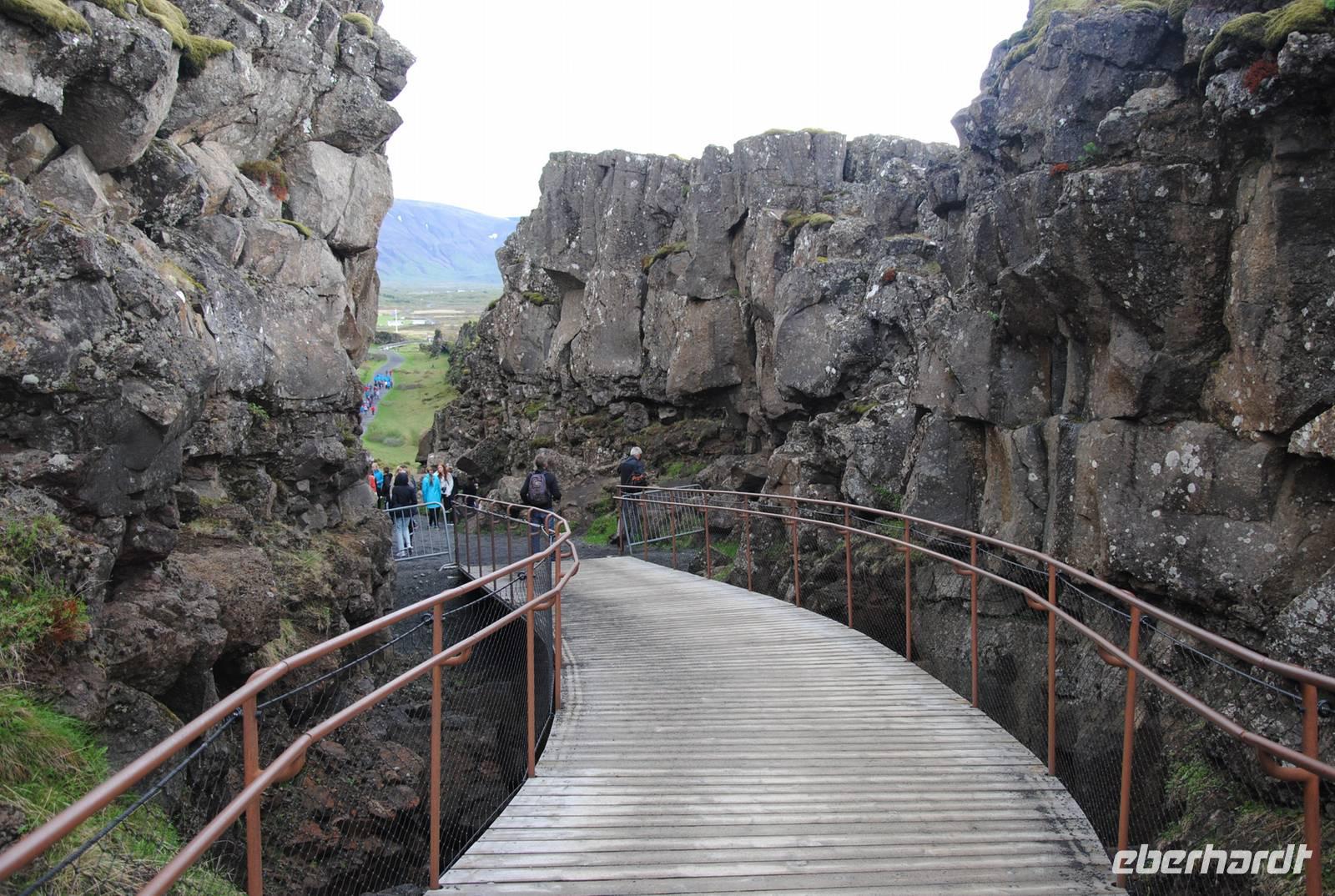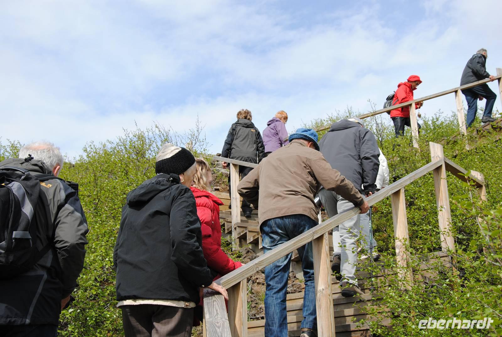 Nahe der Hauptstadt gelegen fanden wir im südwestlichen Tiefland einige der Hauptattraktionen des Landes. Ein Besuch in Pingvellier führte in ein geologisch einzigartiges und faszinierendes Gebiet. Mitten durch den Nationalpark verläuft die geotektonische Grenze zwischen Europa und Amerika. Wohl nirgends wo lässt sich besser erkennen was passiert, wenn zwei der sich auf dem Erdmantel bewegenden tektonischen Platten auseinanderdriften Über die Felsformationen, die teilweise vor ungefähr 9000 Jahren begannen, waren wir sichtlich beeindruckt. So ging die Fahrt durch den Nationalpark Thingvellir
