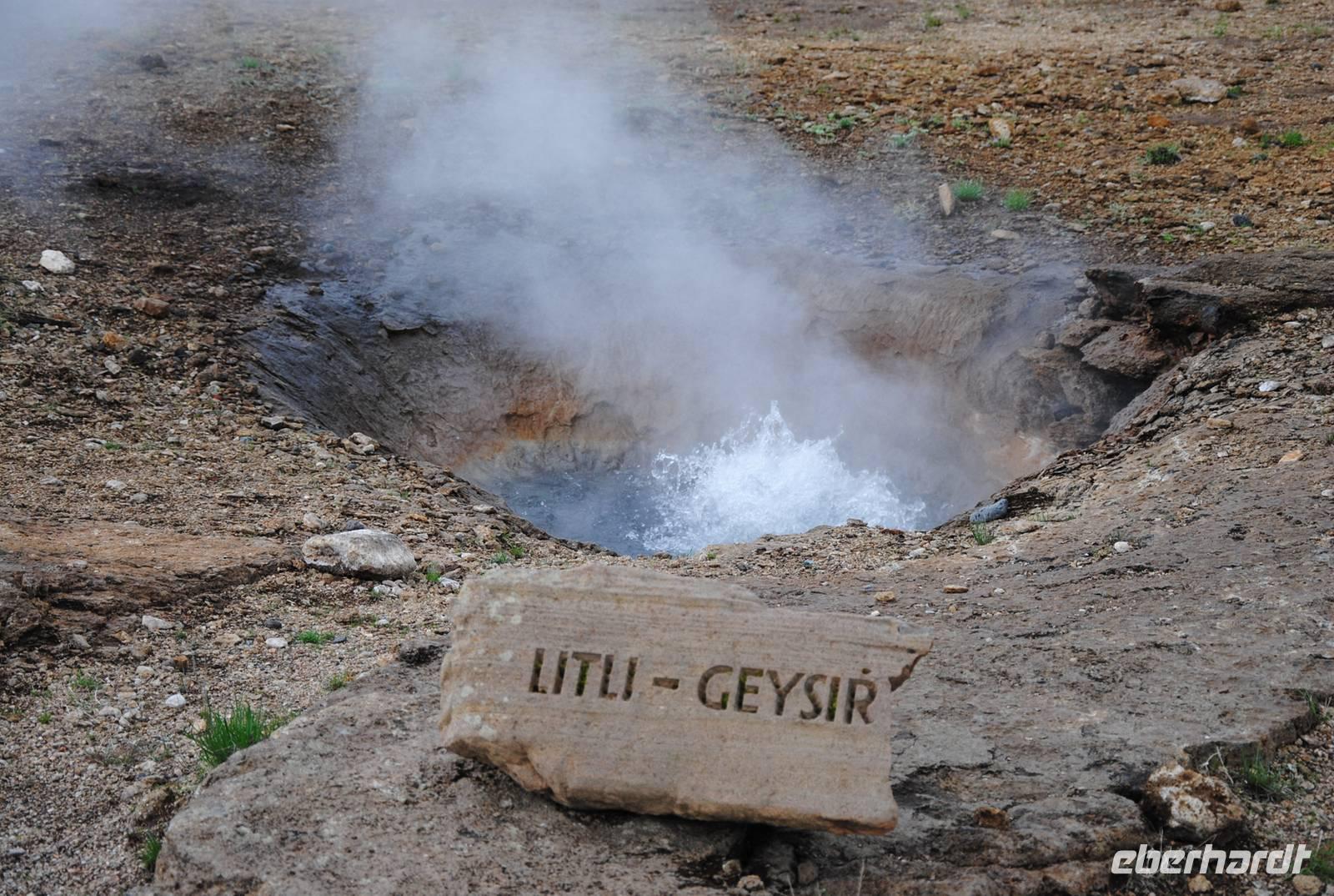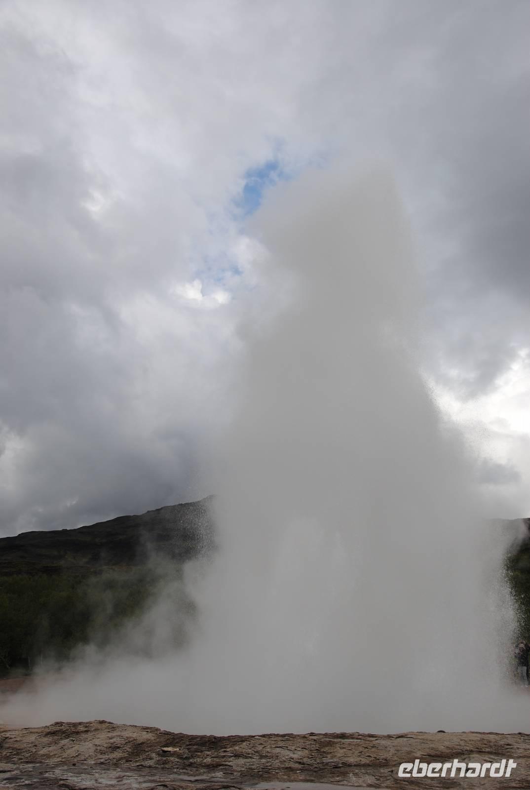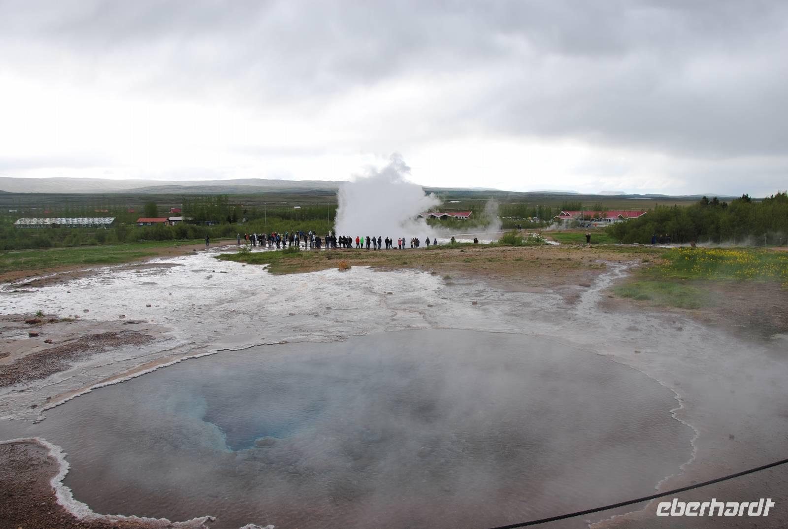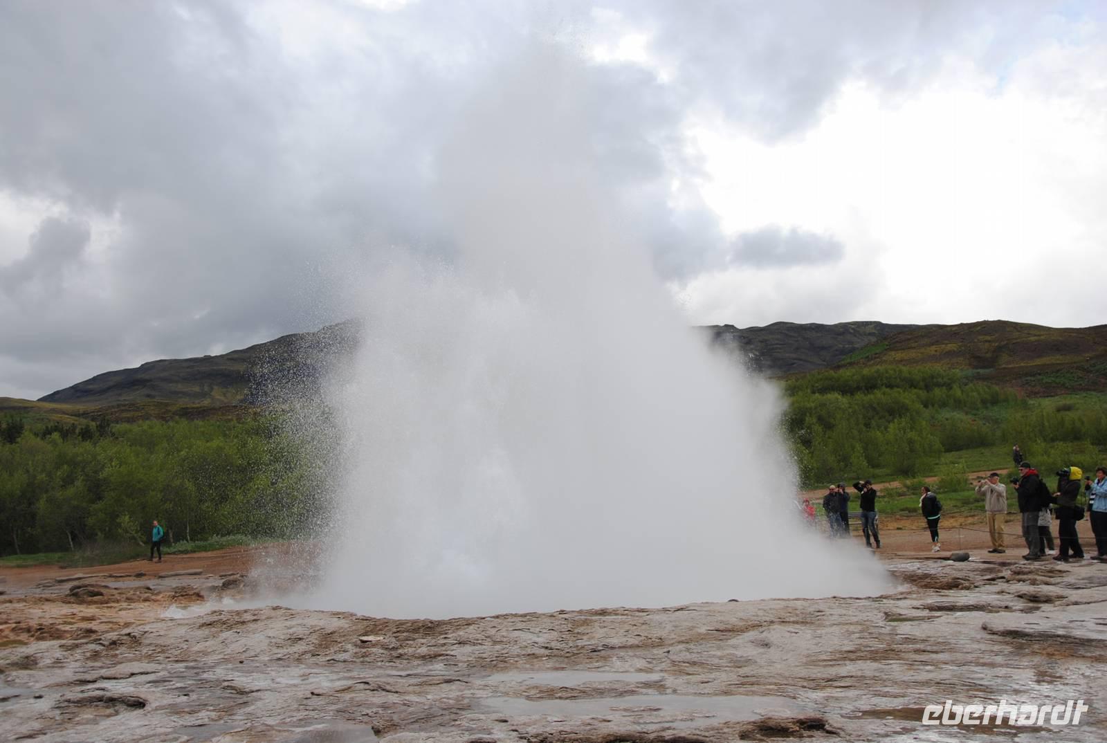 Die „Alten Geysir" ist die berühmteste Attraktion Islands. Diesen heißen Springquellen verdanken alle Verwandten weltweit ihren Namen. Ursprünglich spukte der große Geysir eine 80 Meter Fontäne in die Luft. Leider bekam er eine Verstopfung, so dass wir das Naturschauspiel nur an seinem kleinen Bruder beobachten konnte. Mit Geduld und den Finger am Auslöser der Kamera warteten wir an der richtigen Stelle (geduscht hatte jeder schon morgens) auf die „Entladung" des sprudelnden Wassers. Geschafft - alle hatten ihr Foto im Kasten