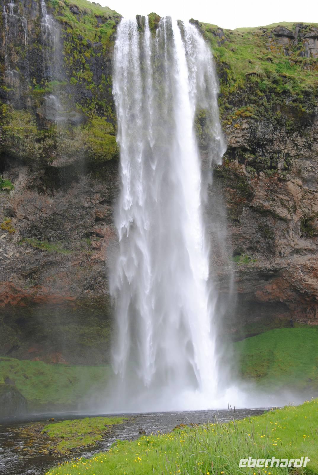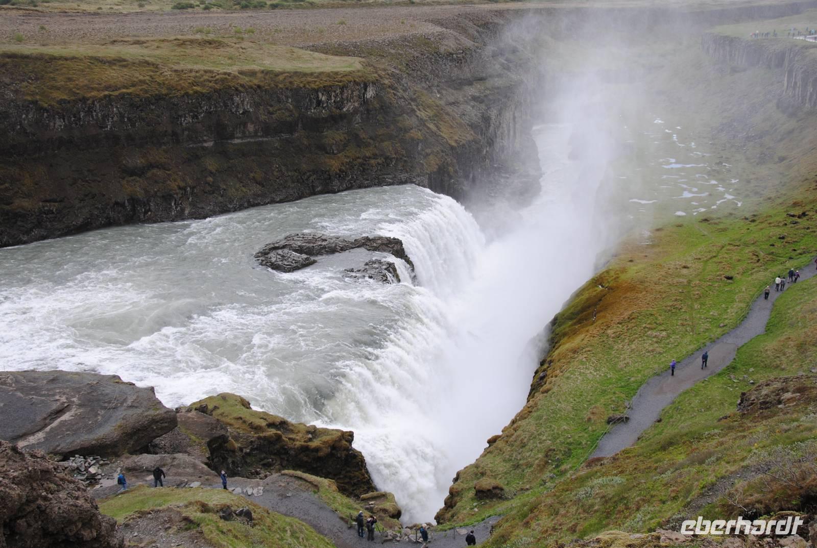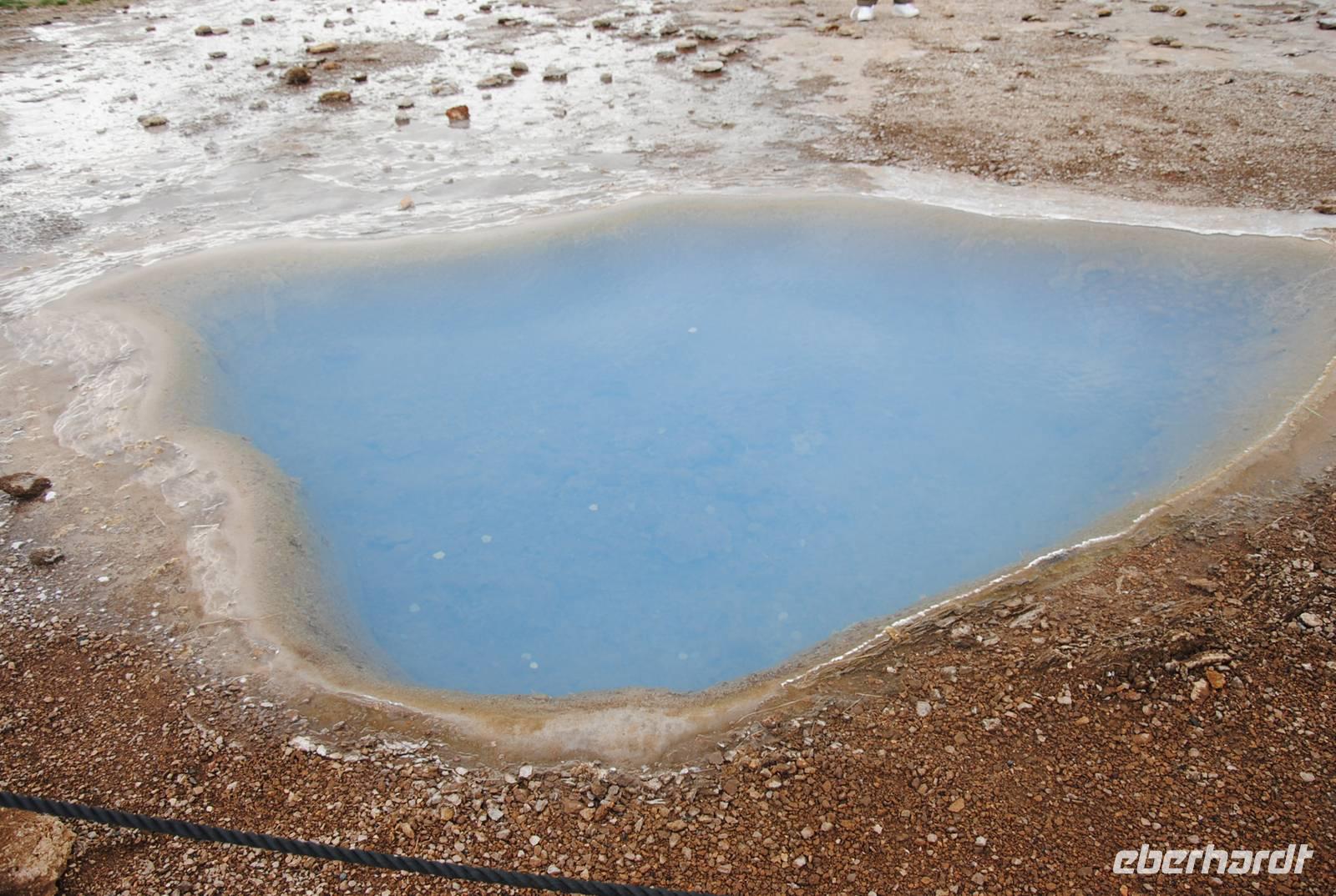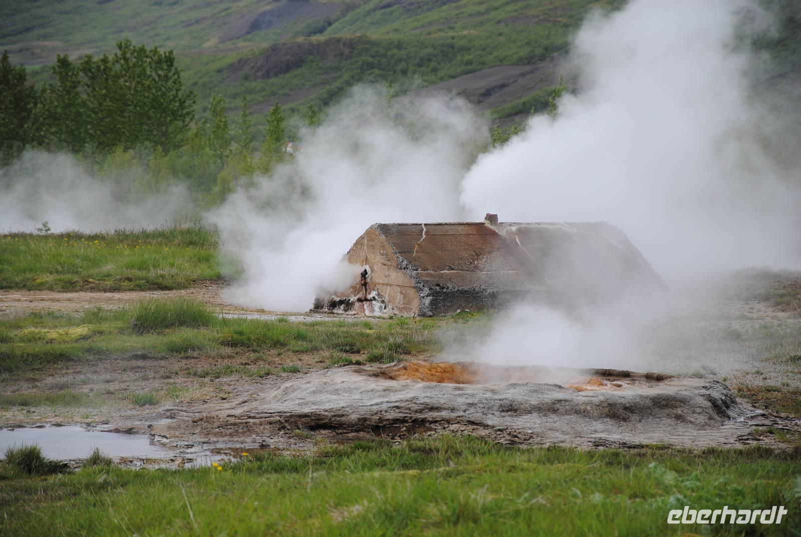 Die „Alten Geysir" ist die berühmteste Attraktion Islands. Diesen heißen Springquellen verdanken alle Verwandten weltweit ihren Namen. Ursprünglich spukte der große Geysir eine 80 Meter Fontäne in die Luft. Leider bekam er eine Verstopfung, so dass wir das Naturschauspiel nur an seinem kleinen Bruder beobachten konnte. Mit Geduld und den Finger am Auslöser der Kamera warteten wir an der richtigen Stelle (geduscht hatte jeder schon morgens) auf die „Entladung" des sprudelnden Wassers. Geschafft - alle hatten ihr Foto im Kasten