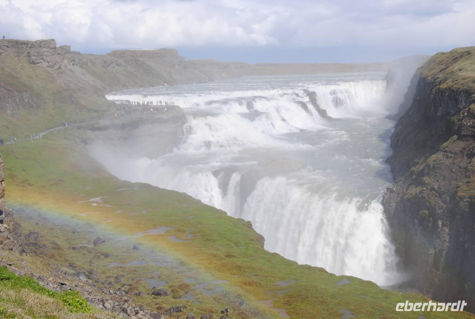 Wasserfälle werden wir auf unserer Reise noch einige sehen. Aber Islands berühmtester Wasserfall Gullfoss stürzt über 32 Meter in zwei gegeneinander versetzten Kaskaden in eine enge Schlucht. Ob mit einem schillernden Regenbogen versehen oder nur hinter Nebelschwaden versteckt - in jeder Situation ist das Naturschauspiel schön anzusehen. Und das es noch existiert ist nur einem Zufall zu verdanken, denn der Eigentürmer in den 1920-er wollte den Grund nicht für den Bau eines Wasserkraftwerkes verkaufen. Wir erlebten dieses Naturschauspiel mit der Pracht eines Regenbogens. Es ist eben Glücksache wie man das Naturdenkmal erlebt. So ging es durch eine malerische Landschaft zurück zum Hotel. Beim Abendessen hatte man reichlich Gesprächsstoff und man genoss den 2. Abend in Islands Hauptstadt.