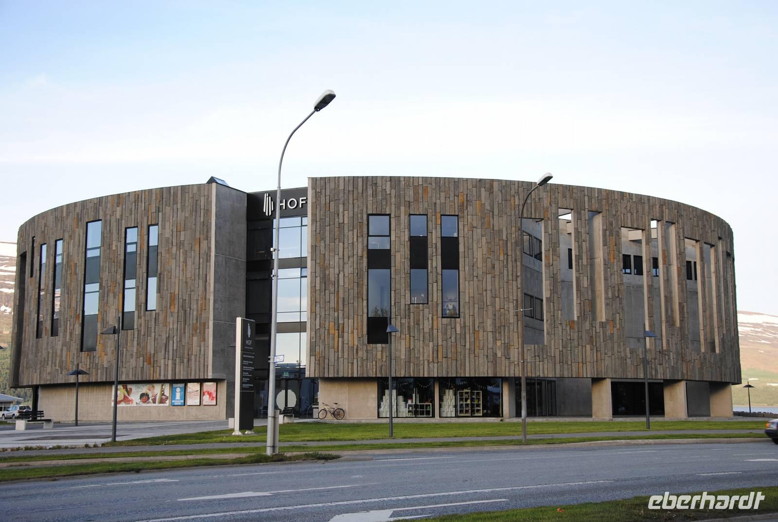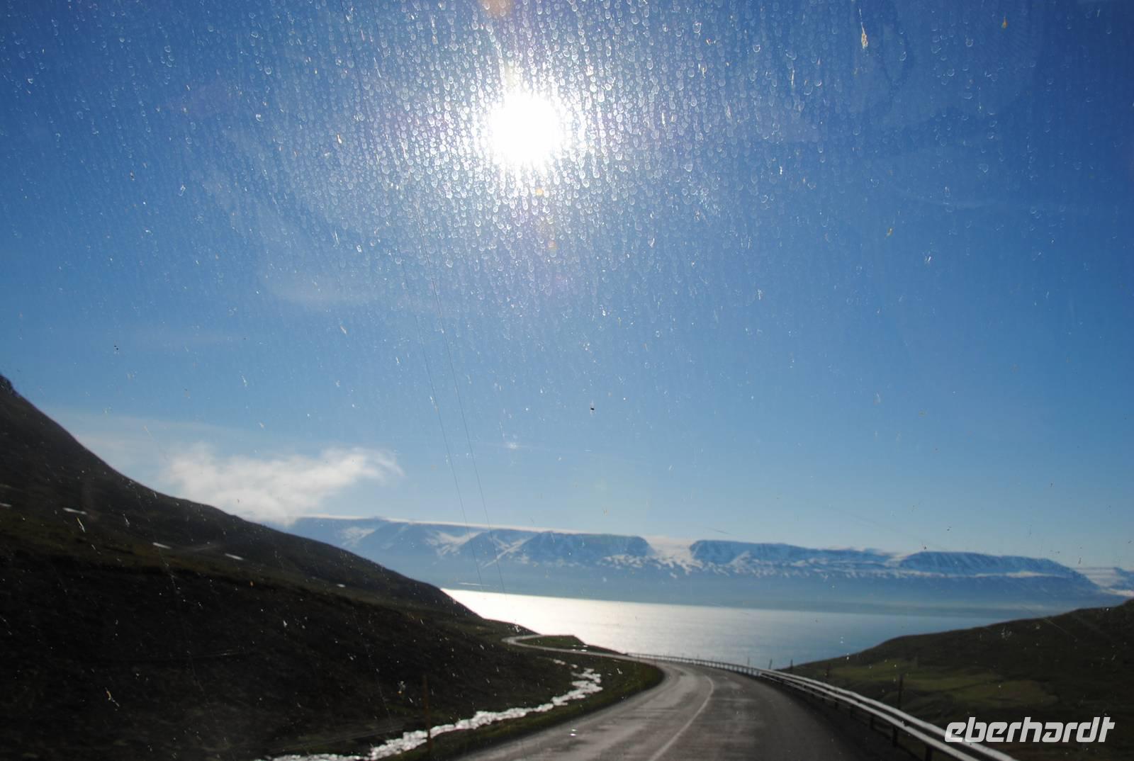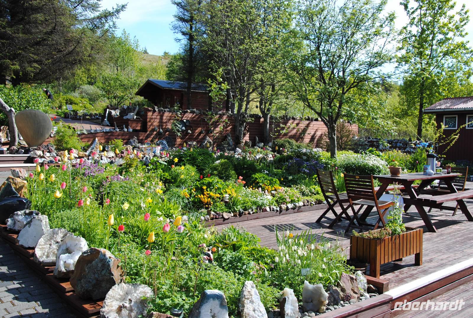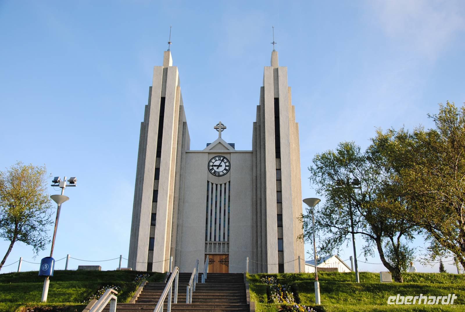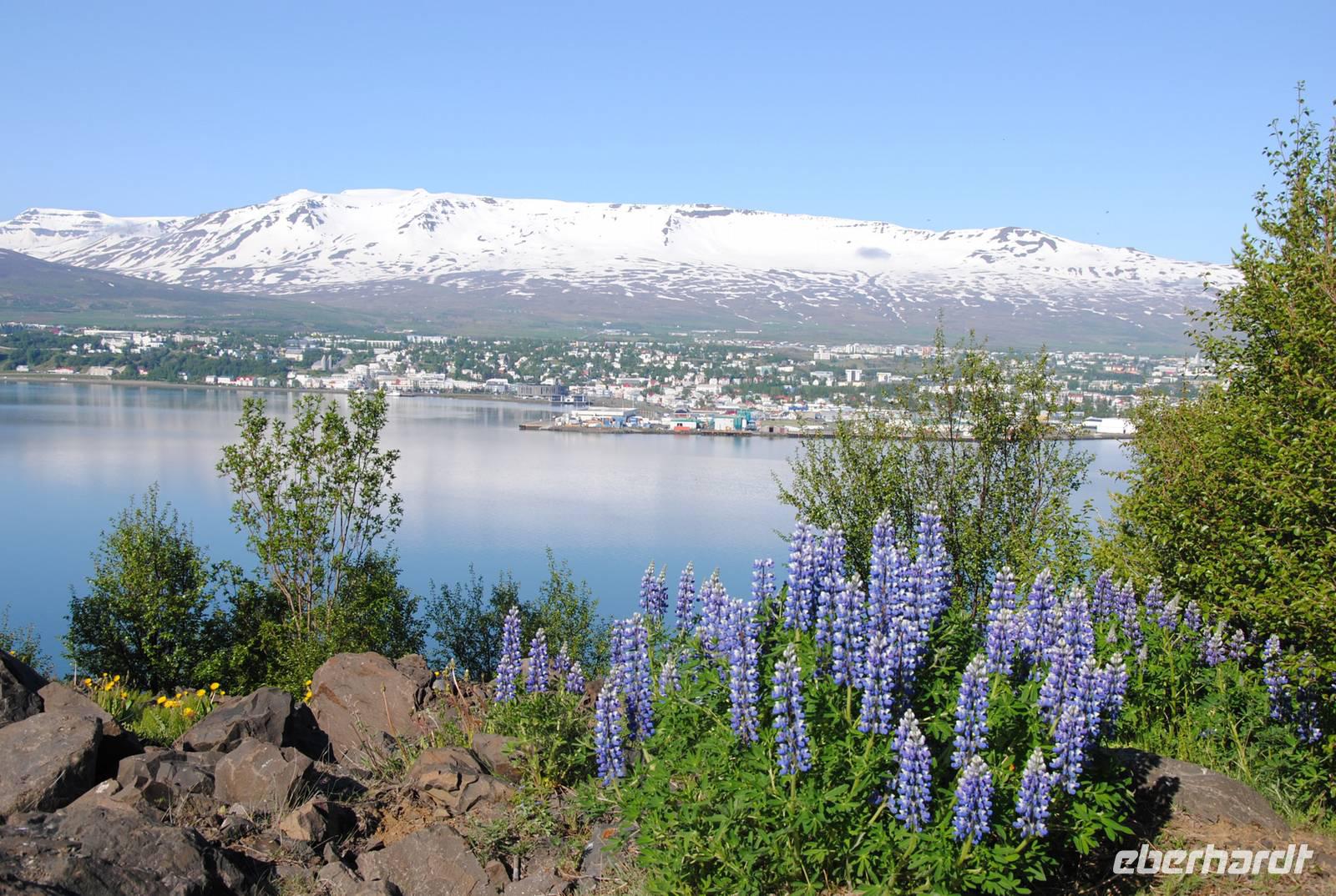 Am Ende genossen wir die Fahrt durch eine wieder abwechslungsreiche Landschaft. Dabei erzählte der Reiseleiter Geschichten über das isländische Volk und natürlich auch die Geschichten über seine Elfen und Trolle. Und schon waren wir am Endziel unserer heutigen Etappe in Akureyri. Die Stadt die am Ufer des weit ins Land hineinreichenden Fjord Eyjafjördur liegt wird auch die Hauptstadt des Nordens genannt. Hinter der Stadt erheben sich die manchmal noch schneebedeckten Berge und wenn man dann die gepflegten Gärten sieht vergisst man eigentlich die Lage, die ja nur einen Katzensprung vom Polarkreis entfernt ist.
