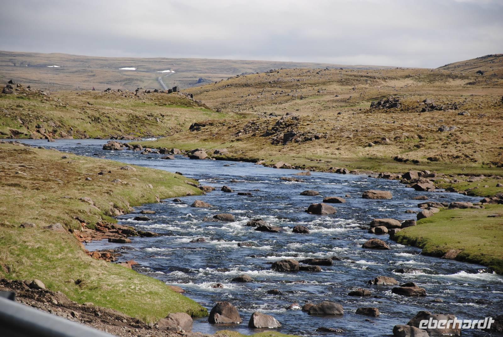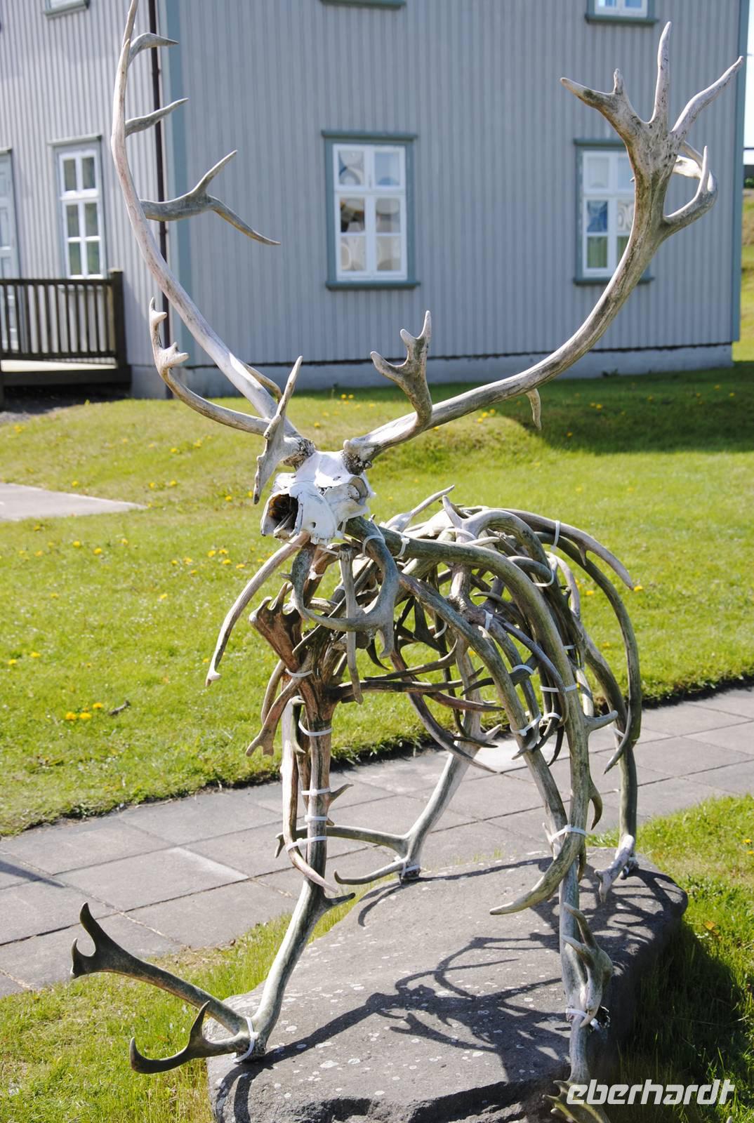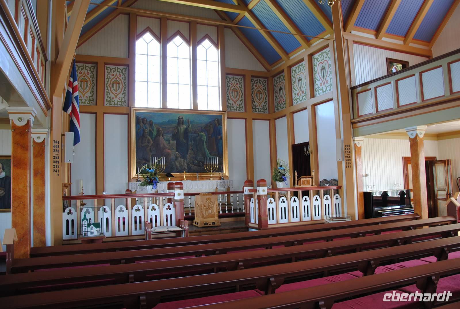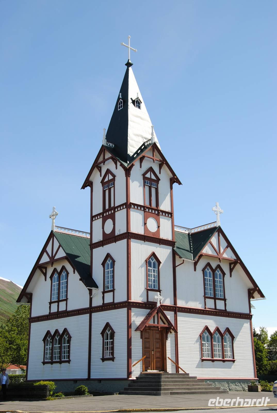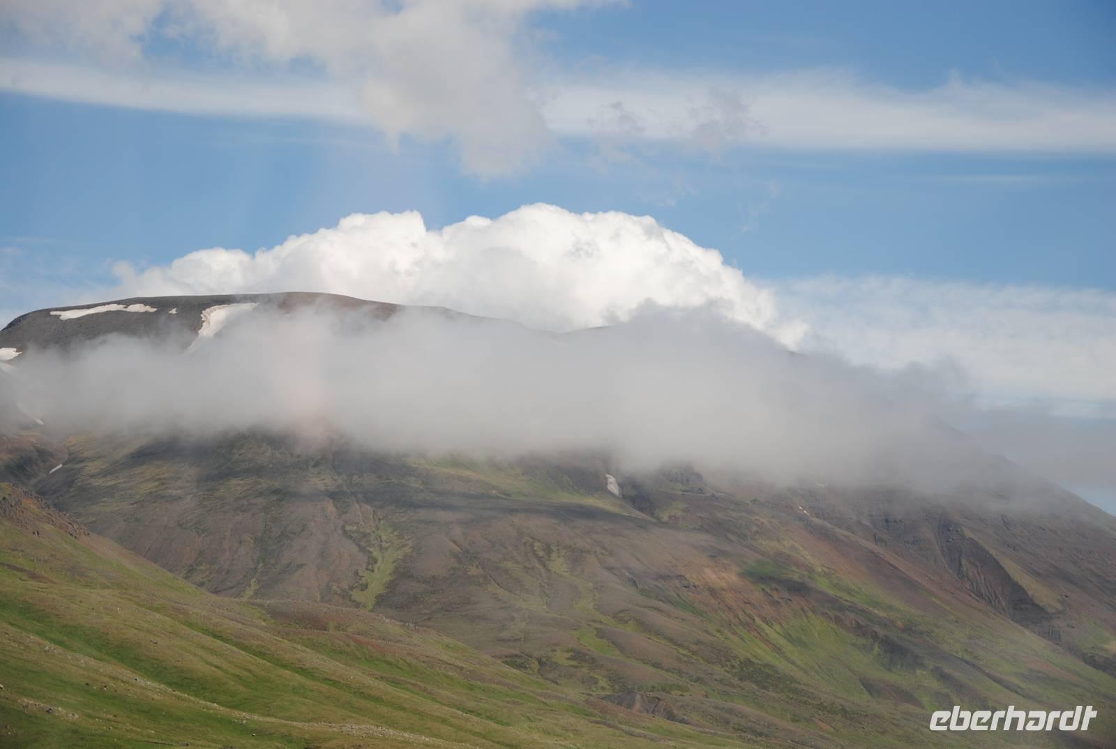 Am Ende genossen wir die Fahrt durch eine wieder abwechslungsreiche Landschaft. Dabei erzählte der Reiseleiter Geschichten über das isländische Volk und natürlich auch die Geschichten über seine Elfen und Trolle. Und schon waren wir am Endziel unserer heutigen Etappe in Akureyri. Die Stadt die am Ufer des weit ins Land hineinreichenden Fjord Eyjafjördur liegt wird auch die Hauptstadt des Nordens genannt. Hinter der Stadt erheben sich die manchmal noch schneebedeckten Berge und wenn man dann die gepflegten Gärten sieht vergisst man eigentlich die Lage, die ja nur einen Katzensprung vom Polarkreis entfernt ist.