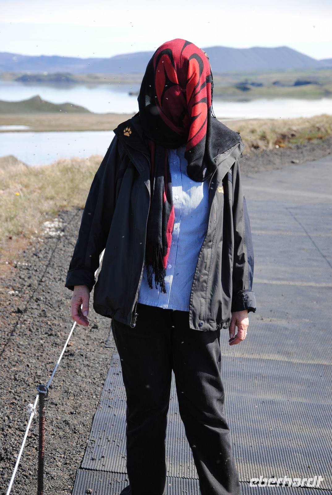Danach ging es zum Myvatnsee oder Mückensee. Dass dieser See seinen Namen verdient, merkten wir bereits beim Aussteigen aus dem Bus. Von unzähligen Mücken wurden wir begrüßt. Diese verfolgten uns auf der ganzen Strecke um die wunderschönen Pseudokrater in mitten eines herrlichen Naturschutzgebietes mit seinen zahlreichen Vogelarten.