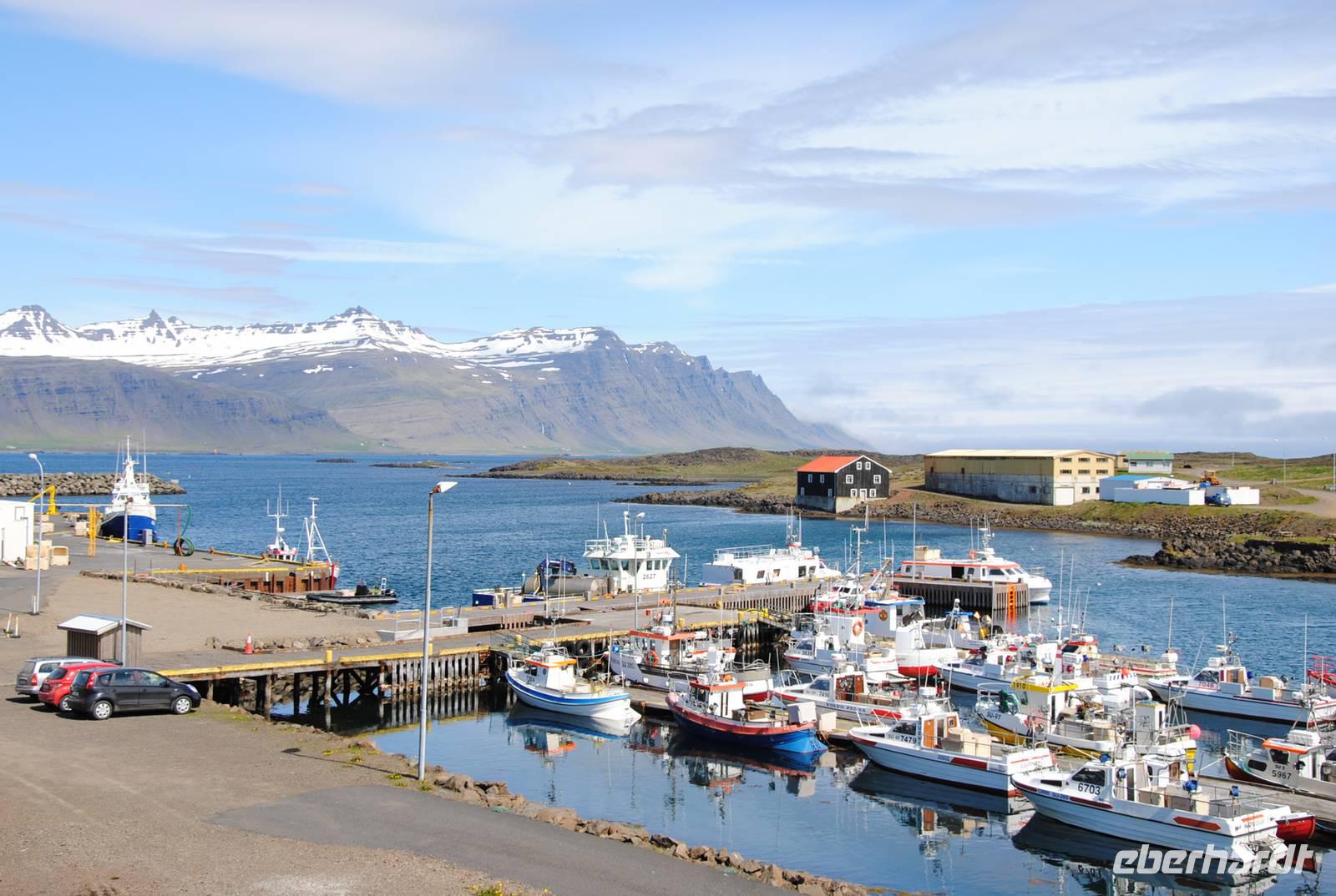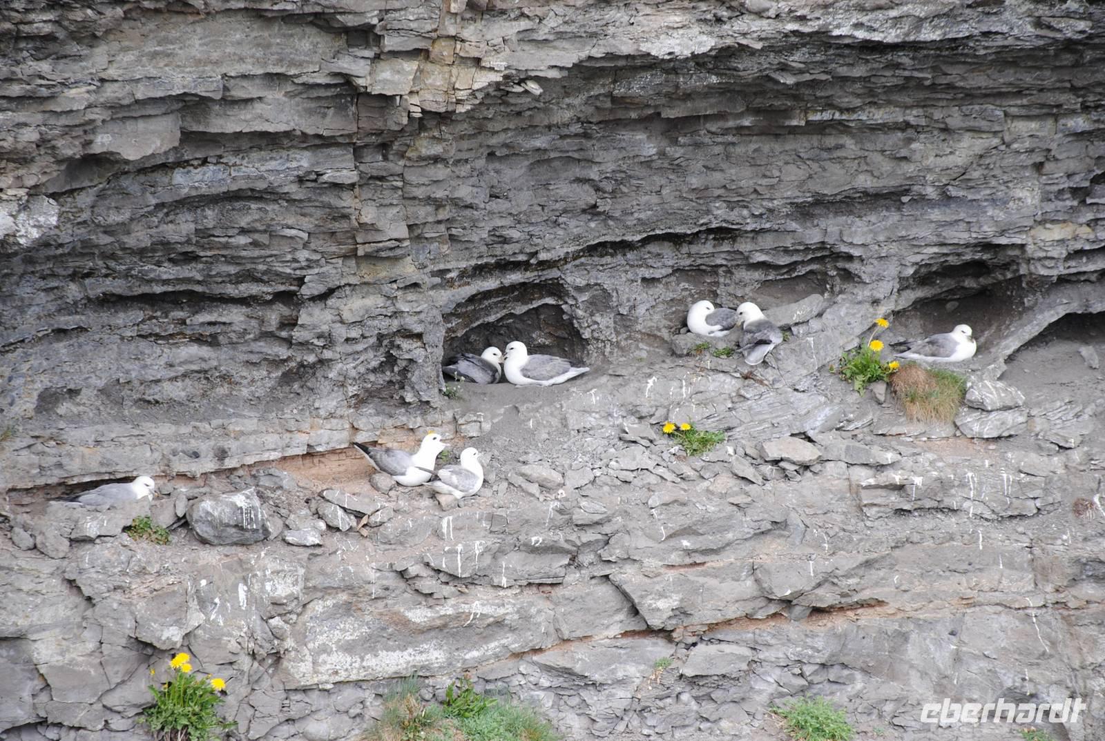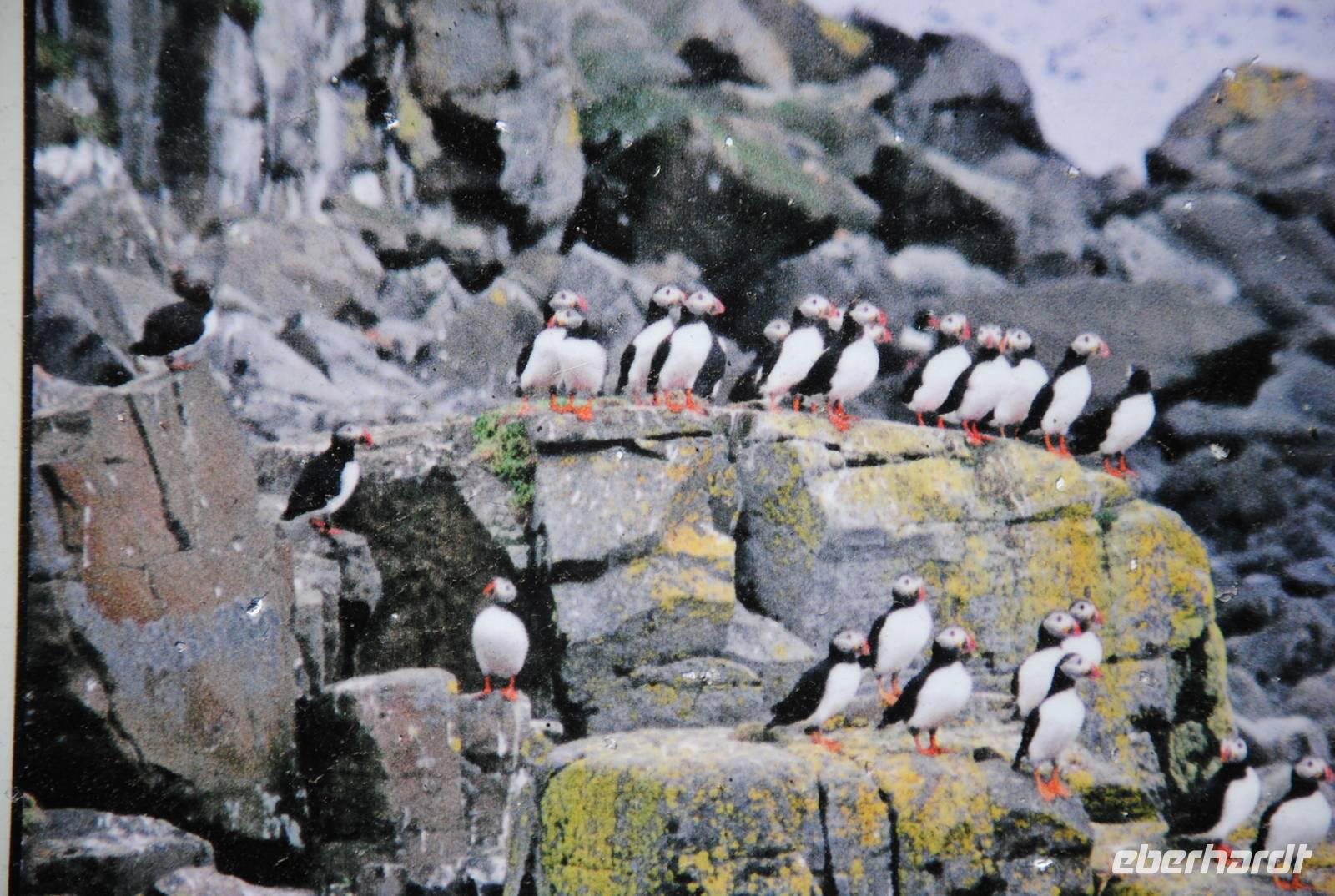 Von Mücken befreit ging die Fahrt durch herrliche Landschaftsabschnitte in Richtung Husavik. Dabei kamen wir auch über die Halbinsel Tjörnes. An steilen Klippen machten beobachteten wir den Kunstflug von Papageientauchern und Möwen. Im malerischen Fischerstädtchen Hùsavik angekommen war es gerade Zeit für die Mittagspause. Ob Gaststätte oder Kaffee jeder fand etwas um sich zu stärken und danach hatte jeder noch genügend Zeit für einen Bummel durch die Stadt. Am Hafen spazieren gehen oder einen Bummel durch die Ortschaft jeder nach seinem Gusto. Fotomotive bot er Ort genügend. Ob die herrlichen Berge als Hintergrundmotiv oder die kleine hübsche Holzkirche.
