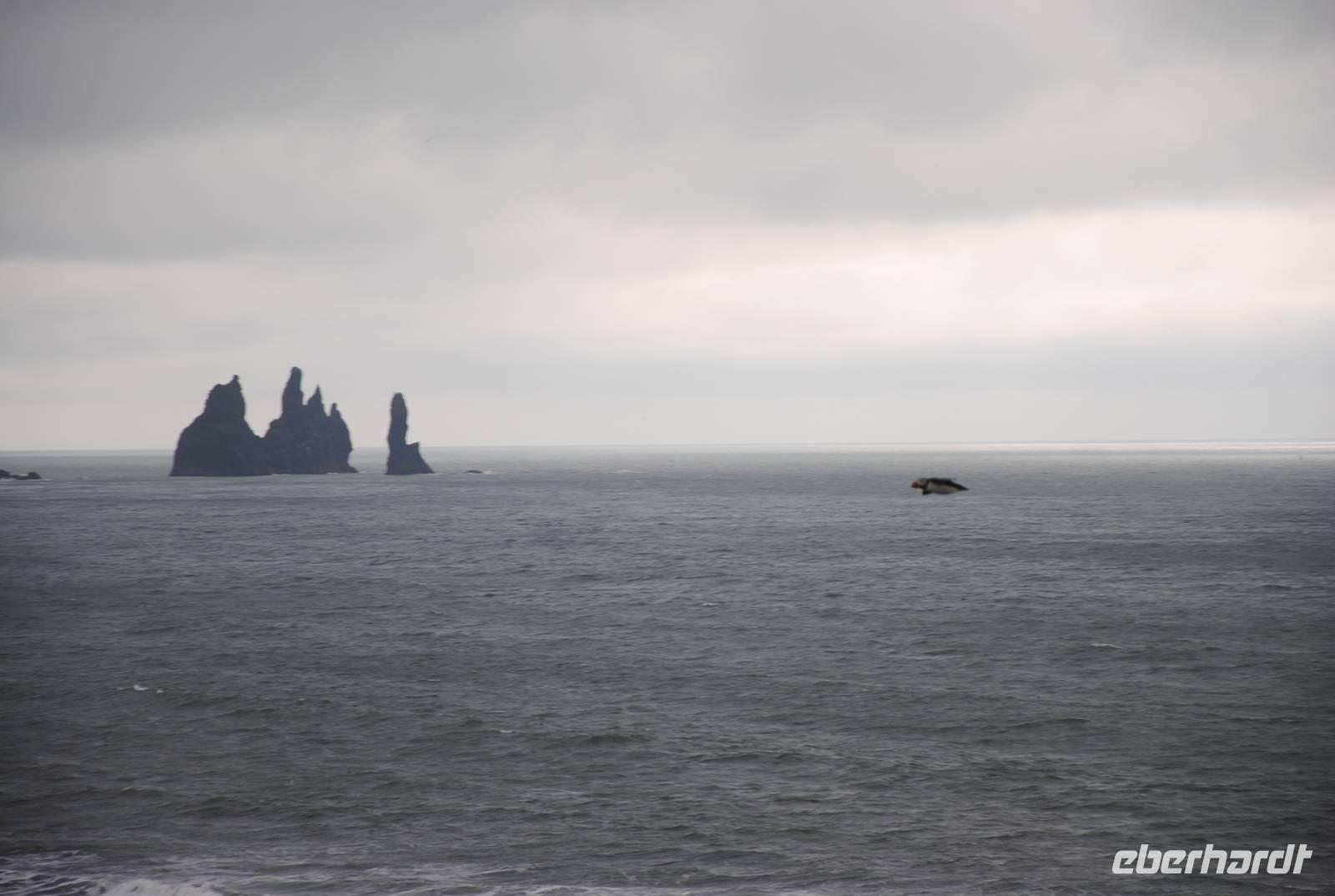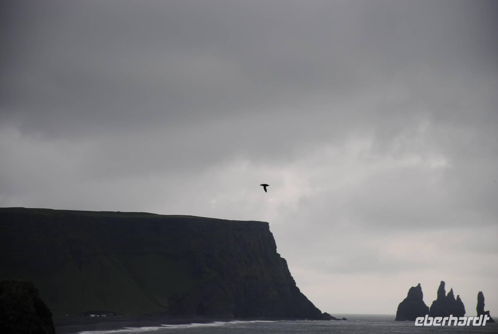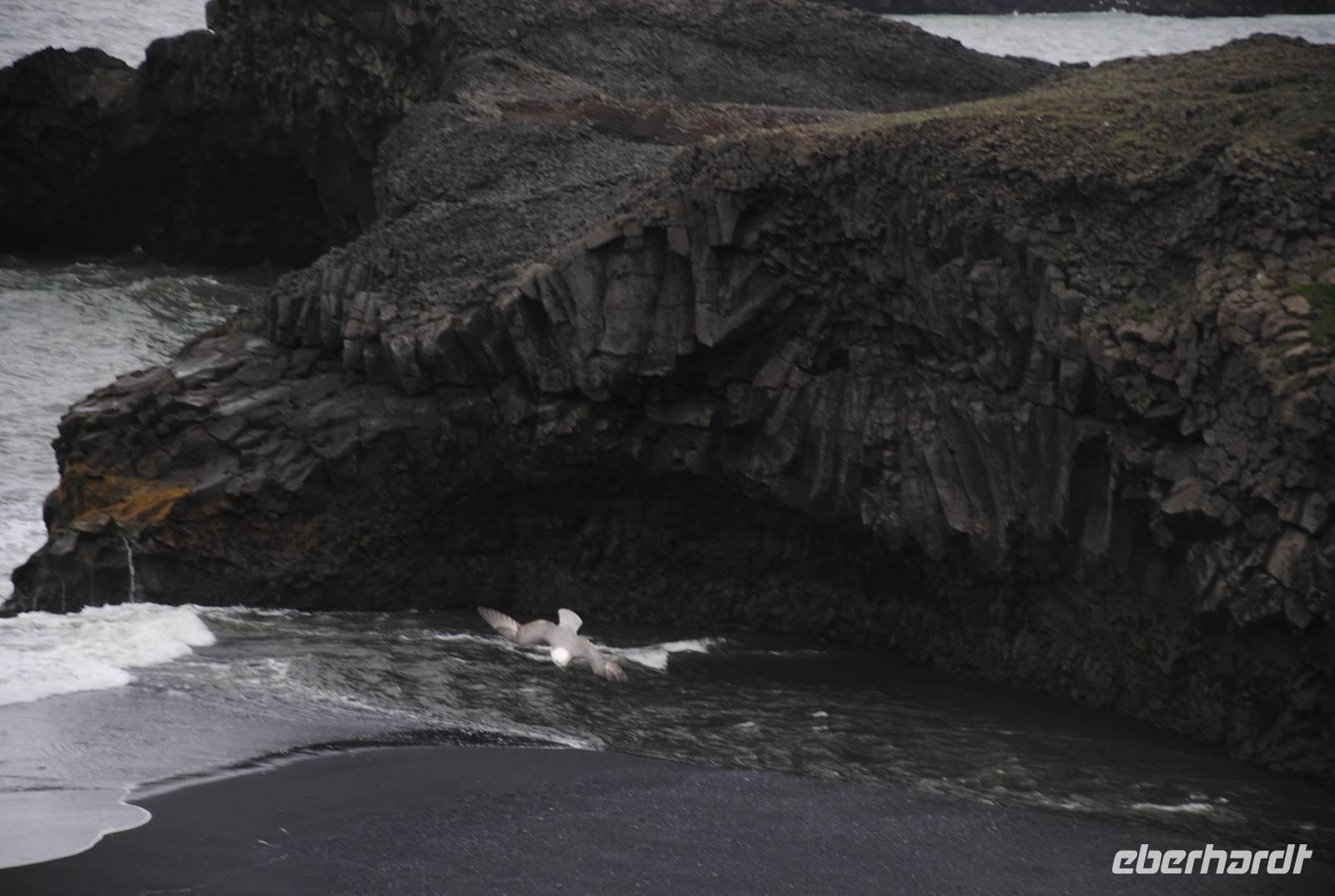Danach war unser nächster Stopp die Landspitze von Dyrhölaey, die zu den bekanntesten Fotomotiven Islands gehört. Nicht nur die Steilküste mit extremer Brandung fasziniert - nein auch die tausende von Seevögeln ob Möwen, Schwalben oder der schwarz-weiß gefiederte Papageientaucher. In den schroffen Felsen haben sie ihre Nistplätze. Mit Geduld und Ausdauer konnten einige schöne Nahaufnahmen vom bunten Treiben der Vögel erzielt werden. Wir bewunderten die beeindruckenden Basaltsäulen und am „Loch im Felsen" konnten wir den Dyhölaey am besten fotografieren. Ein wahres Postkartenmotiv.