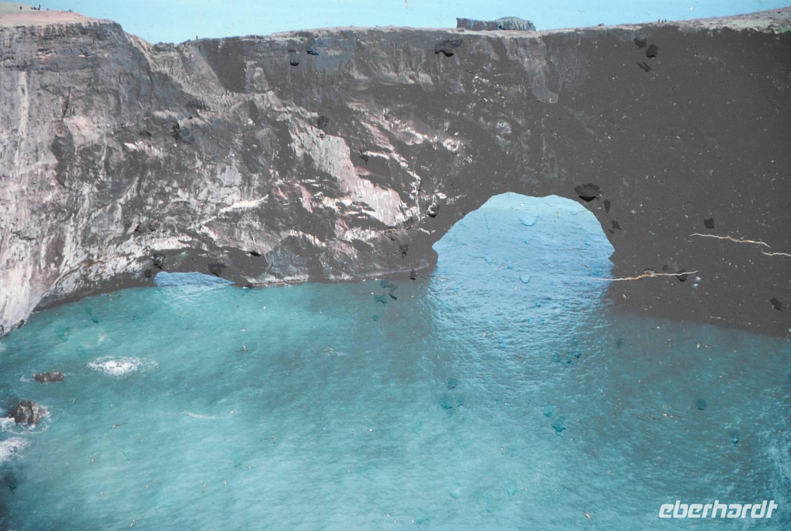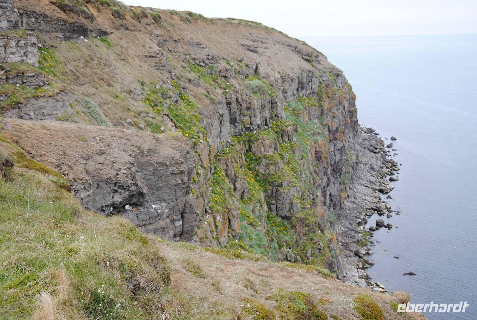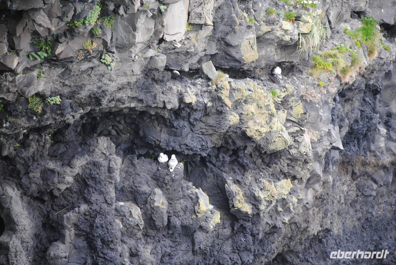 Danach war unser nächster Stopp die Landspitze von Dyrhölaey, die zu den bekanntesten Fotomotiven Islands gehört. Nicht nur die Steilküste mit extremer Brandung fasziniert - nein auch die tausende von Seevögeln ob Möwen, Schwalben oder der schwarz-weiß gefiederte Papageientaucher. In den schroffen Felsen haben sie ihre Nistplätze. Mit Geduld und Ausdauer konnten einige schöne Nahaufnahmen vom bunten Treiben der Vögel erzielt werden. Wir bewunderten die beeindruckenden Basaltsäulen und am „Loch im Felsen" konnten wir den Dyhölaey am besten fotografieren. Ein wahres Postkartenmotiv.