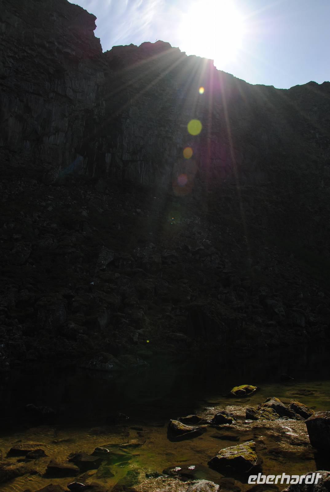 Der Nachmittag bot wieder ein Naturschauspiel. Die bizarren Felsschluchten von Asbyrgi waren unser Ziel. Unsere kleine Wanderung durch den Nationalpark endete am Teich direkt vor der Kulisse von hohen Felswänden. Diese luden zu einem gemeinsamen Gesang von deutschen Volksliedern ein. Mit vielen Eindrücken ging es dann wieder zurück zum Hotel.